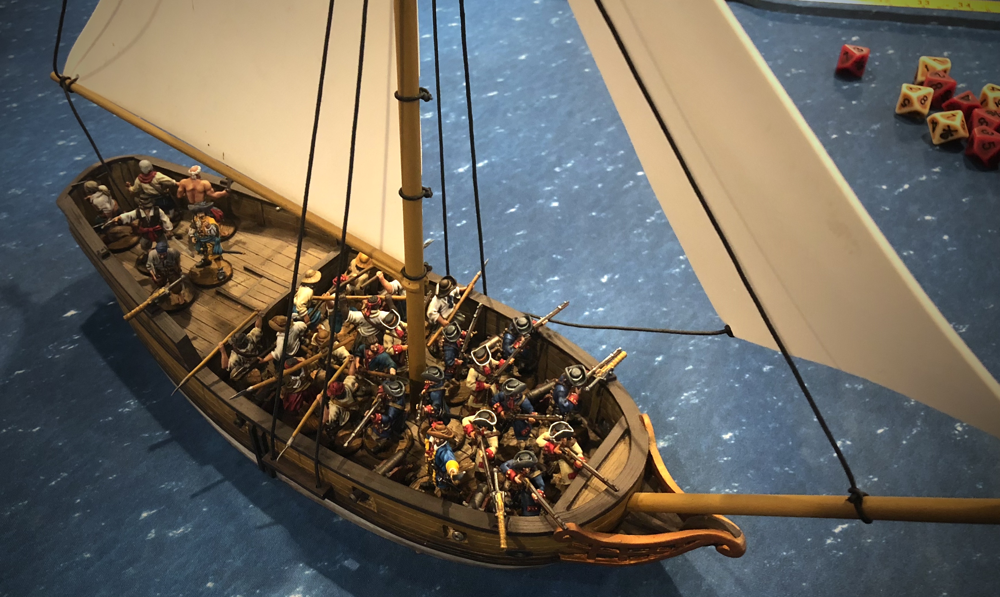 The 5 Marineros in my rear deck made a plucky charge against the 20 Dutch who had just killed their commander and after miraculously surviving the Enter Ploeg’s defensive pistols, they drove both units back to their own ship.
