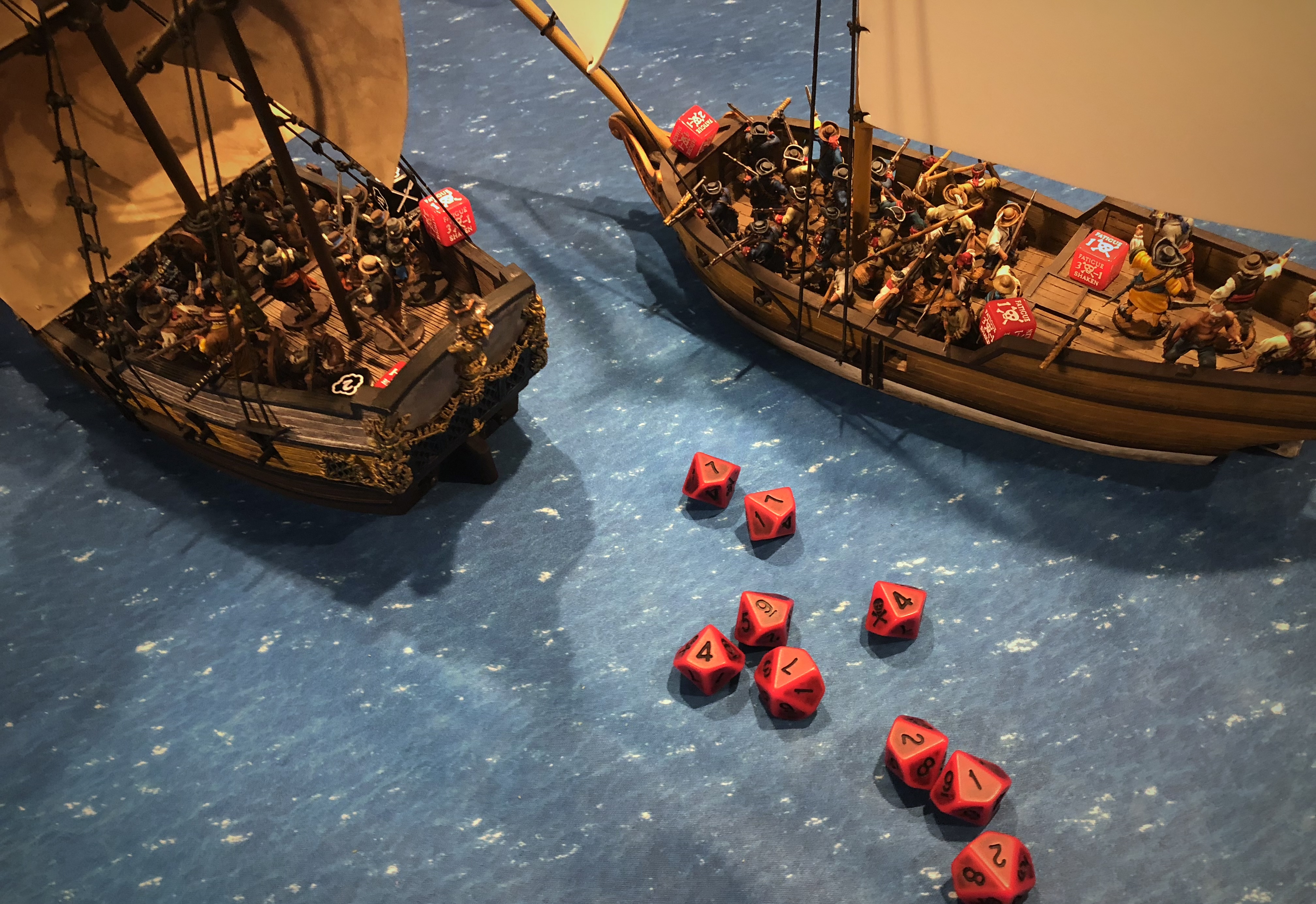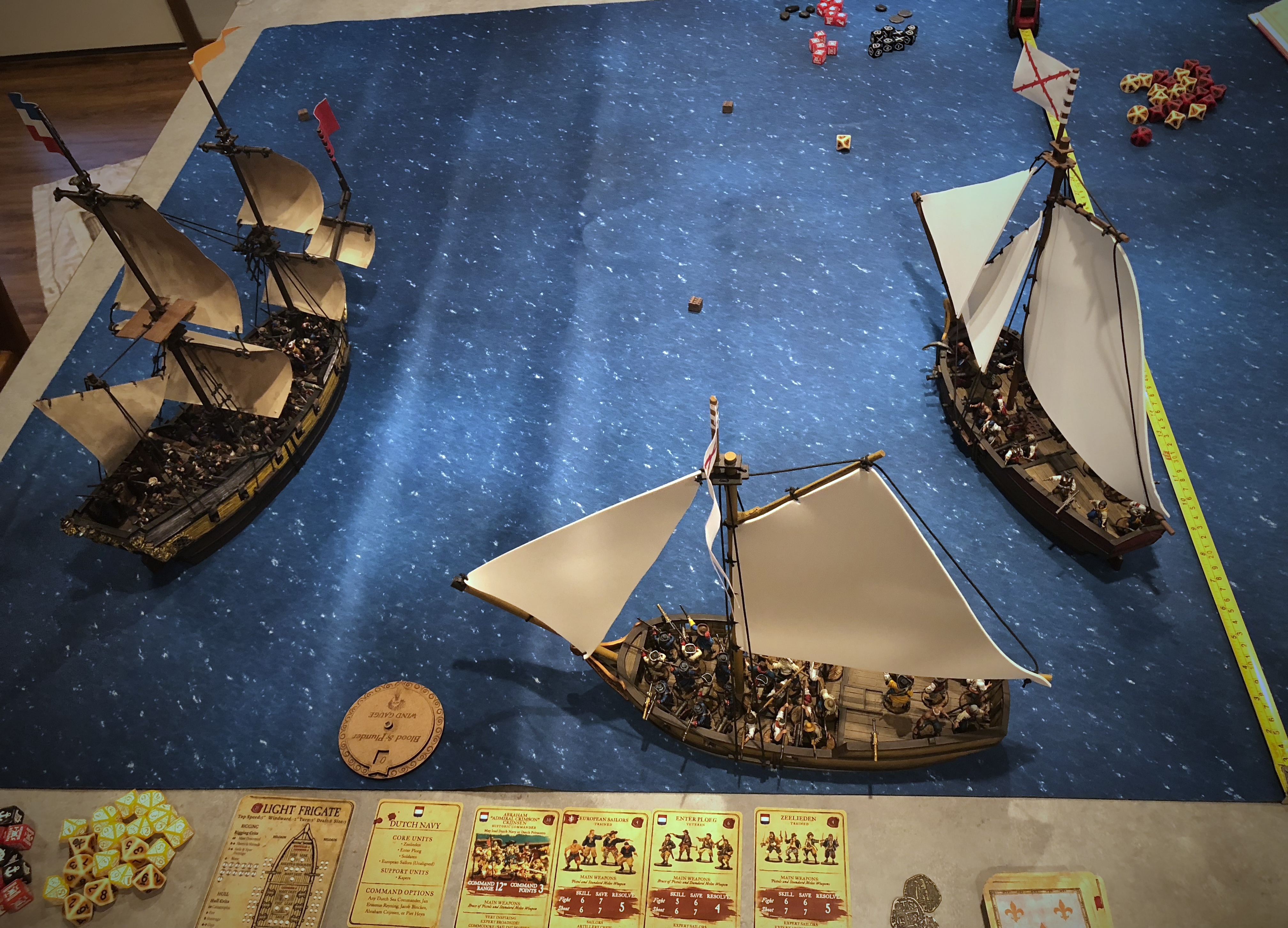 I made a mistake here and rolled 3 dice per cannon instead of 2 after my ranting shot. I had just fired Grapeshot from the other side and they roll the full 3 dice so I carried that over. My (cheating) cannons got 14 hits and I thought this would secure the victory for me but the Dutch got some solid save rolls and only lost 7 men. The commander’s unit routed but Bryan spent a Fortune to transfer Admiral Crimson to the mid deck Zeelieden. We applied a lucky hit and 2 critical hits for 7 hits vs 3 fortitude but looking back I think we should have applied 4 critical hits since each hit counts as two when firing a raking shot. The game might have gone differently if we had done this all correctly, but the resulting destroyed gun, Leak and Fire was very satisfying. I think we forgot to apply Heavily Built to that shot as well… Its easy to forget things when you get excited!
