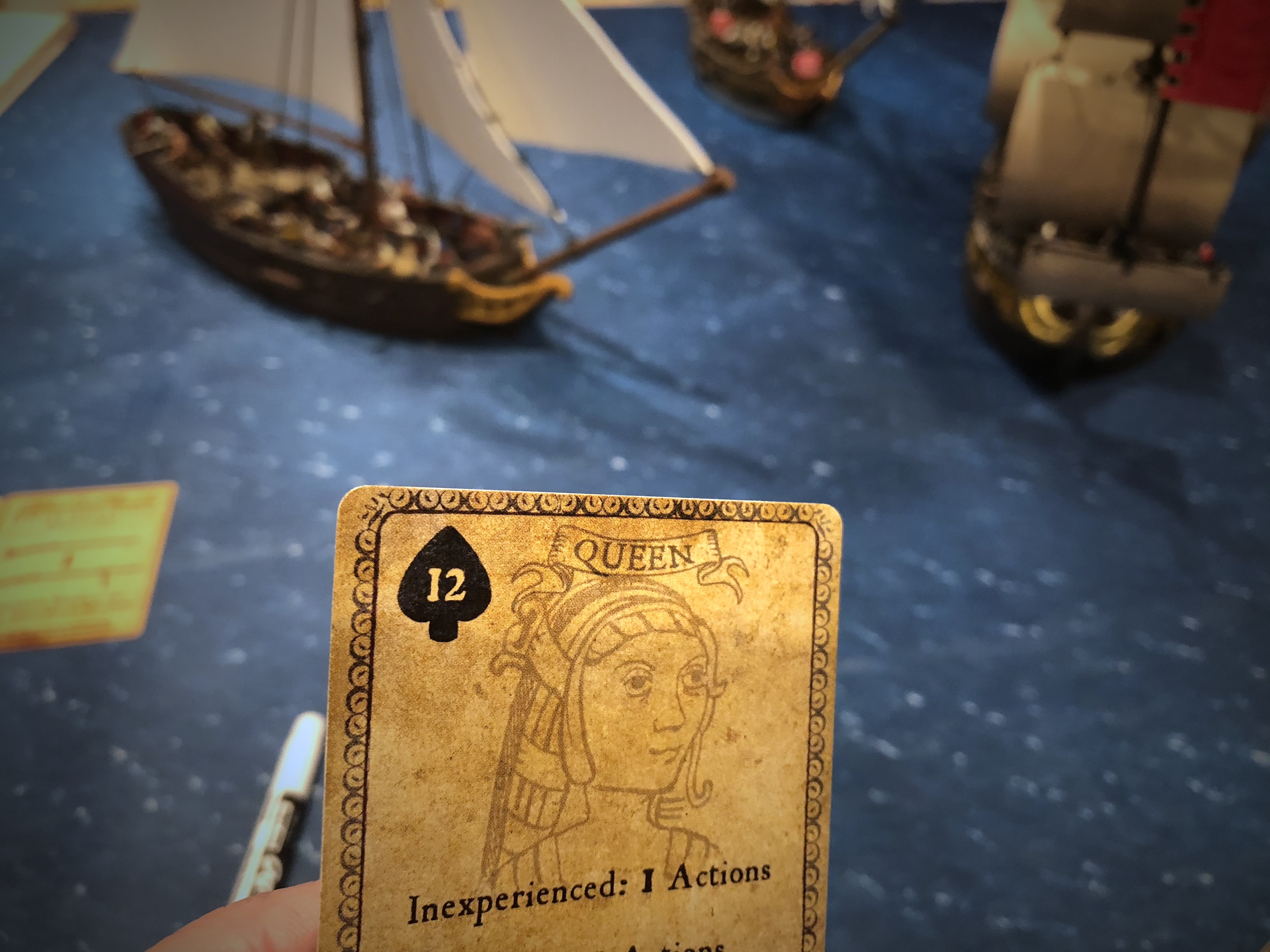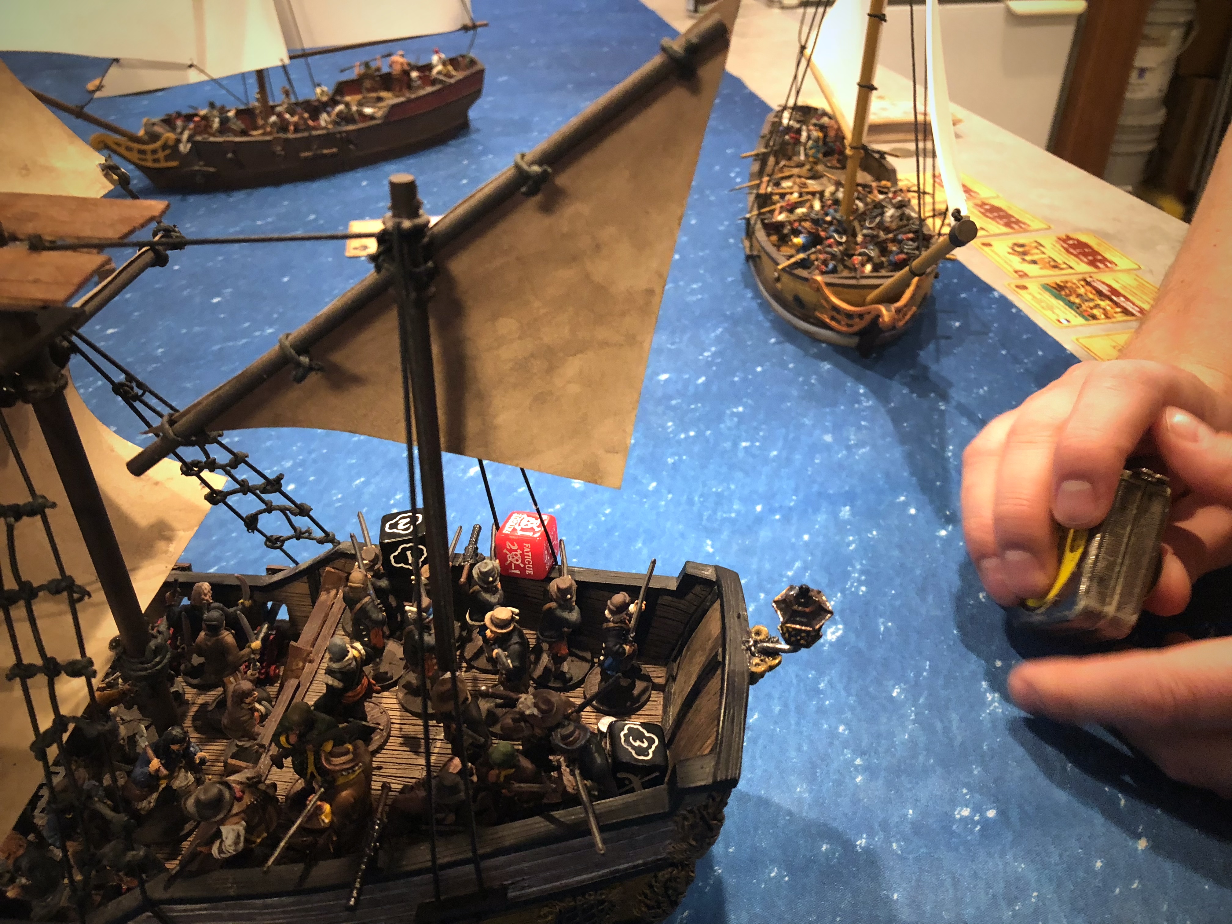 I bid low with a club for my opening card and Bryan bid high. We started within cannon and musket range and he fired off his cannons and 3 units of European Sailors with muskets. At that range he was looking for 9-10 with the cannons and 10 with the Muskets and the entire volley didn’t produce much damage but it did get on hit and some Fatigue on my Soldsdos. I shot off 2 swivels with the Soldados and did some damage to the 2 units in the back of his ship.