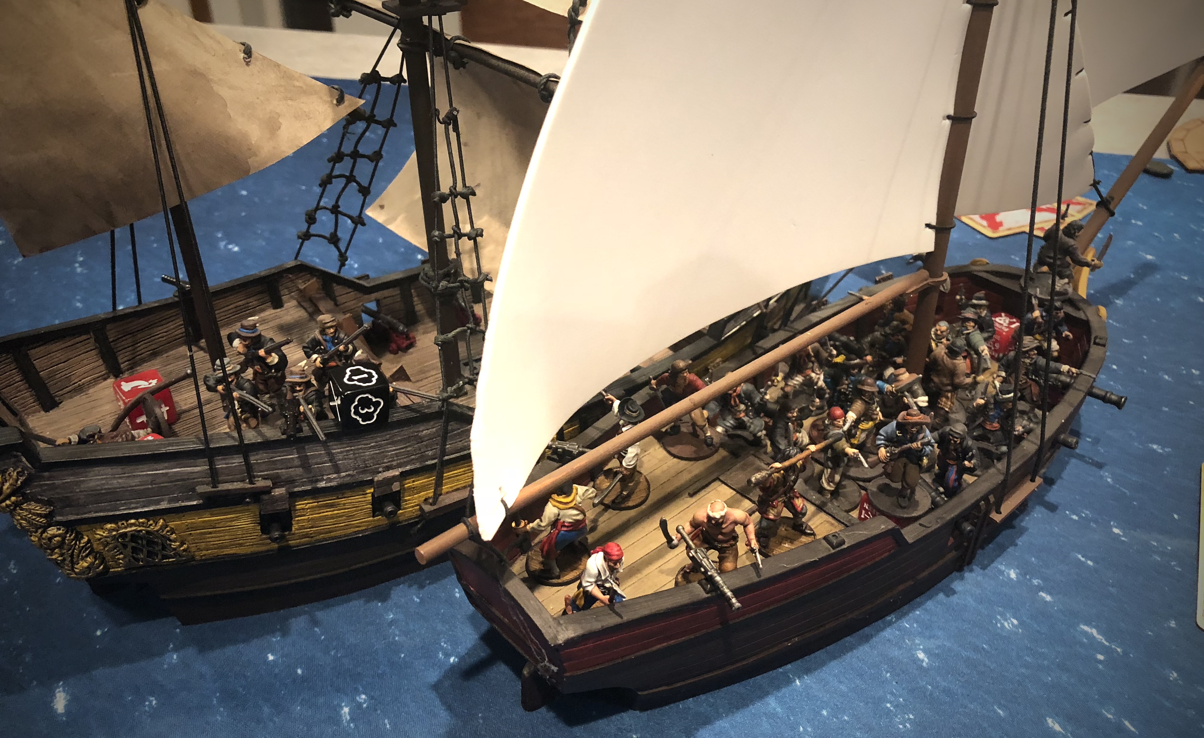 We deployed in a 4’x4′ area as the scenario suggested with the wind at our backs. Our deployment zones were 8″ from the corner. I set up my Gun Sloop as far away as I could and set up the Privateer Sloop so it could close with the Frigate as quickly as possible.