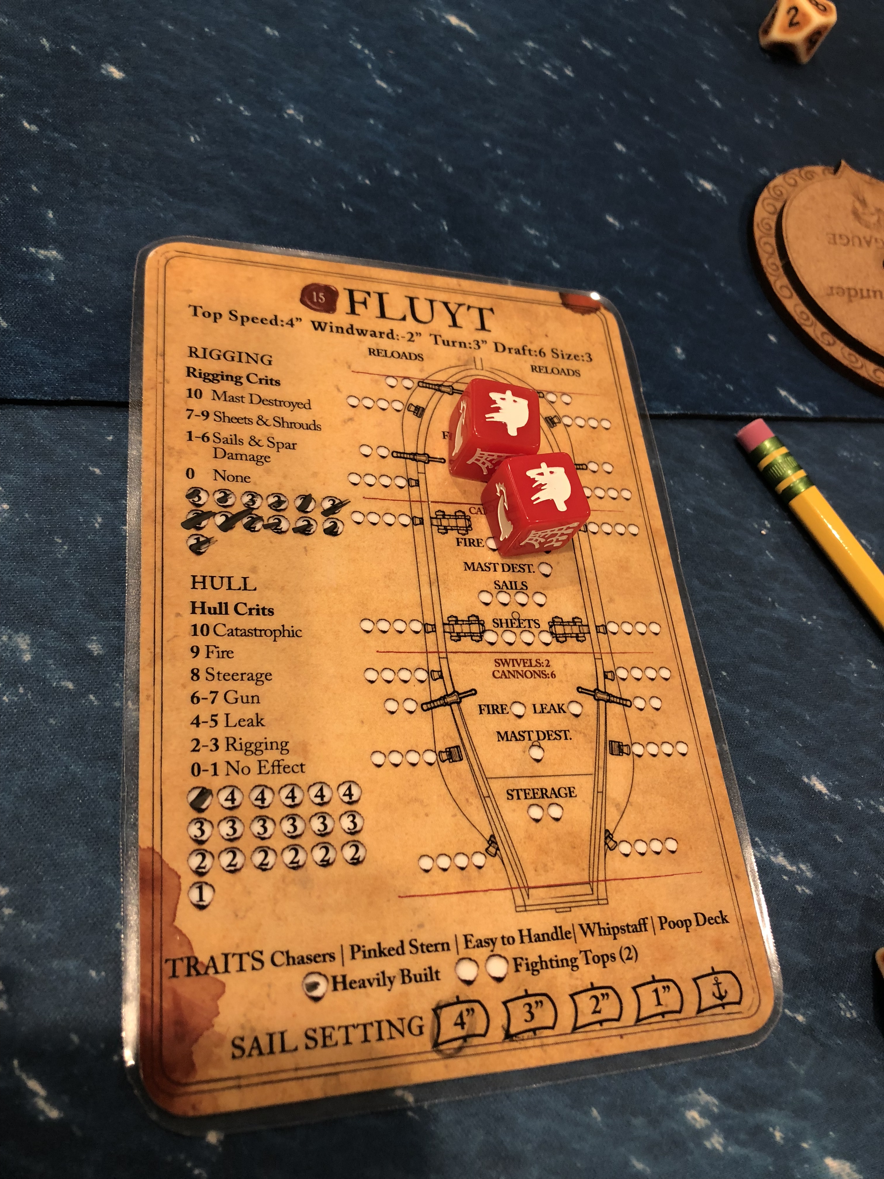 As soon as I turned upwind my ship slowed to 1″ per move until I was able to increase my sails to 4″ again. The Fluyt feels like a tub when sailing upwind!