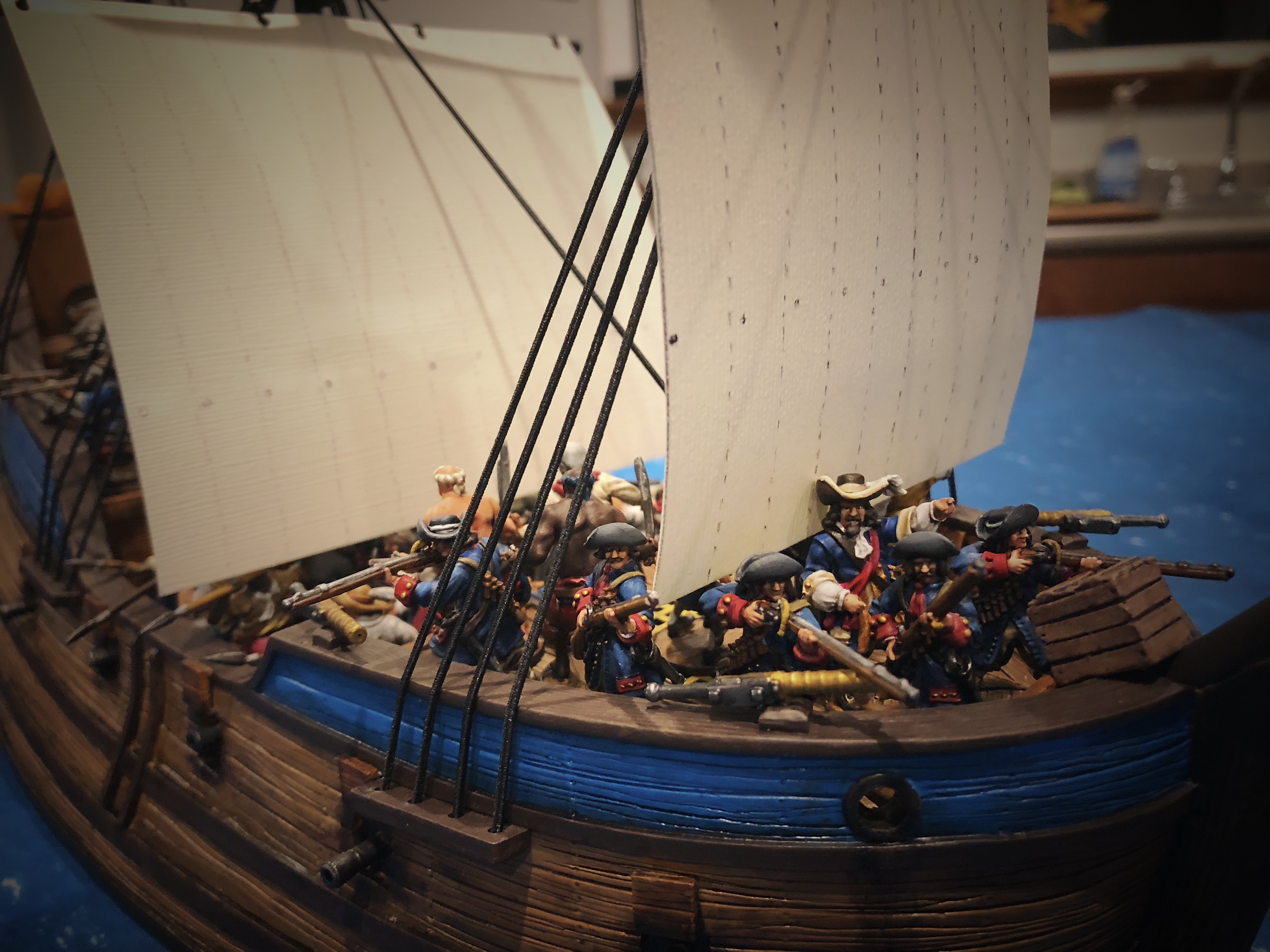 Guy ran a Light Frigate with 5 guns and 4 units. The front deck had a massive unit of 15 Trained Milices de Caraibes with an Officer, the middle deck contained 12 Veteran Marins with Buccaneer Guns and a Master Gunner and the back deck held two units of 8 Marins, one with the Commander, Master Gunner and a Standard Bearer and the other assigned to Sheets and Braces with a Sailing Master. An approximation of his list can be found here.
