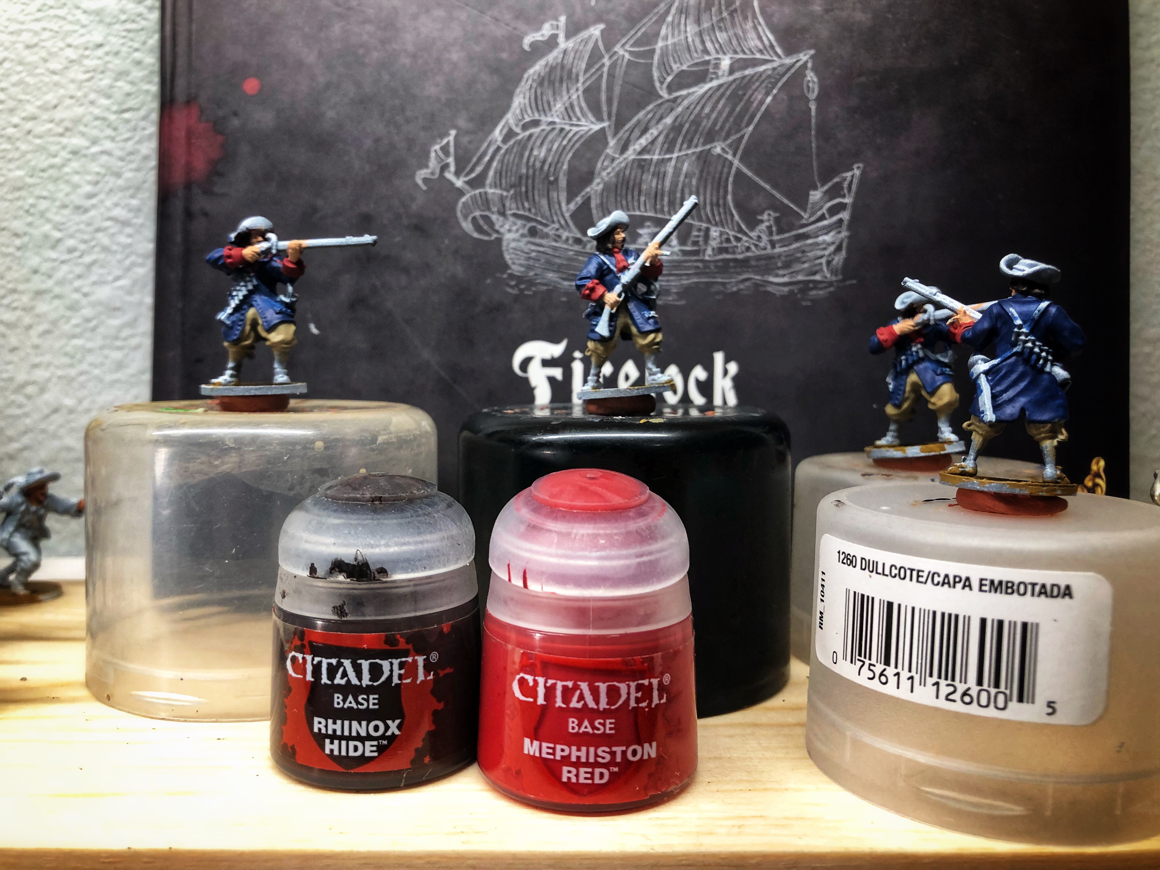 I put down a layer of Citadel XV-88 on the bases. Next comes the coats and trousers.