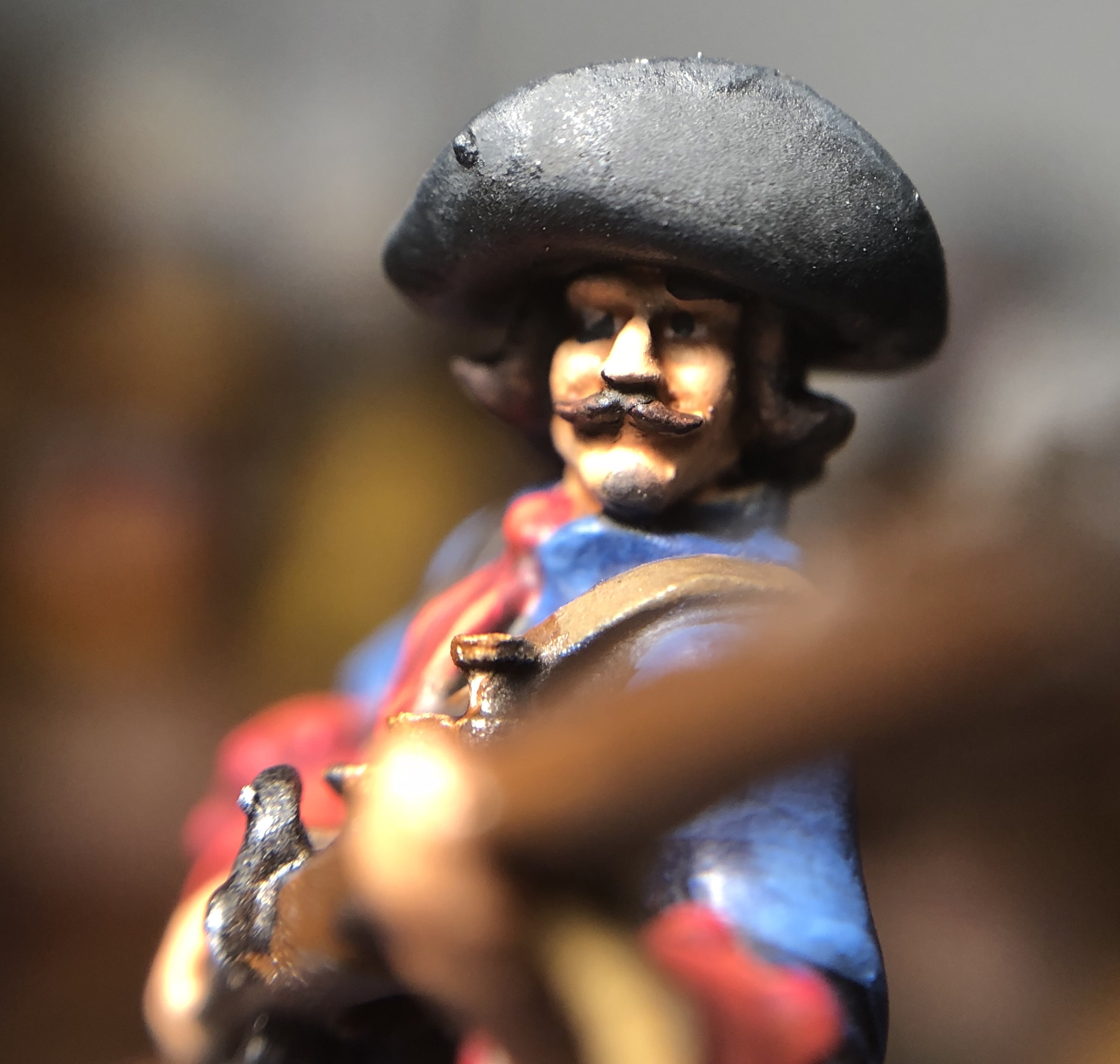 Highlighting the metallic is fun! I reapplied Vallejo Metal Color Steel and then mixed increasing amounts of Duraluminium into the steel for the musket, power flask, sword hilt and scabbard tip.