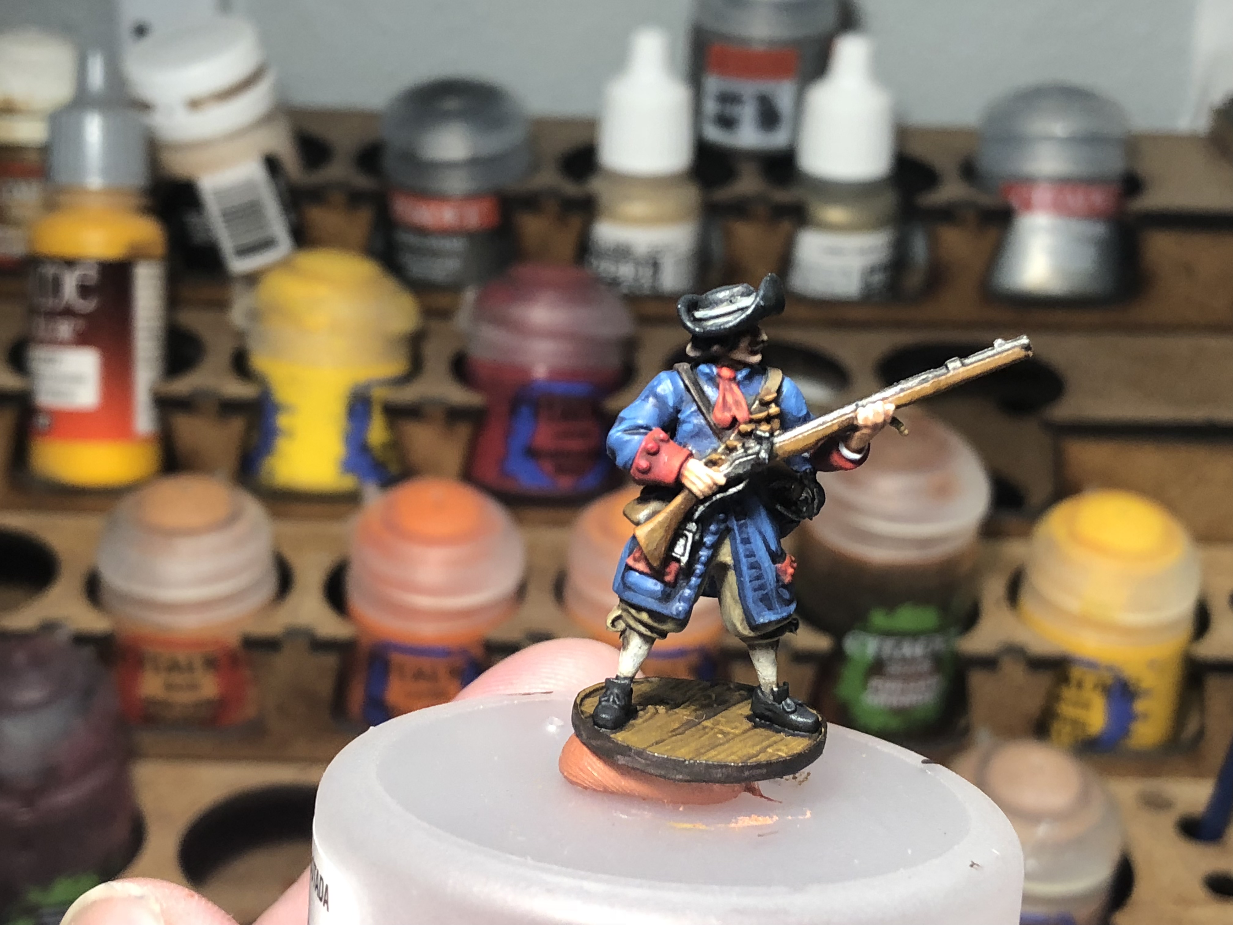 Next I’ll touch up any eye issues with the base fleshtone and highlight the hands and face with Midlund Flesh followed by a final layer of Ryn Flesh. I find the P3 paints easy to layer so I didn’t bother using my wet pallet or blending the tones for smooth transitions. I just hit the prominent areas with Midlund, then traced the fingers, put dots on the finger tips of the L hand hold the musket and hit the nose, chin and cheekbones of the face with Ryn Flesh.