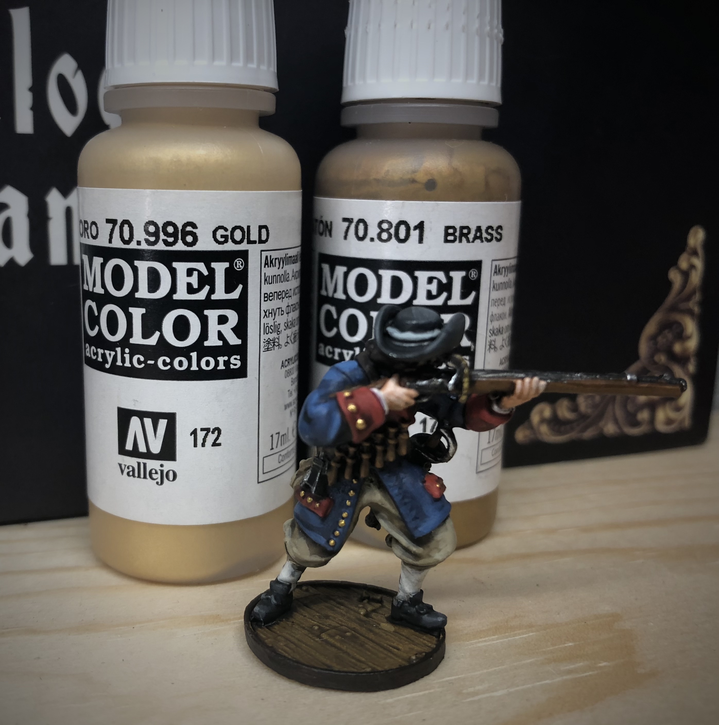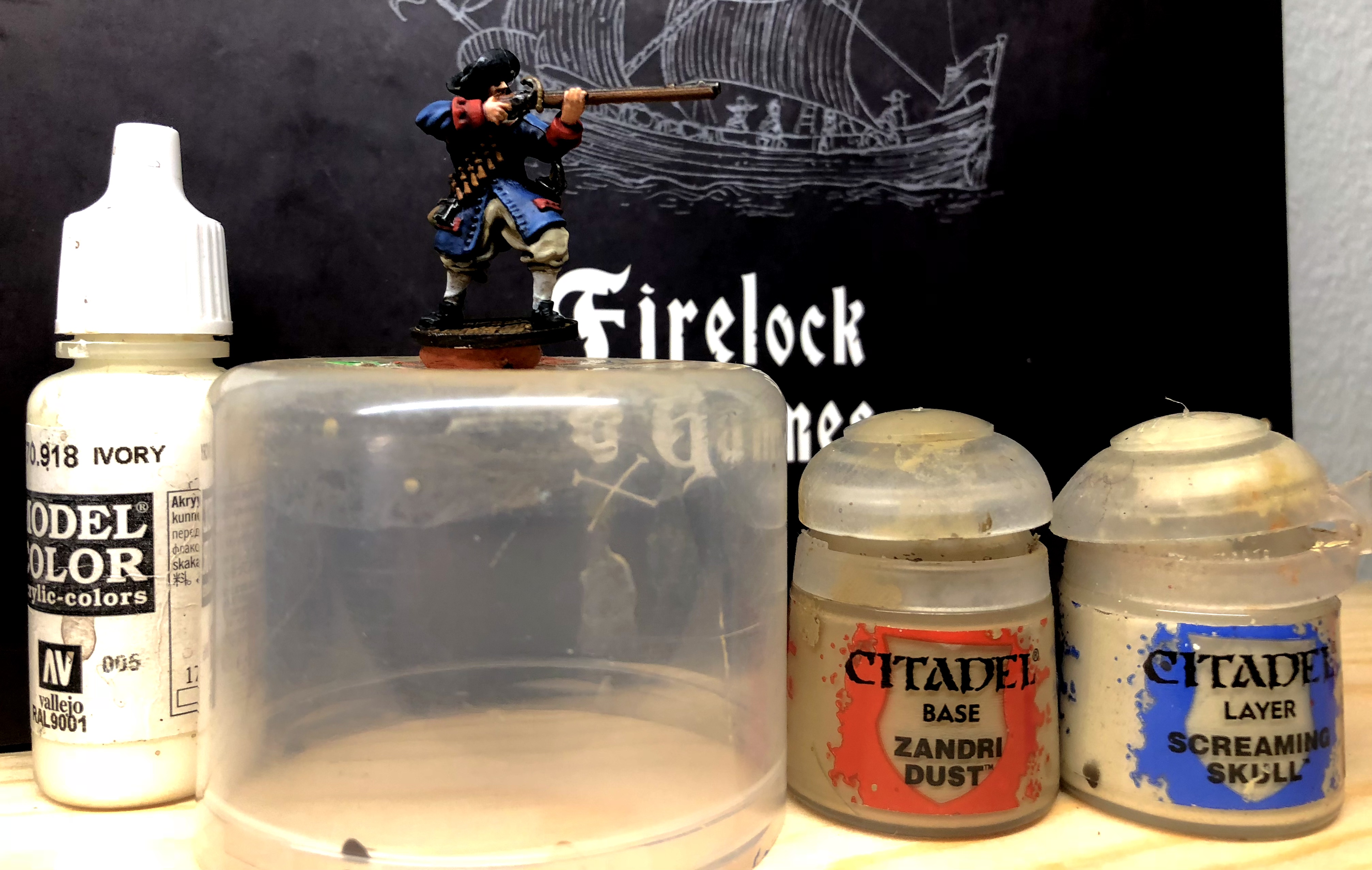 - Agrax Earthshade will cover the base, hair, musket stock and the brown straps and bag.