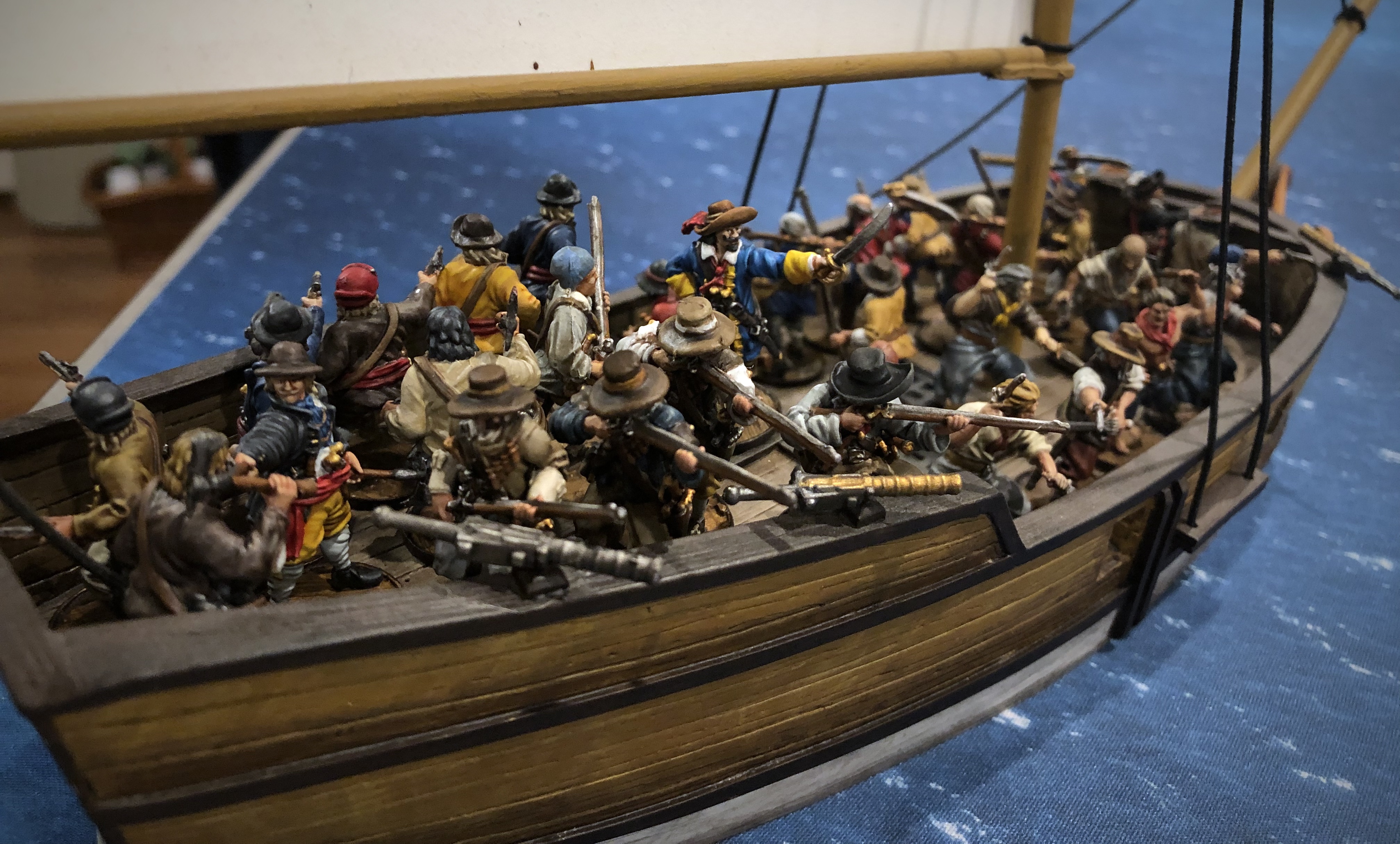 I brought an Untested Commander attached to a group of 8 Forlorn Hope with Grenados and a Sharpshooter. The other unit in my front deck was 8 Sea Dogs with a Sailing Master and no pistols assigned to the 2 Swivels. My rear deck had a small group of 5 Freebooters and a unit of 9 Enter Ploeg with 2 Firepots, 2 Blunderbuss and a Reformado assigned to the four Swivels. I tried to balance my long range a short range units on both decks so either deck could fire muskets or board as necessary. Since I aimed to catch and board my enemy, I used the Privateer Sloop (with no cannons).