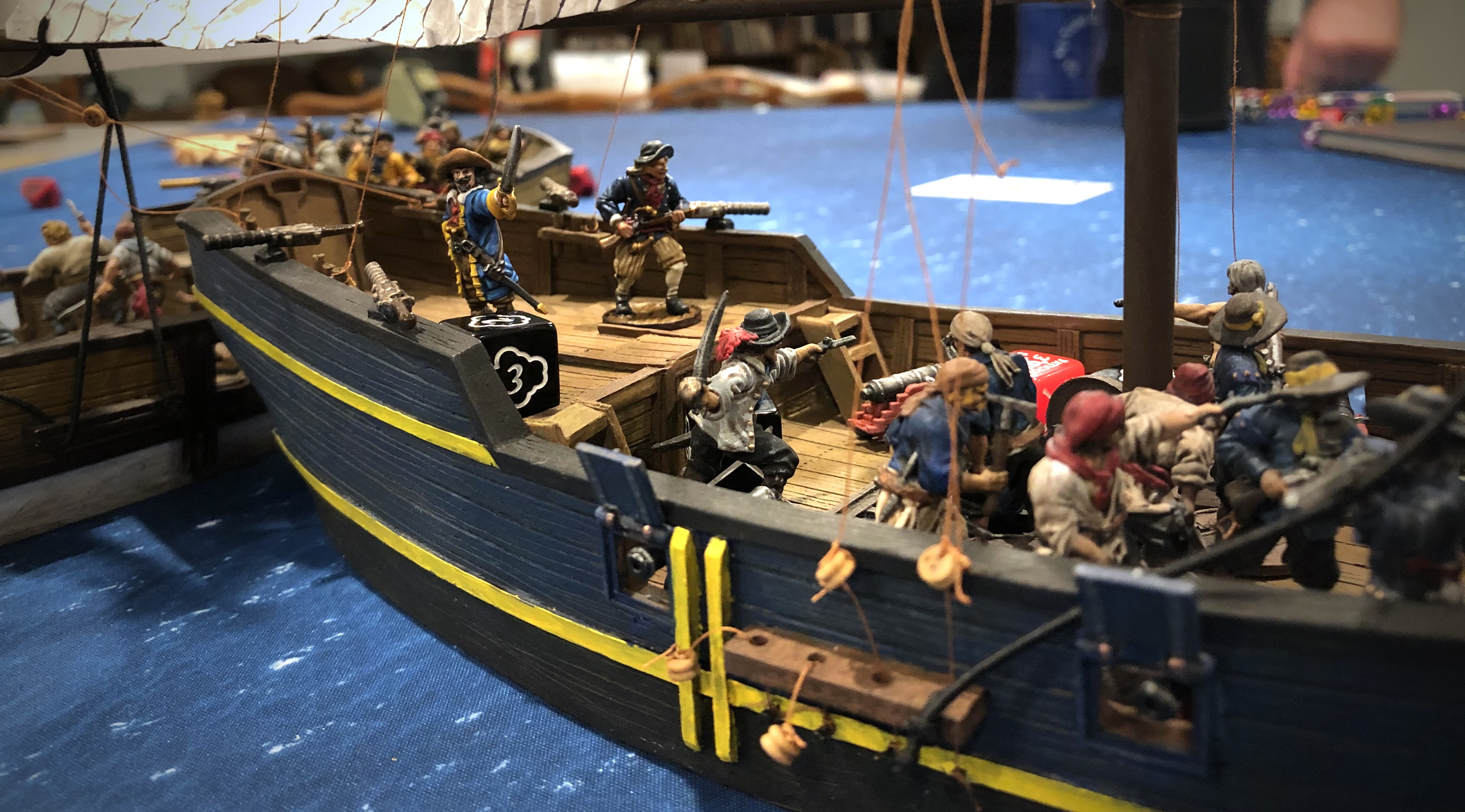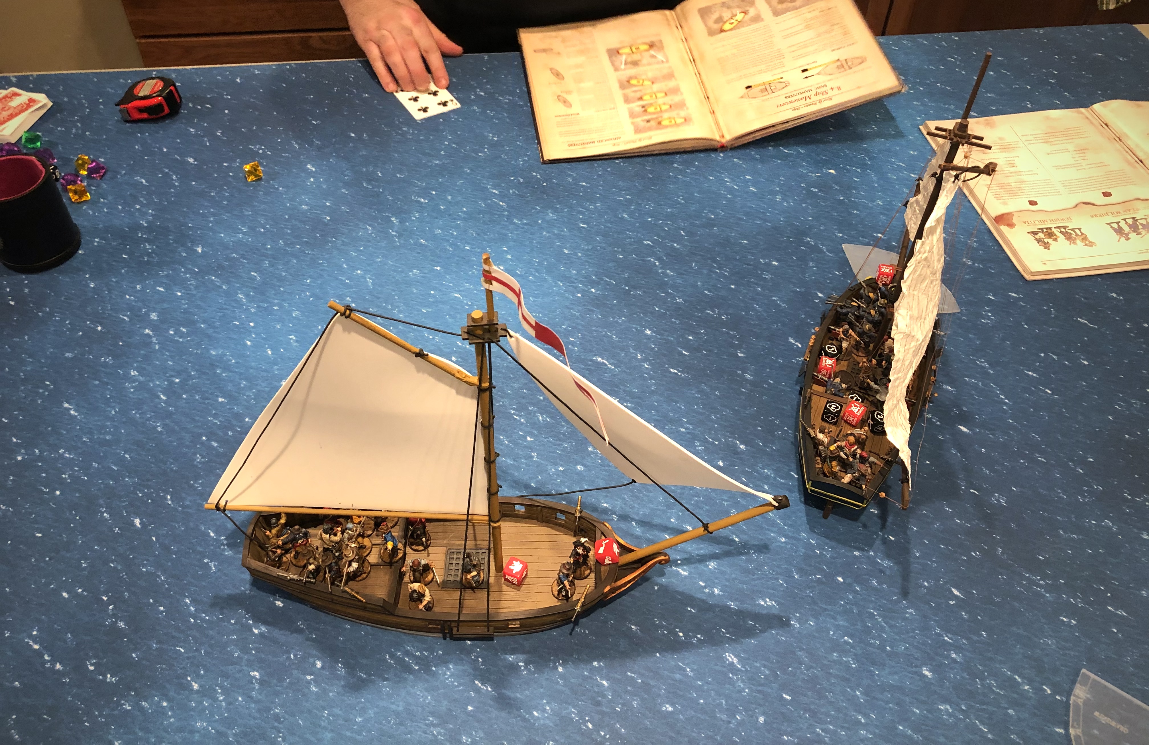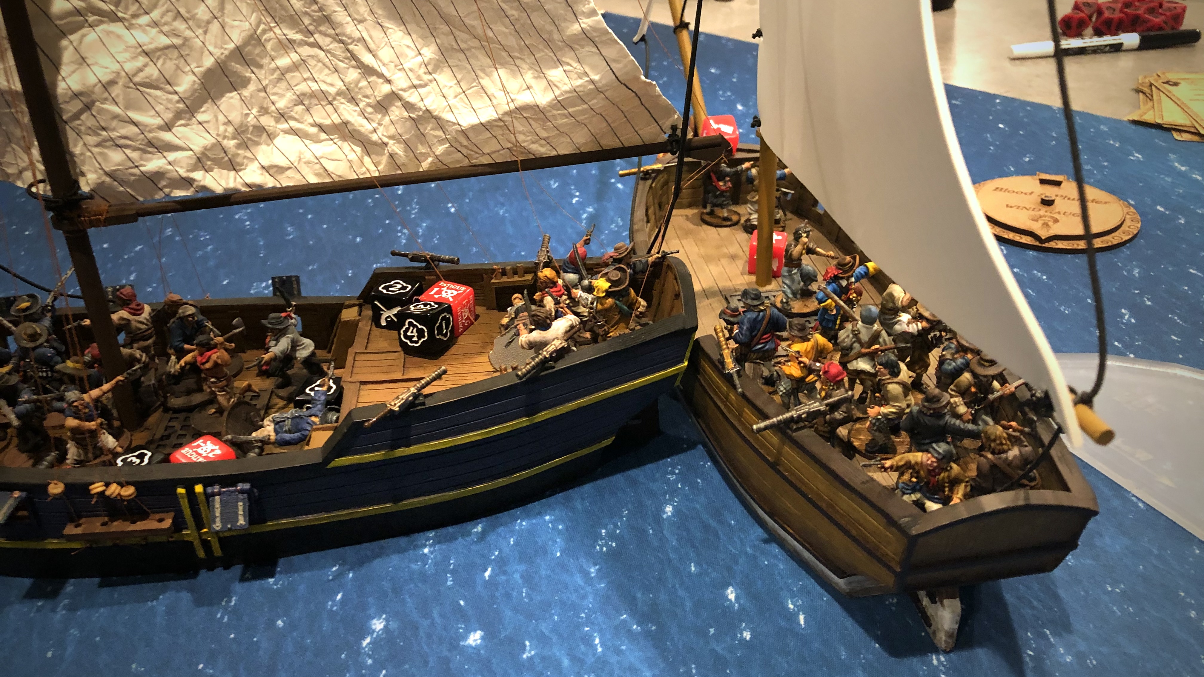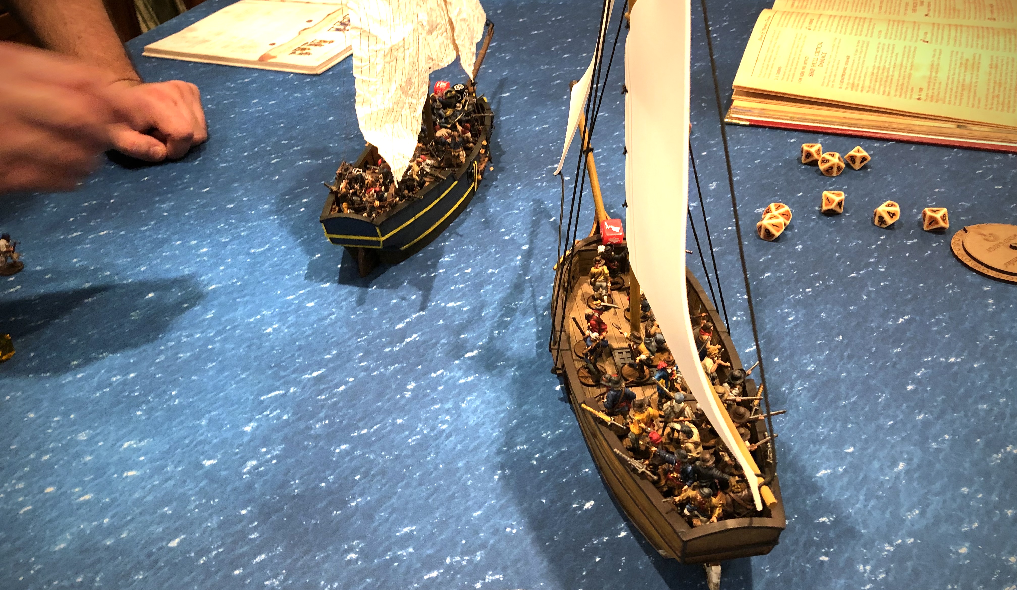 - This was a very “cinematic game.” Between all the random critical hits on my ship, the crucial bids for initiative, the raking shot, some insane dice rolling (good and bad), the charge over the prone Portuguese commander, the brutal Militia volley and the deadly grenades, there was no lack of drama!