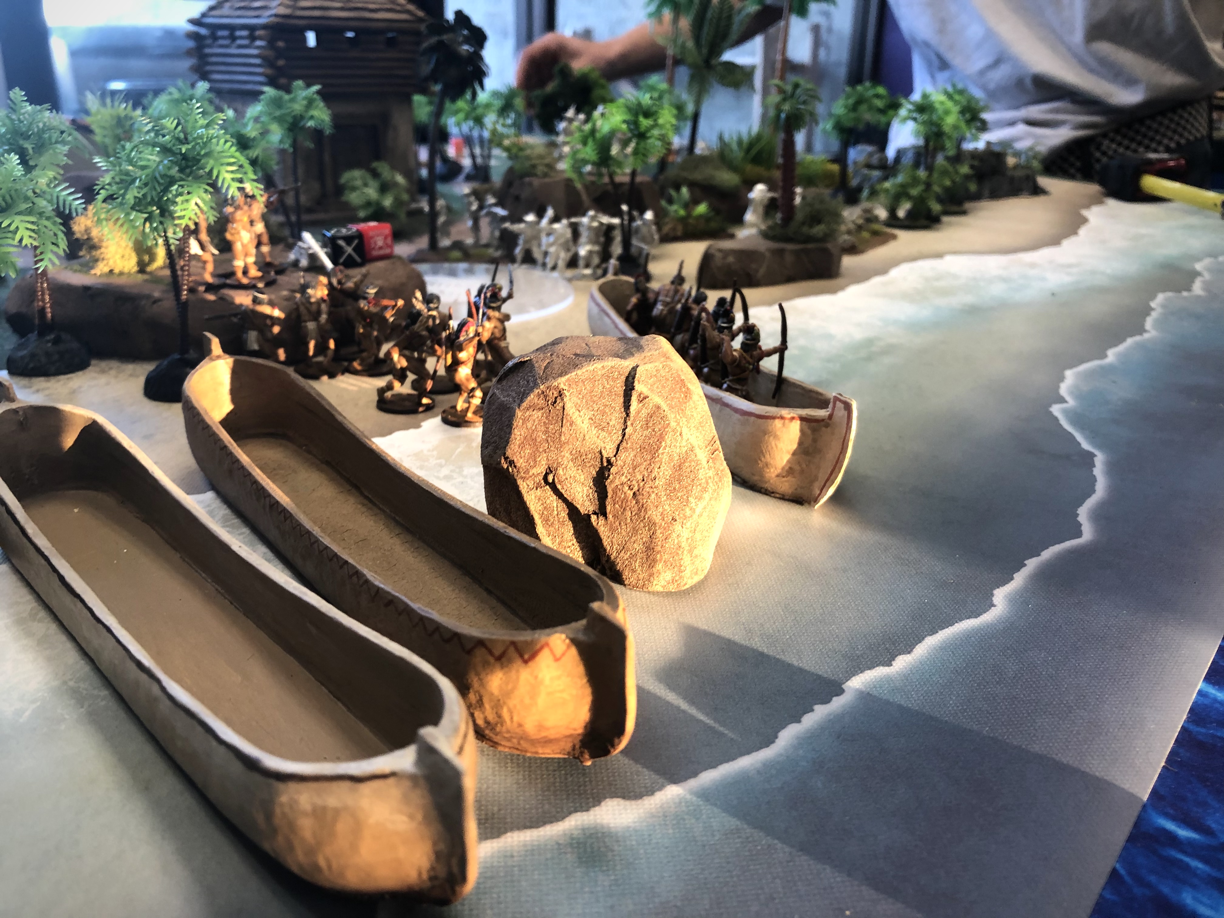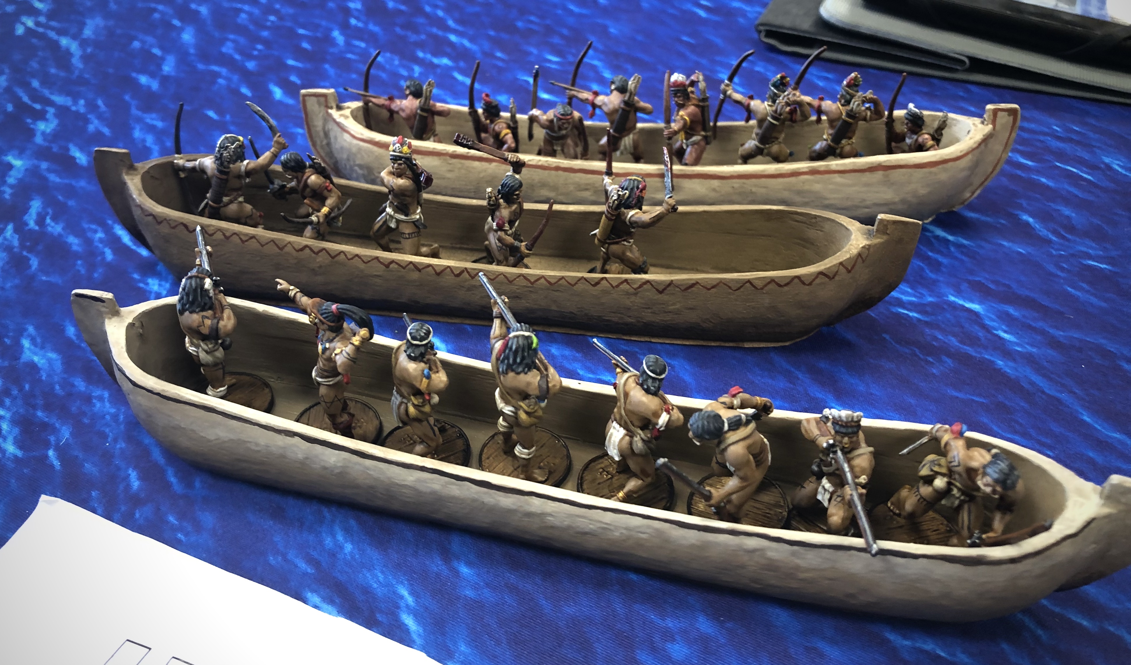 My list had a unit of 7 Warrior Musketeers, a unit of 5 Warrior Archers with a Grizzled Veteran, and a unit of 8 Young Warriors in 3 Canoes.