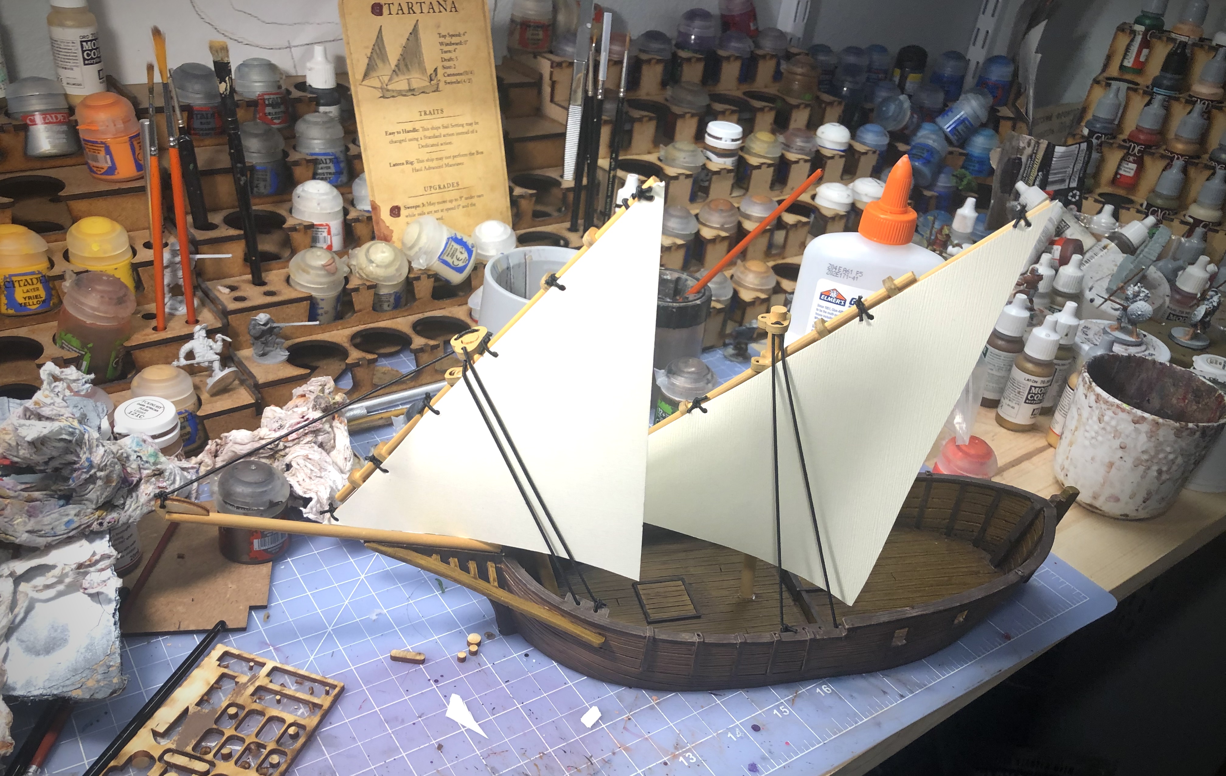 My rigging tools. I used a heavy texture scrapbook paper for the sails this time. It’s easy to work with but isn’t stark white like the sheets of thin foam that I’ve used before.