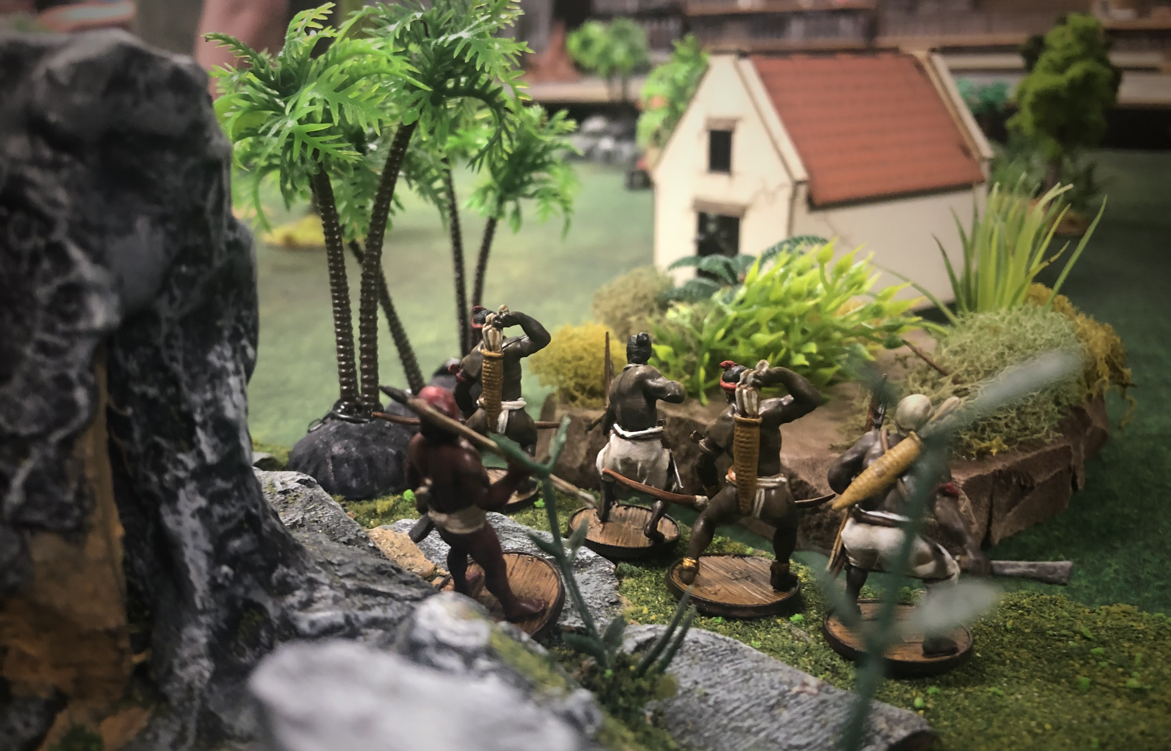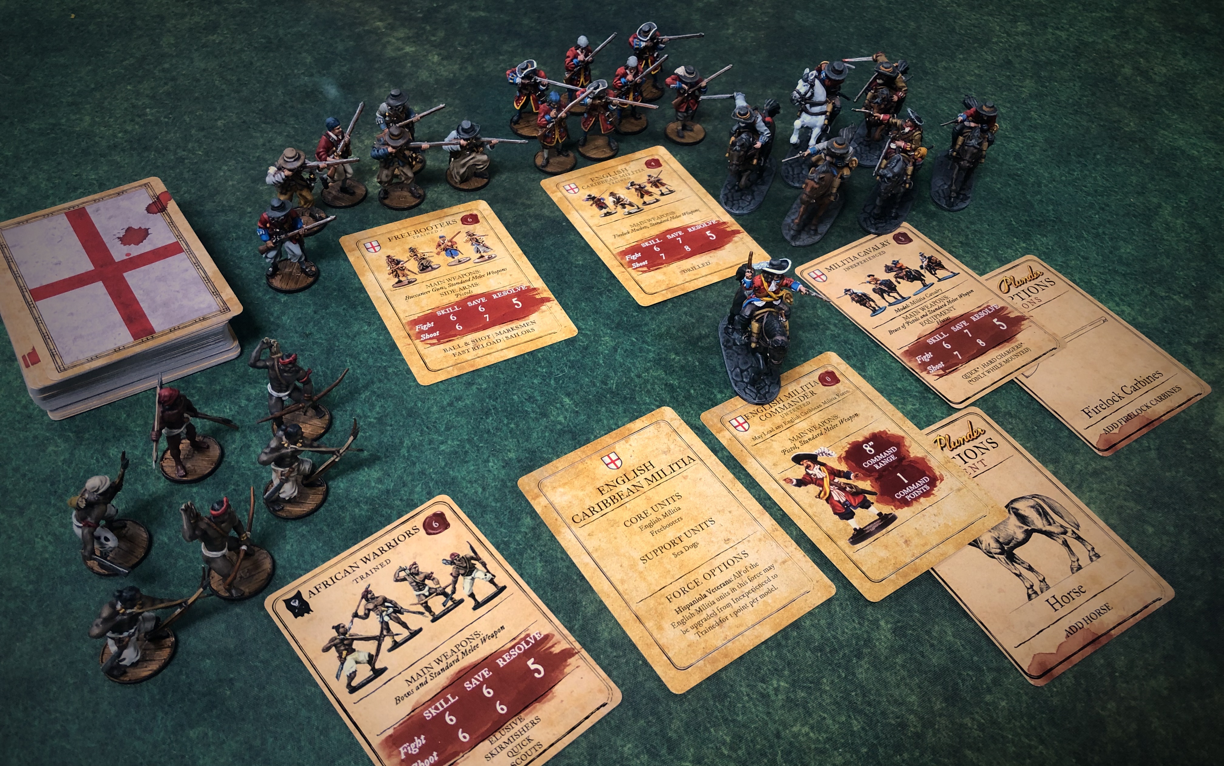 My force of 26 models was led by an Untested English commander mounted on a horse and attached to a unit of 6 Trained Militia Cavalry armed with Carbines. The core of the force was a unit of 6 Trained Freebooters and a unit of 7 Trained English Militia. A unit of 6 Veteran African Warriors with a Grizzled Veteran rounded out my force at 150.