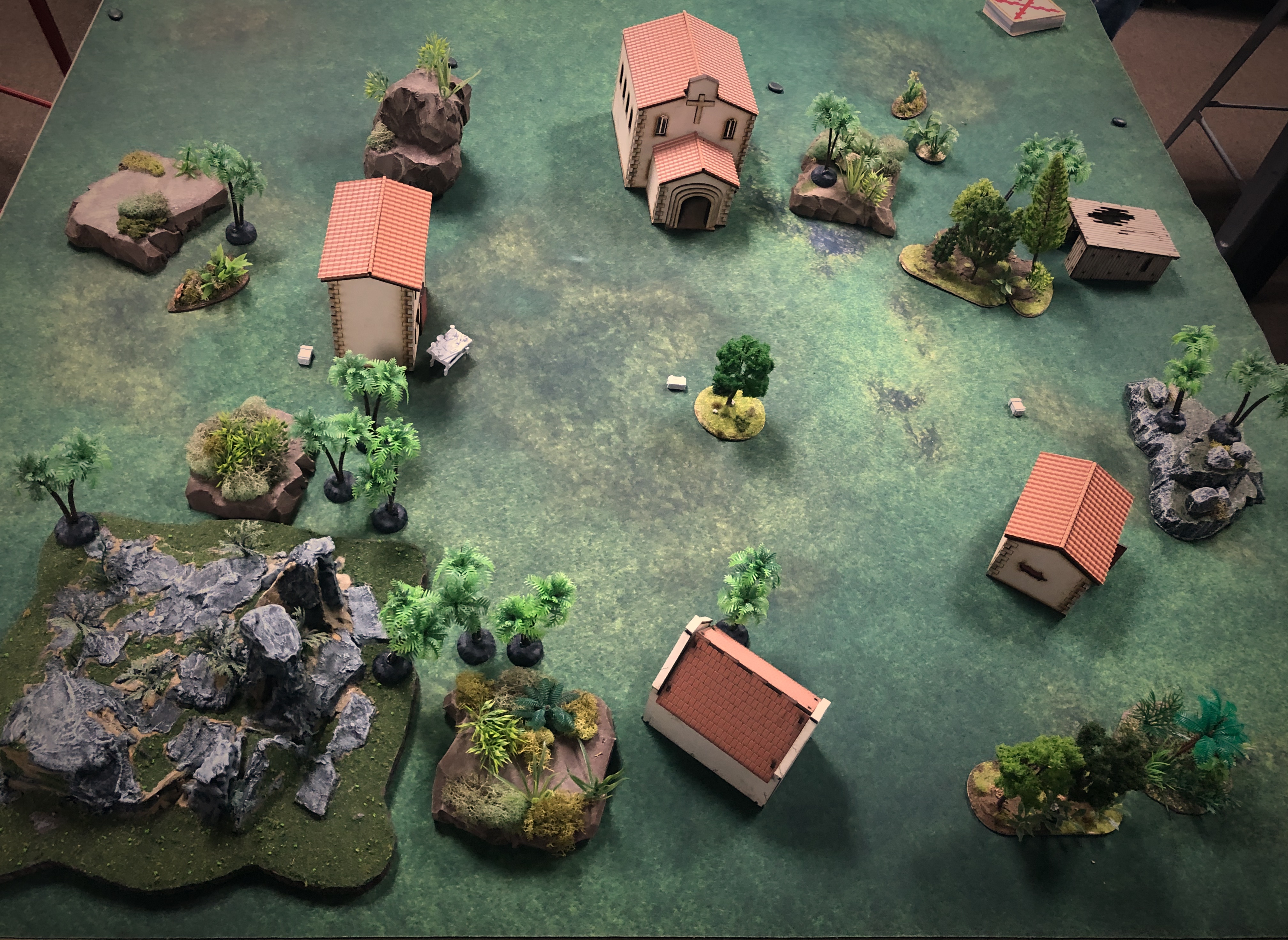 Nick placed his command group near the small building that would control his easy objective if occupied and placed the Soldados and Lanceros on either flank.