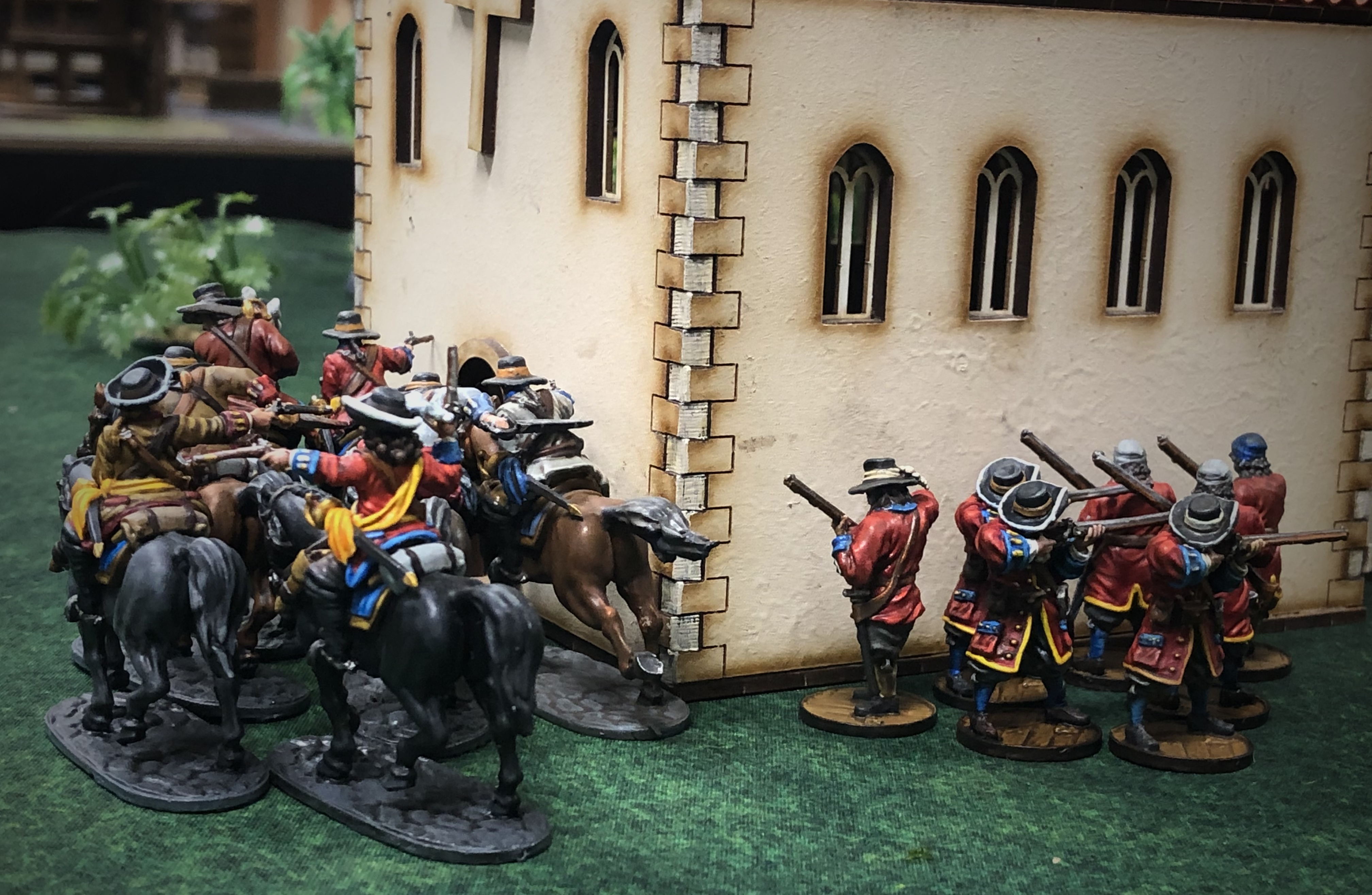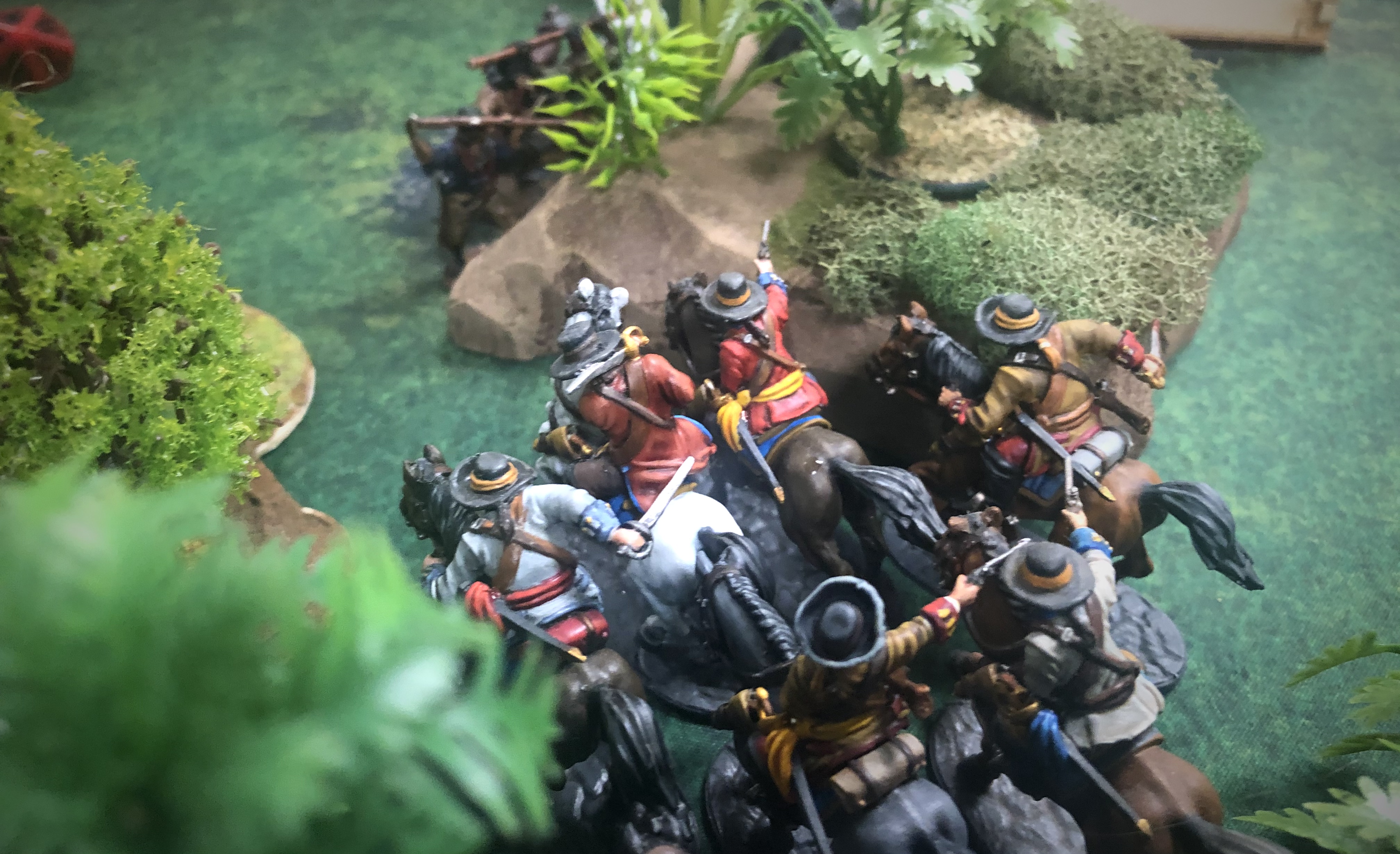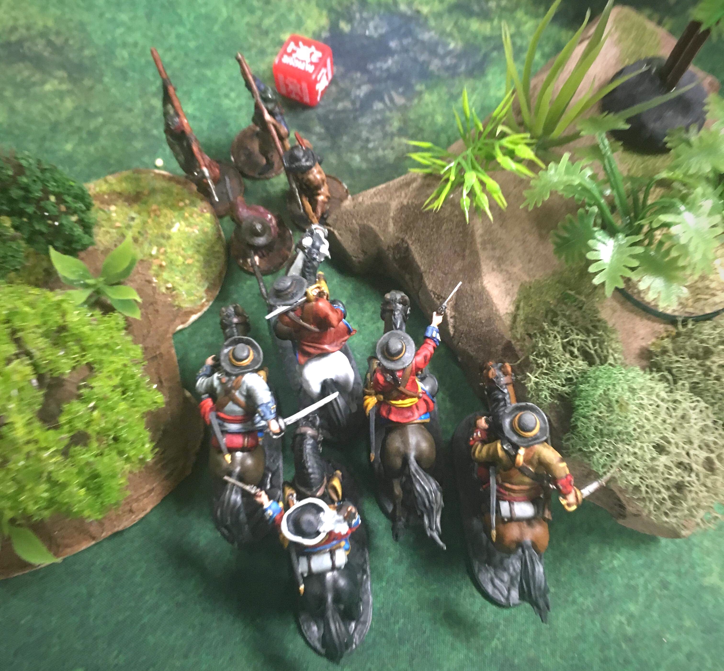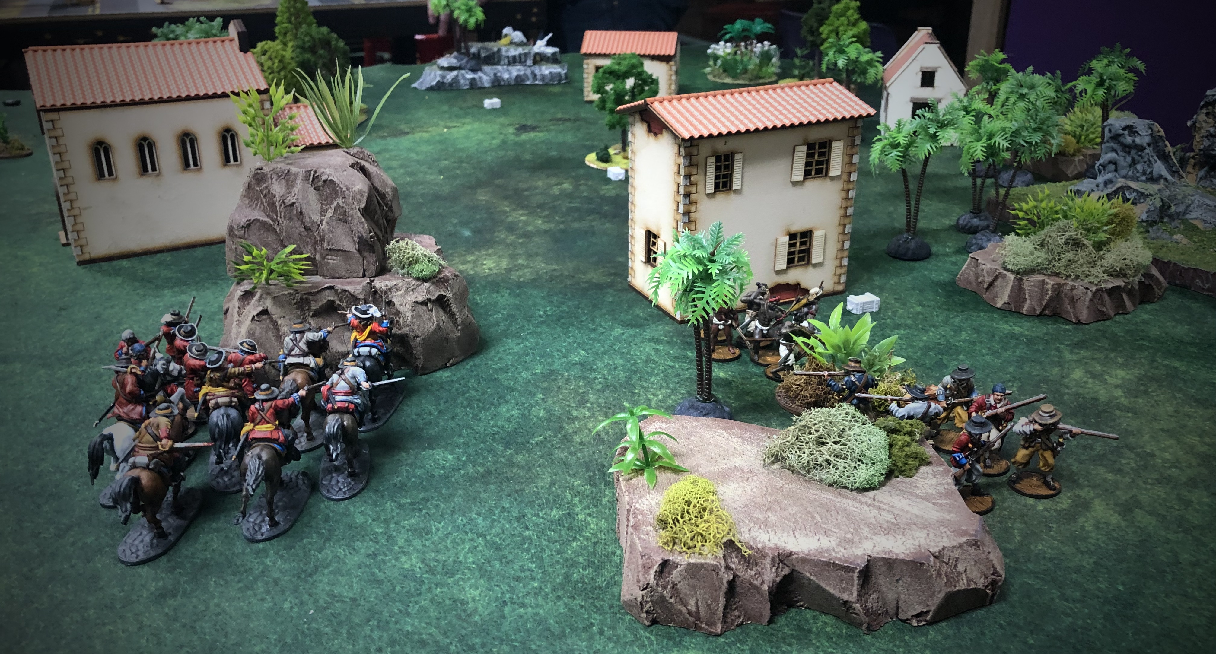 The Milicianos took the shot and got 2 hits on my exposed Cavalry. I failed both saves and desperately used my last Fortune point trying to save at least one of them. But both failed again and that left the remaining 3 models shaken and they retreated.