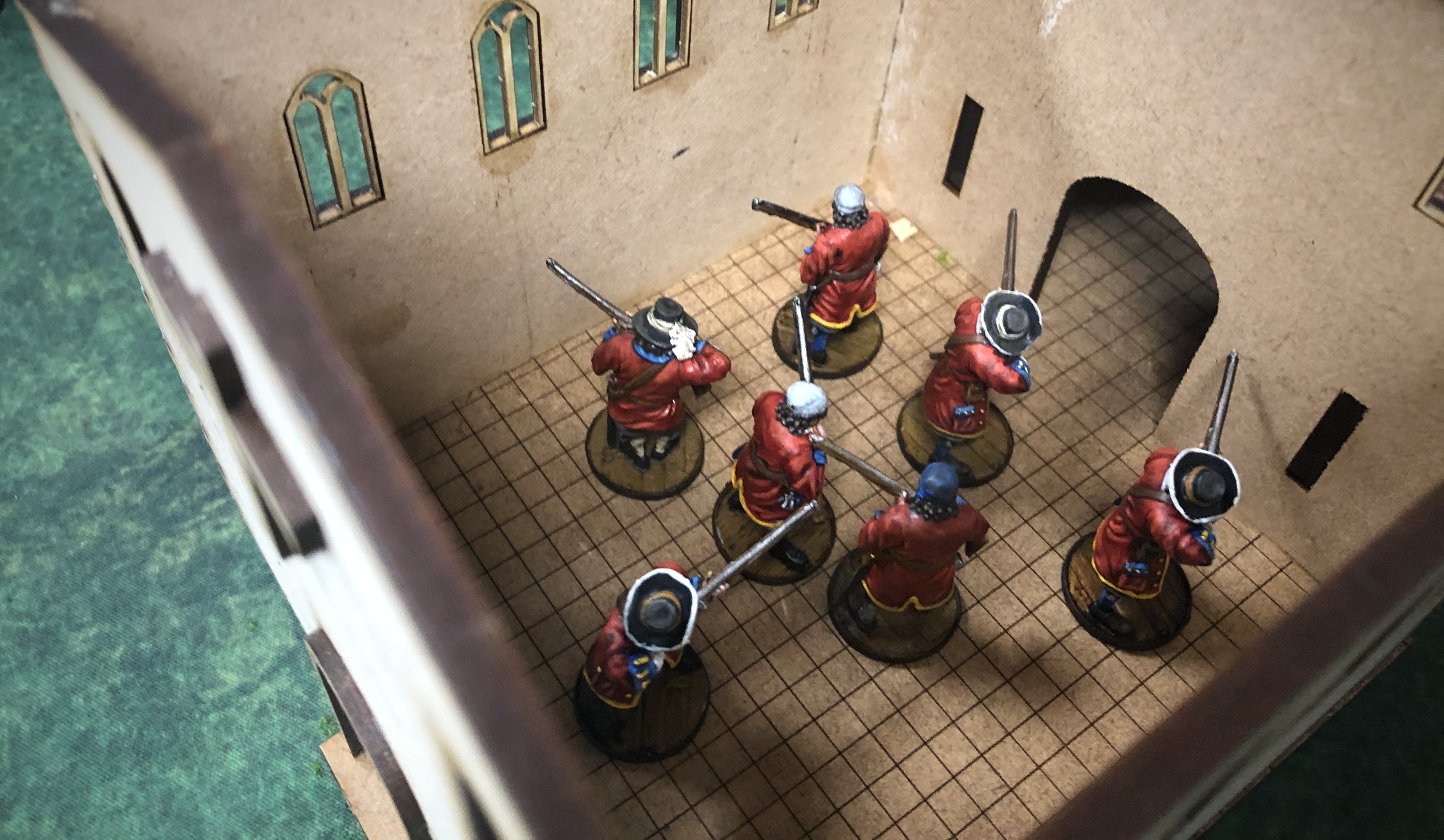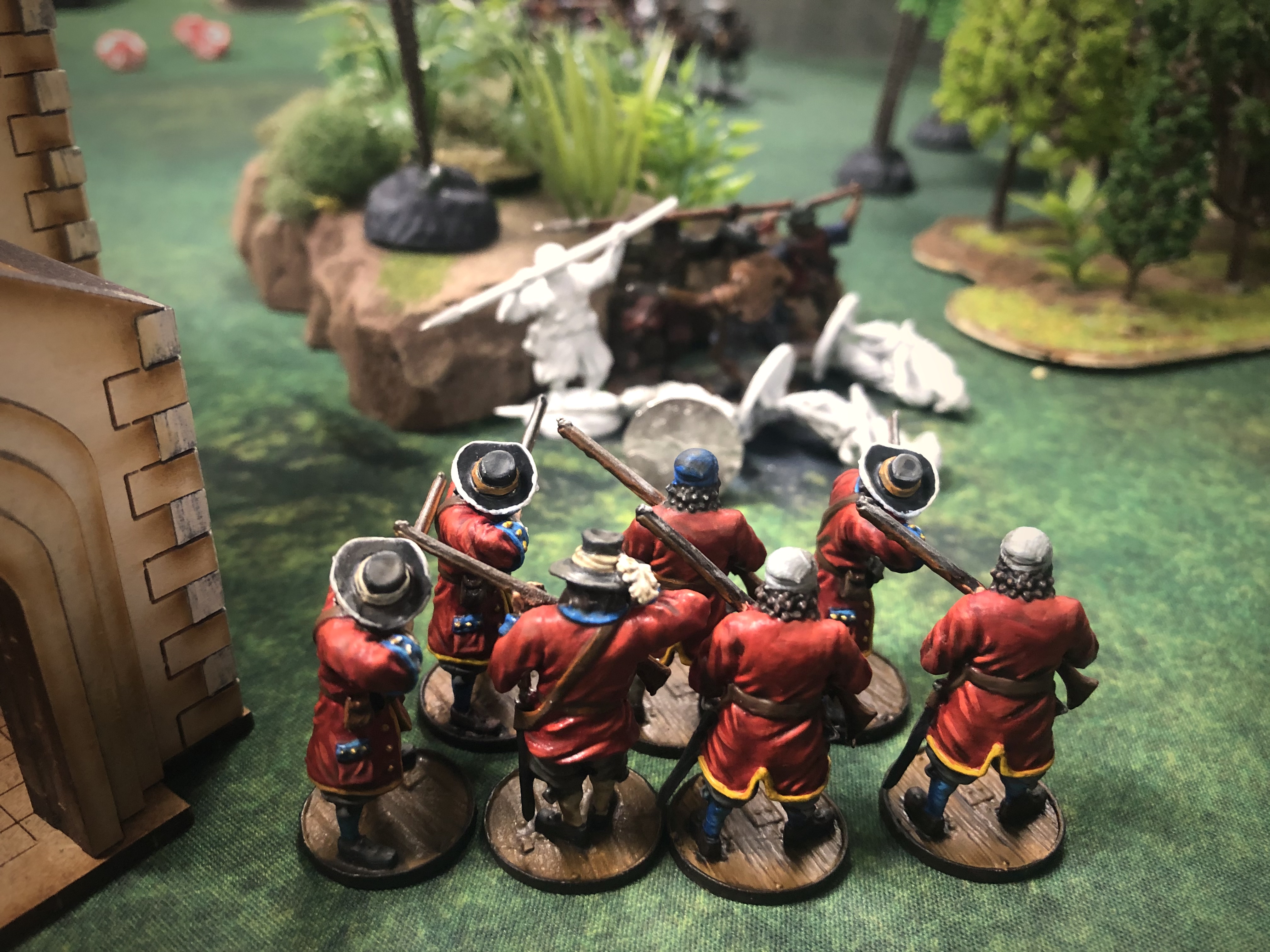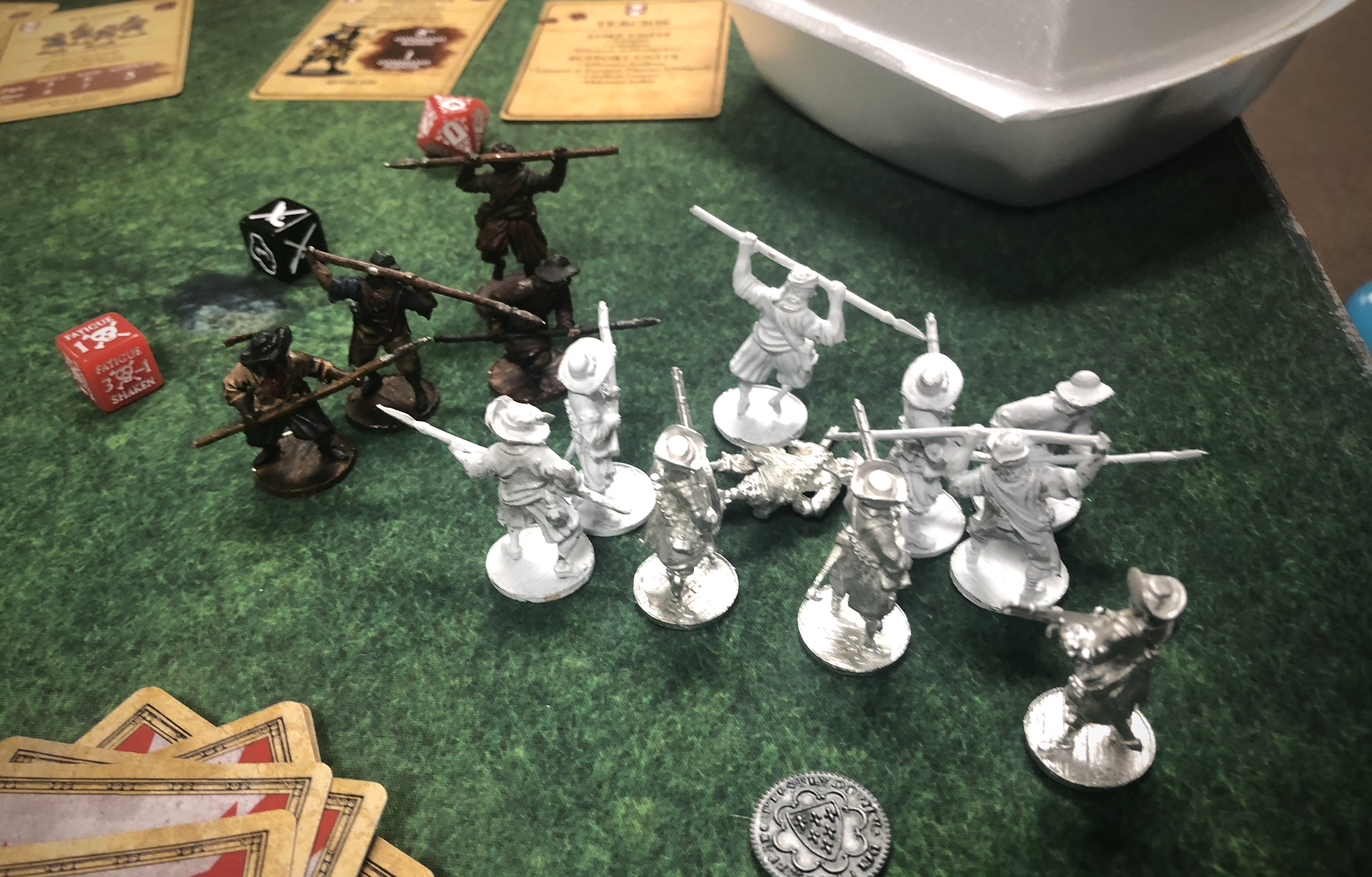 I was able to activate last on this last turn (which can be a huge advantage on some of these scenarios) and take control of the central objective with the 6 remaining English Militia. The game was basically over but the Freebooters, who had failed to really kill anything over the course of the entire game pushed forwards and fired their Sidearm Pistols into the Soldados’ building. They finally got lucky and made 2 kills! The Soldados, who had only failed one Resolve die the entire game (in spite of a constant rain of arrows and Freebooter musketry), finally failed all 3 Fatigue dice on this last moment of the game and went prone.