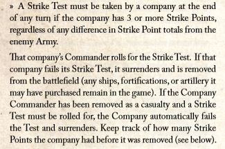 - My English had lost the Sloop company of 150 points which forced me to roll a Strike Test every turn. My Frigate had lost 51 points worth of models lost totaling 1 Strike Point but the Fortitude of my Flagship hadn’t been reduced by half so that force had a single Strike Point. My Fluyt hadn’t taken a casualty over the entire game!