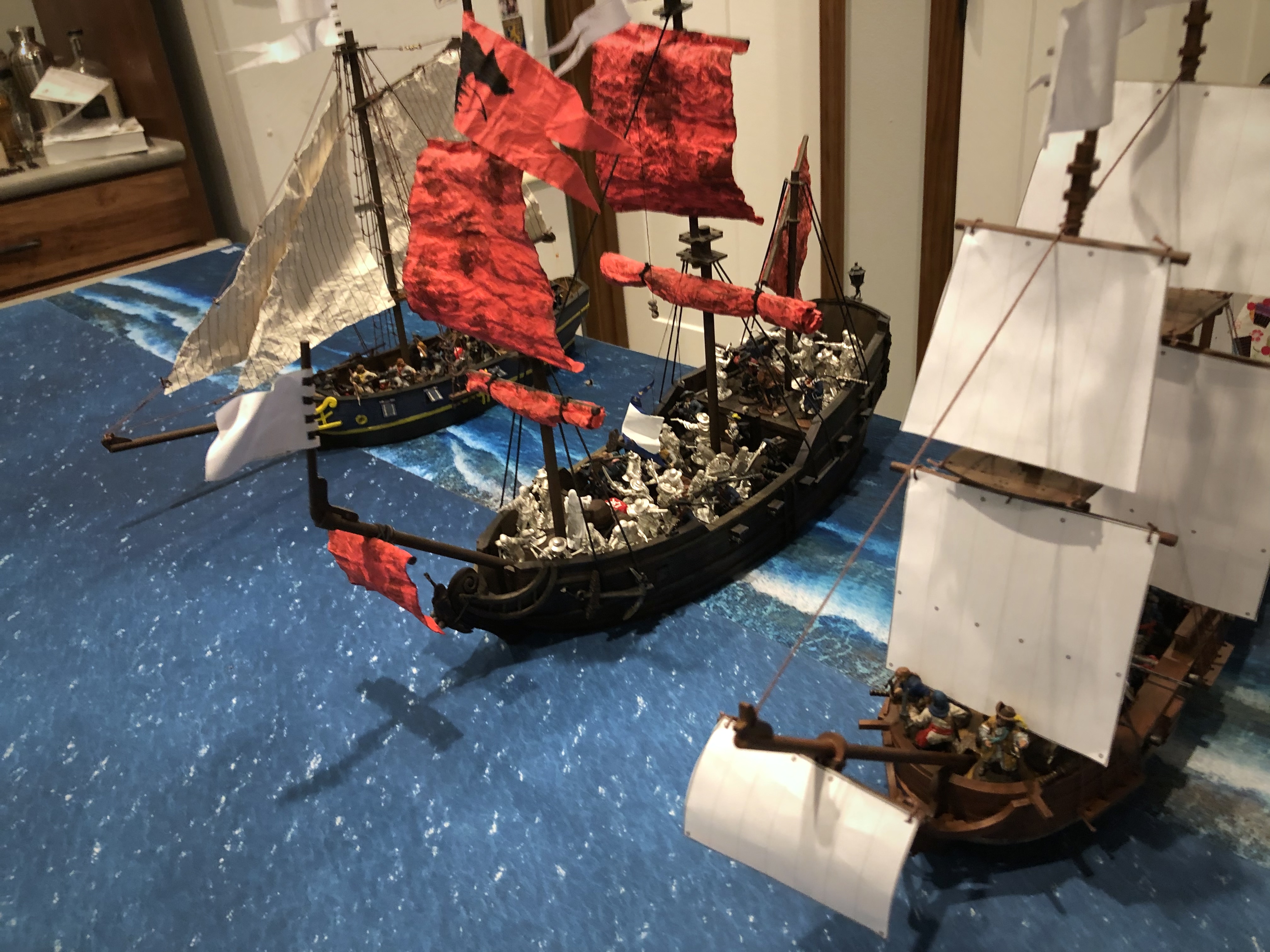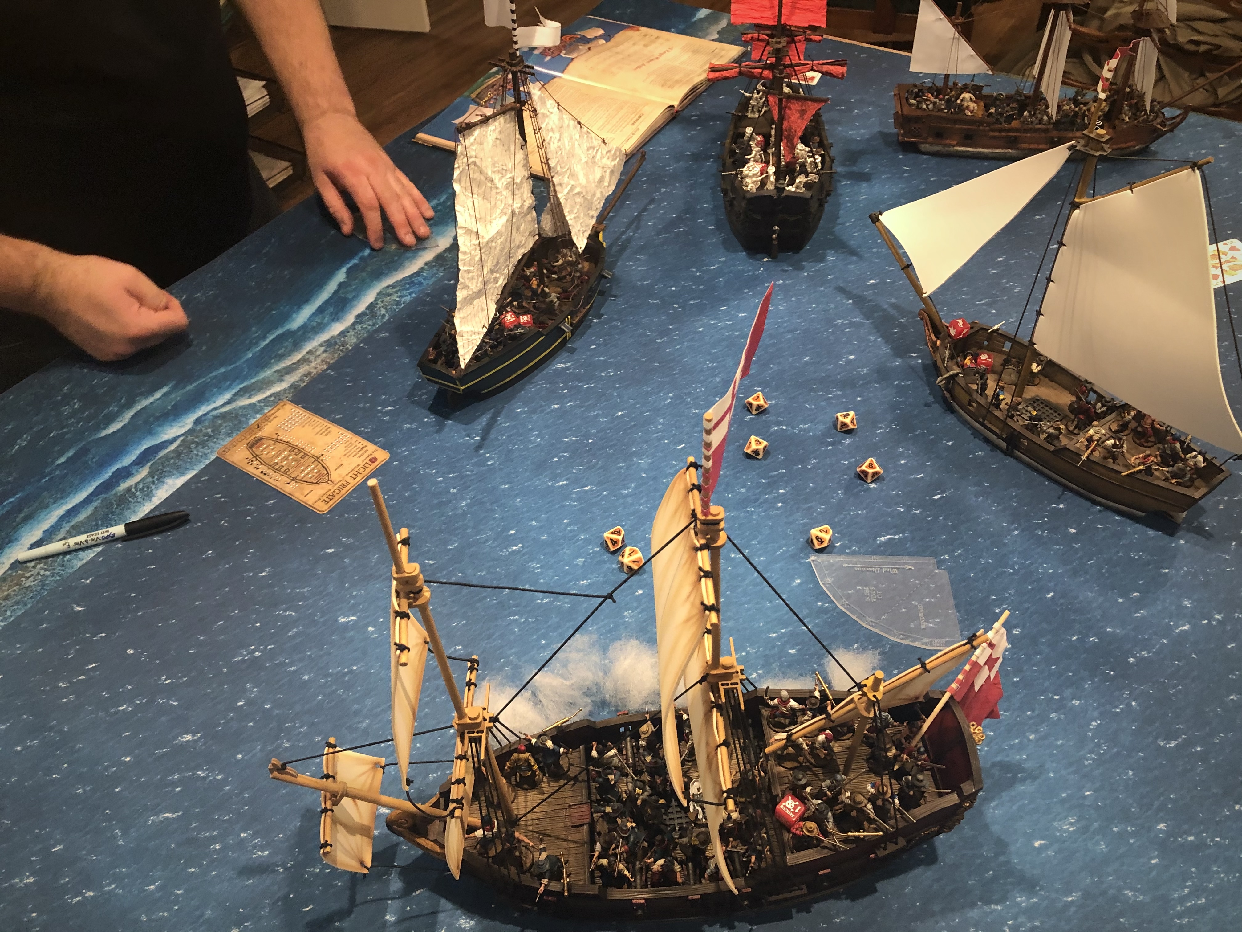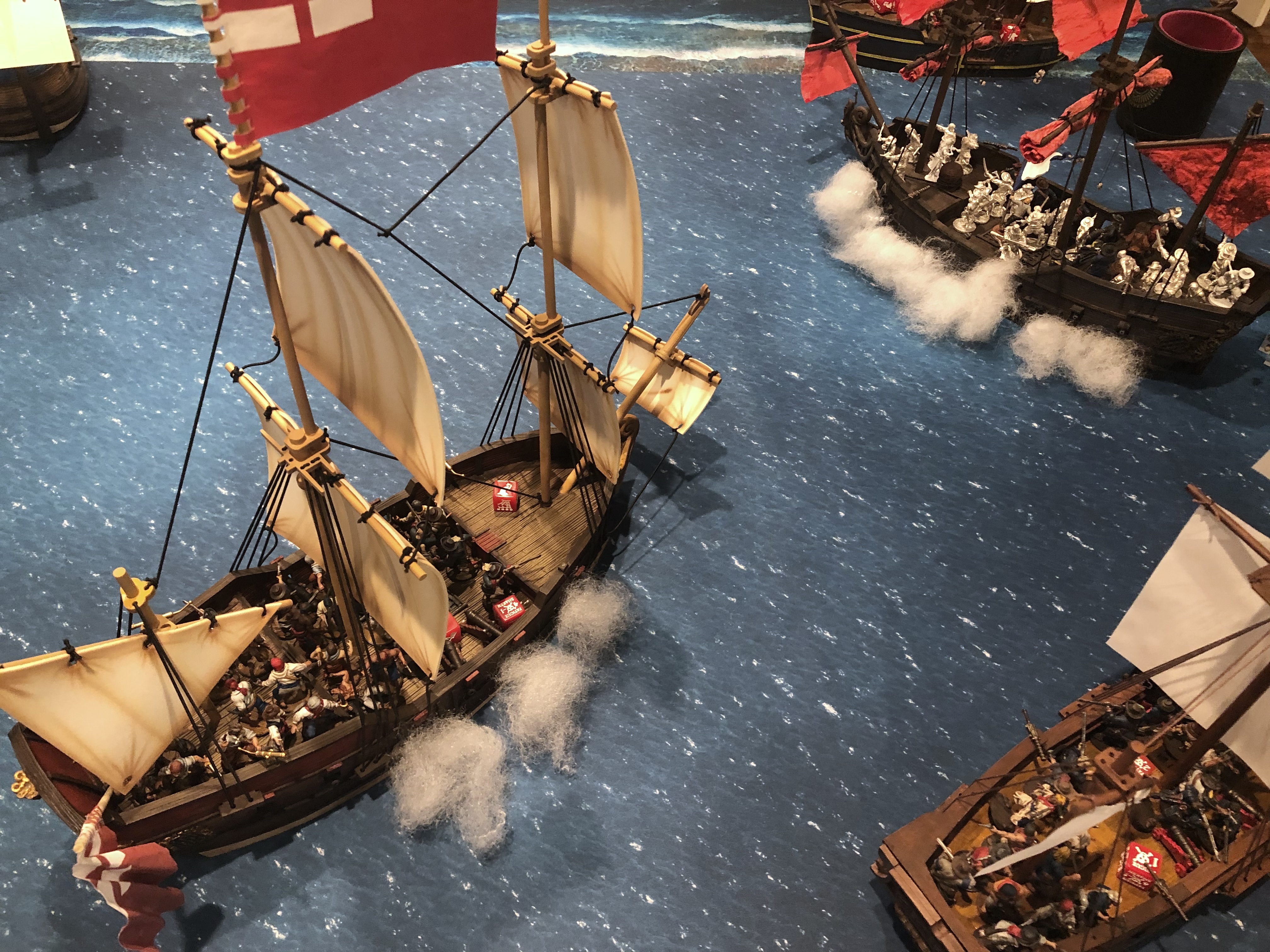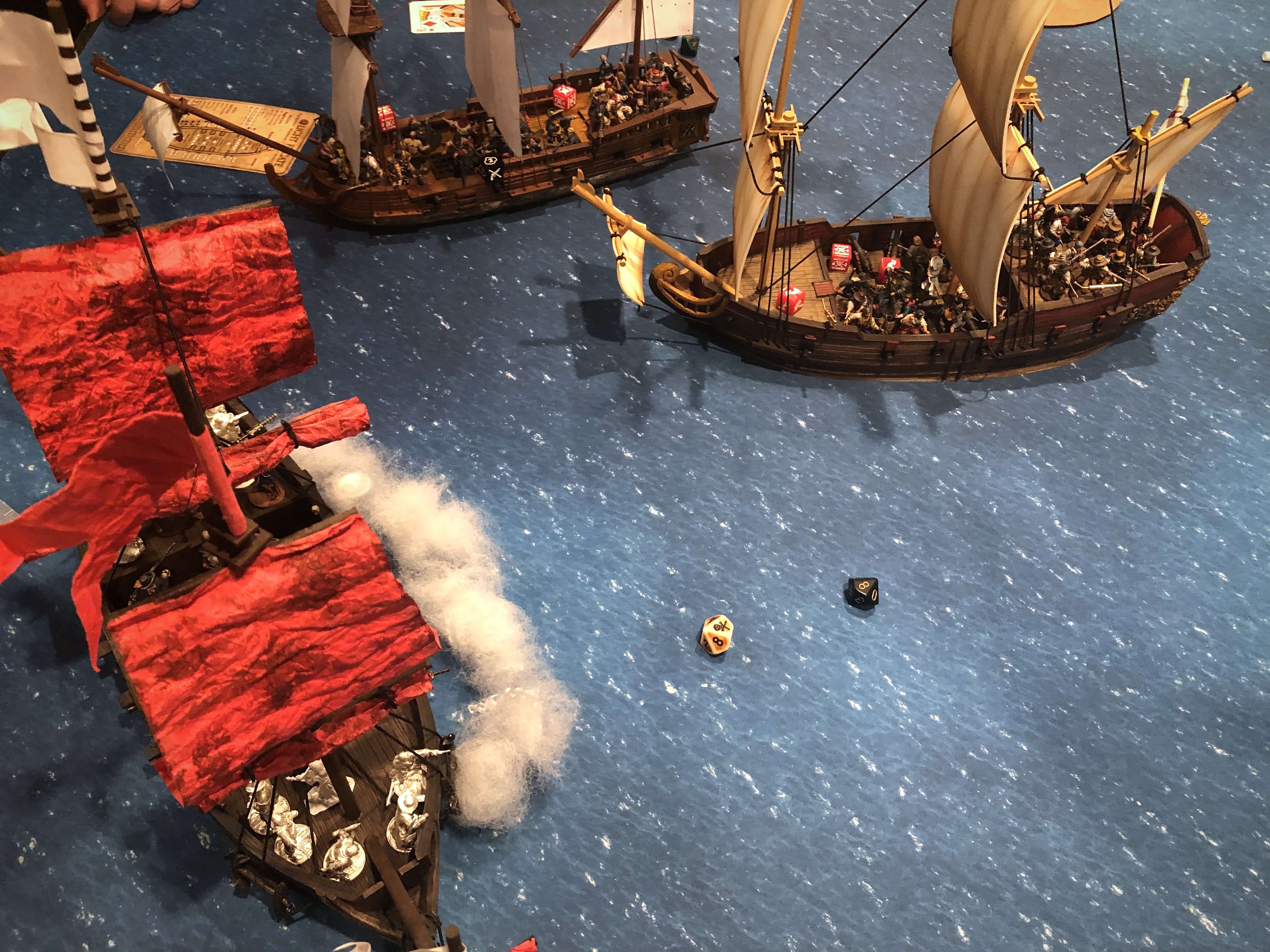 Guy’s broadside was a little more effective since he was able to fire 9 cannons on 3 separate ships in one activation but the range prevented much damage from happening on that first turn.