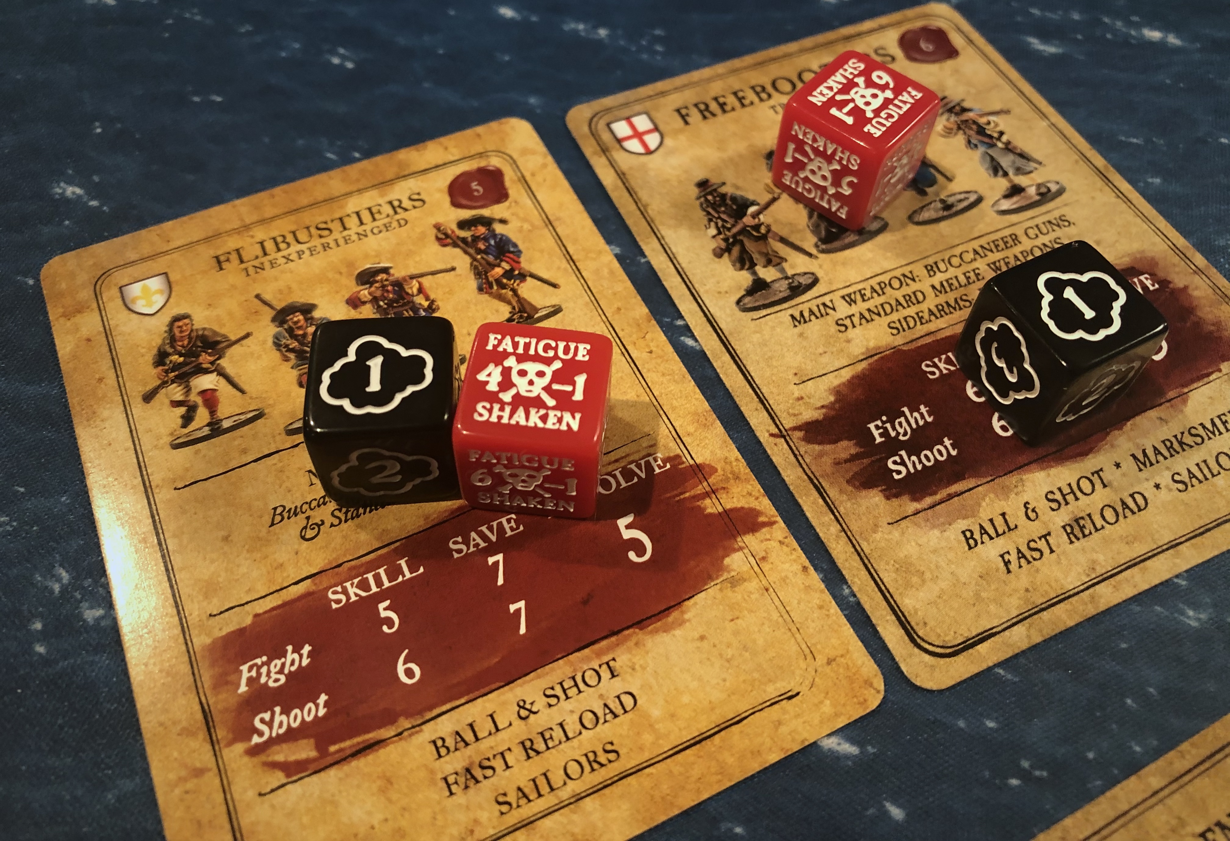 I was able to use Kidd again to fire a Broadside off the Fluyt and I won’t spoil how it helped, but the Strict rule helped me get my target numbers down on this shot and it pretty well broke the French Sloop apart. The critical hits weren’t as numerous or devastating as what the French had just handed me, but it pretty much took that ship out of the battle as well. I ended up getting 2 Destroyed Gun critical hits on the back deck where there were no guns which resulted in more damage on the soldiers there (we were assuming that extra hit that the gun crit results in if there’s no gun would force you to attempt another save on a model, but we weren’t entirely sure).