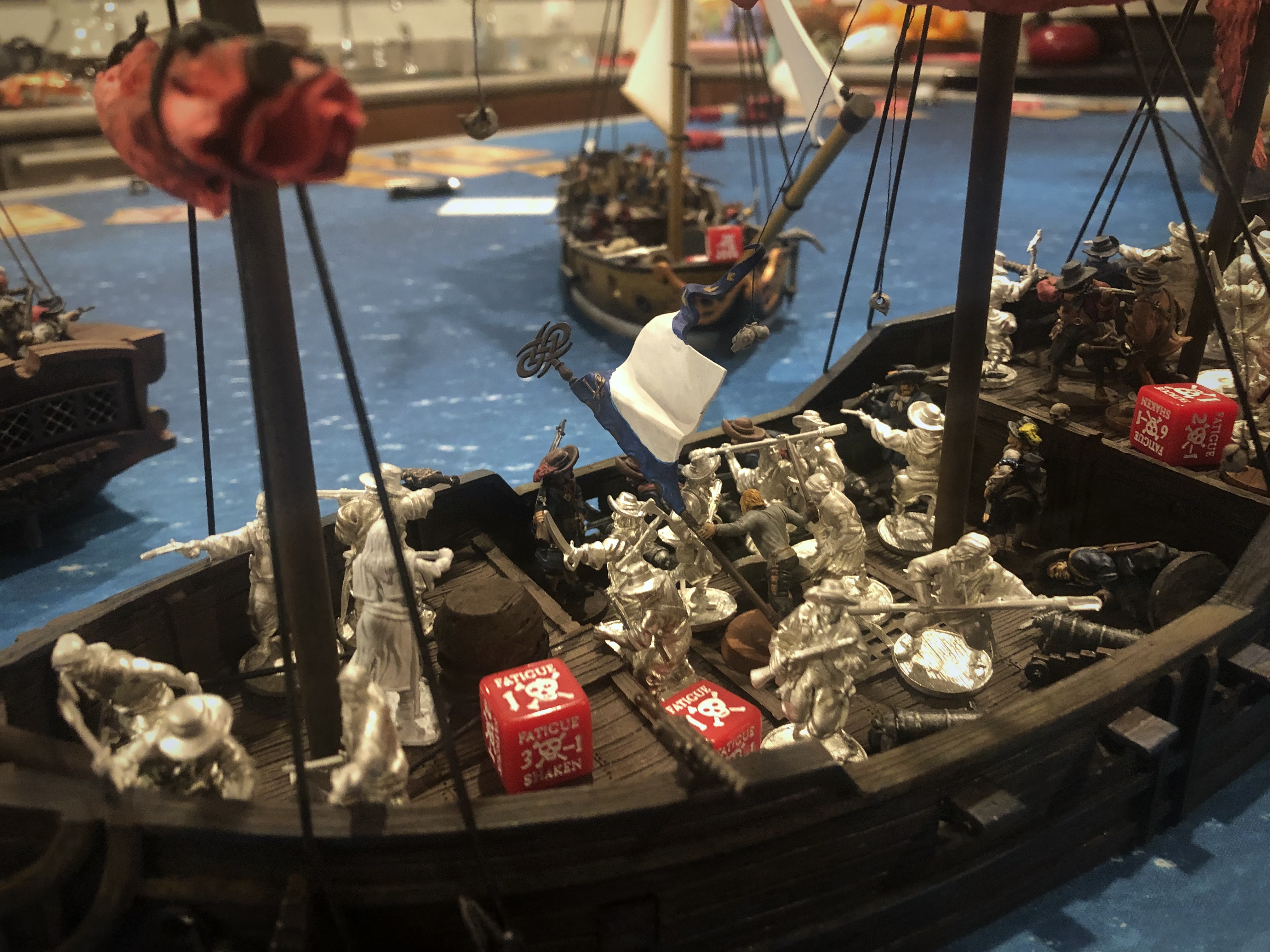 As the French ships sailed downwind they closed with my Sloop. I got a solid activation out of them on turn 2 and shot a bunch of small arms into the Flagship Frigate taking out a good 5-7 models and leaving several units with Fatigue.