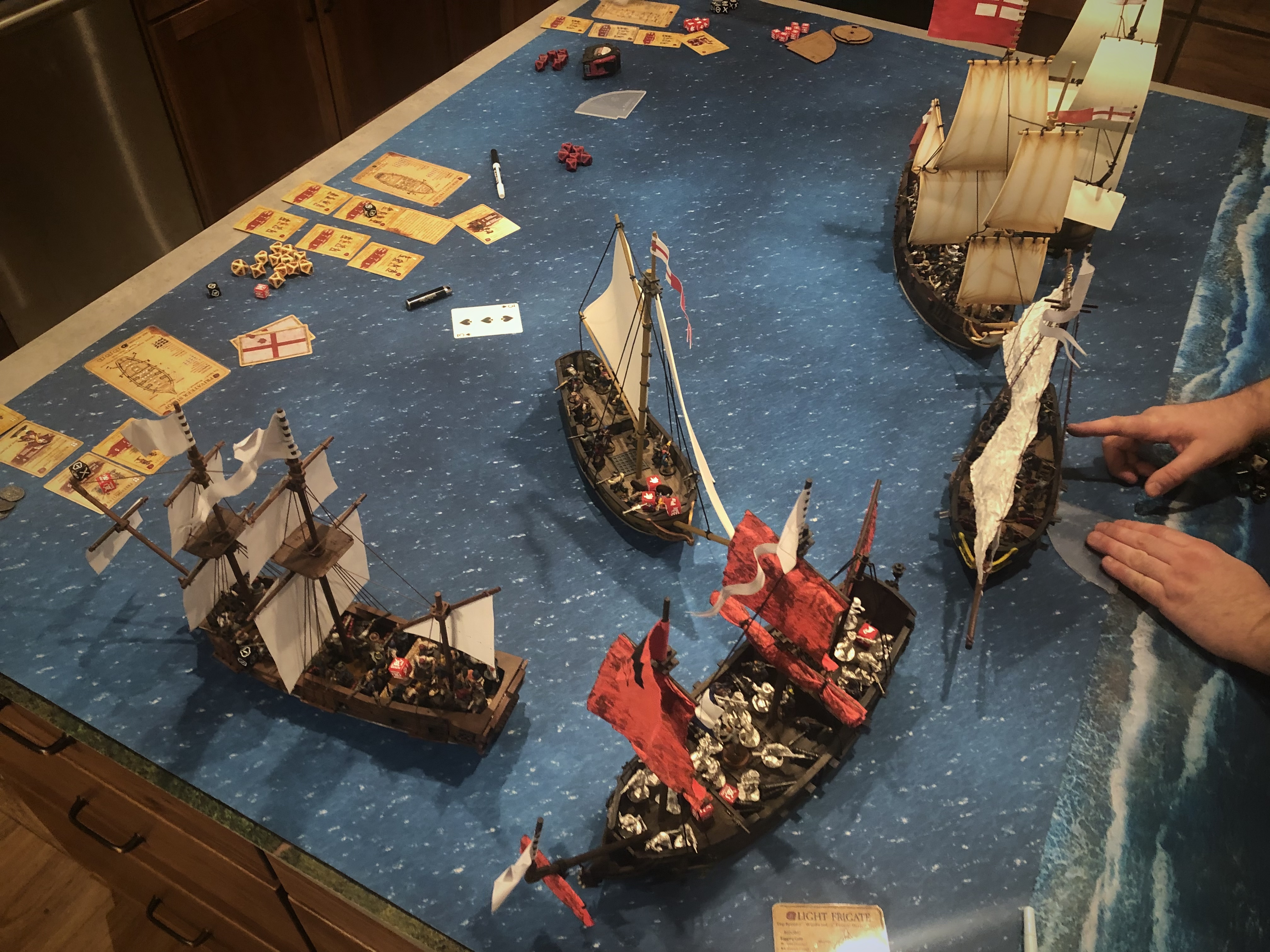 The game was extremely close! With both forces down a Company and 1 English to 0 French Strike Points the French were victorious. I’m not sure what would have happened if the game had continued but my Frigate was beginning to fall apart under the close and accurate French guns and my General was shaken. My Flagship had 2 Leaks and the Fortitude was down to 3. The French certainly had the better tactical position at the end of the game.