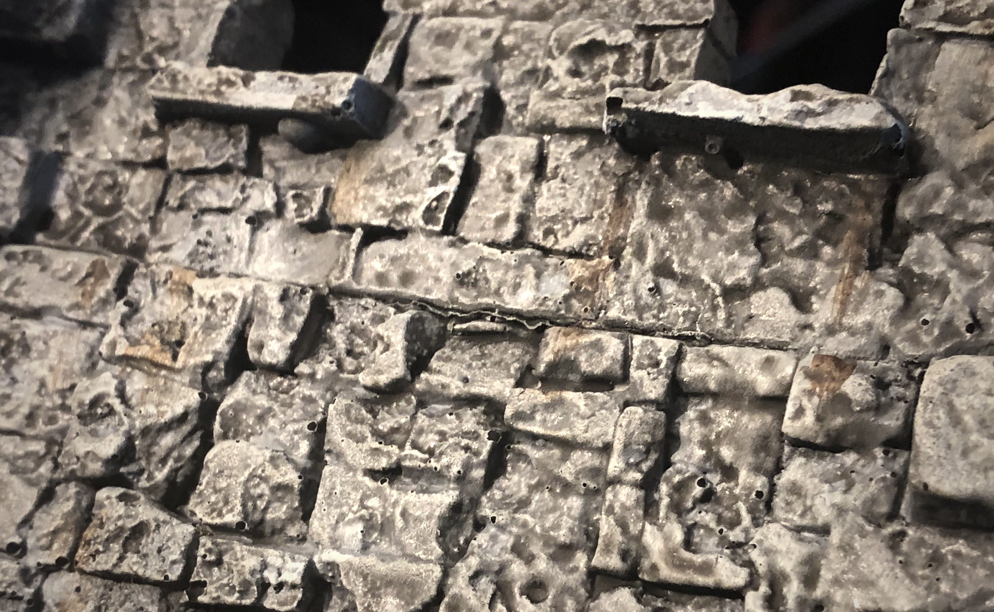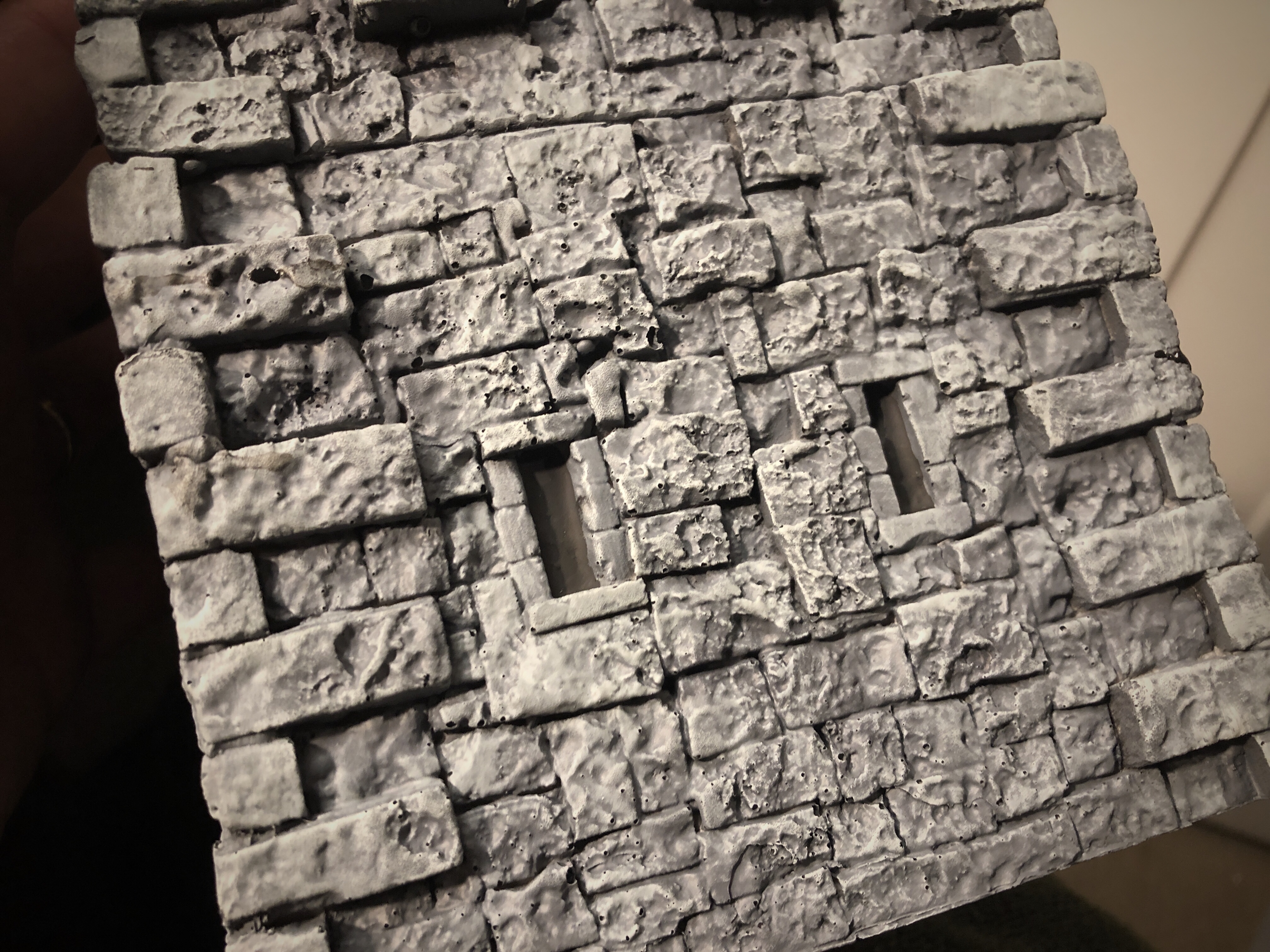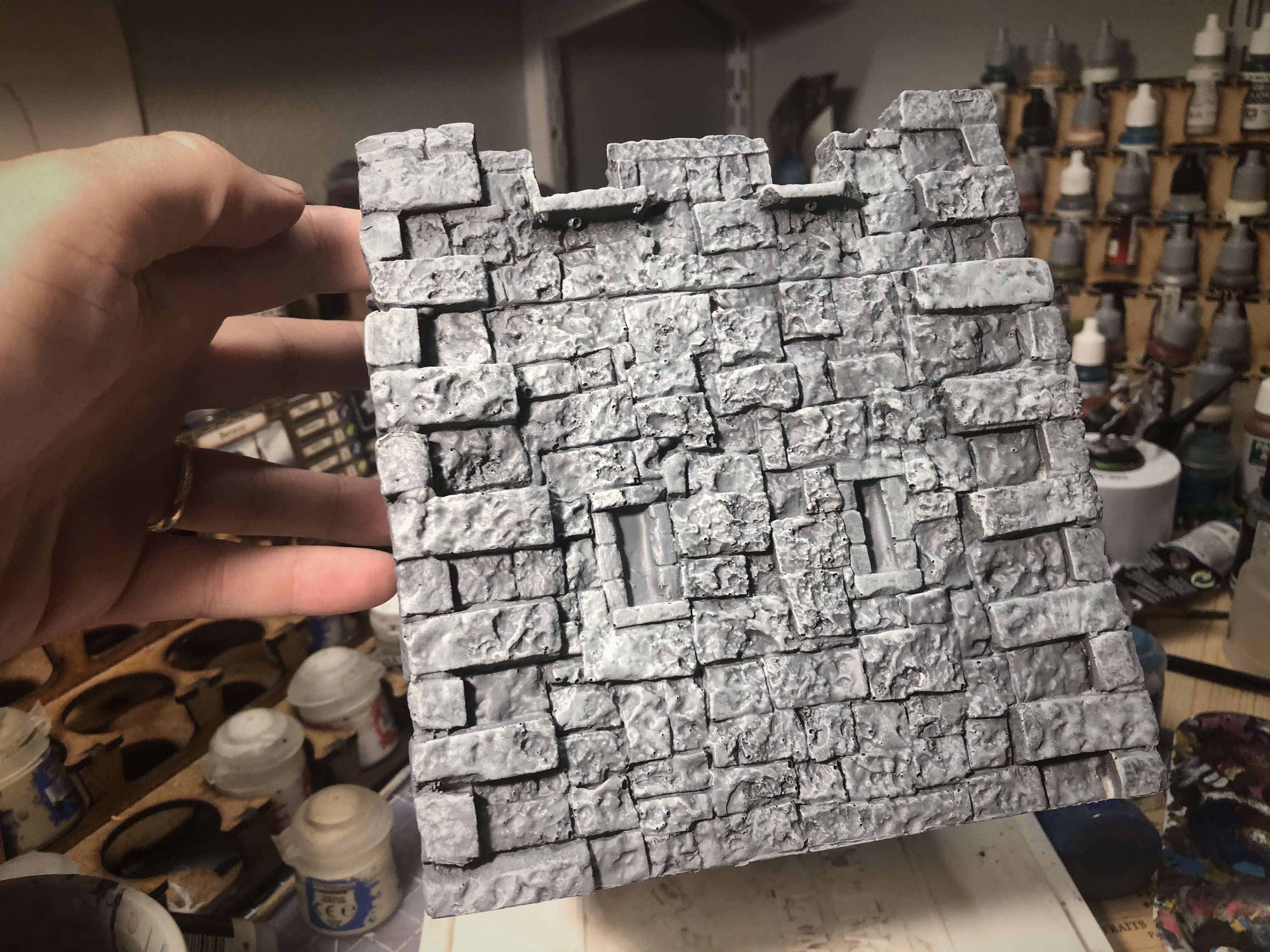 I primed with a black spray paint at an angle from below then used Army Painter grey primer from above. Priming was a bit of a trick with all the crevices and cracks between the stones. I had to go back with a brush and get paint into the deepest recesses by hand.