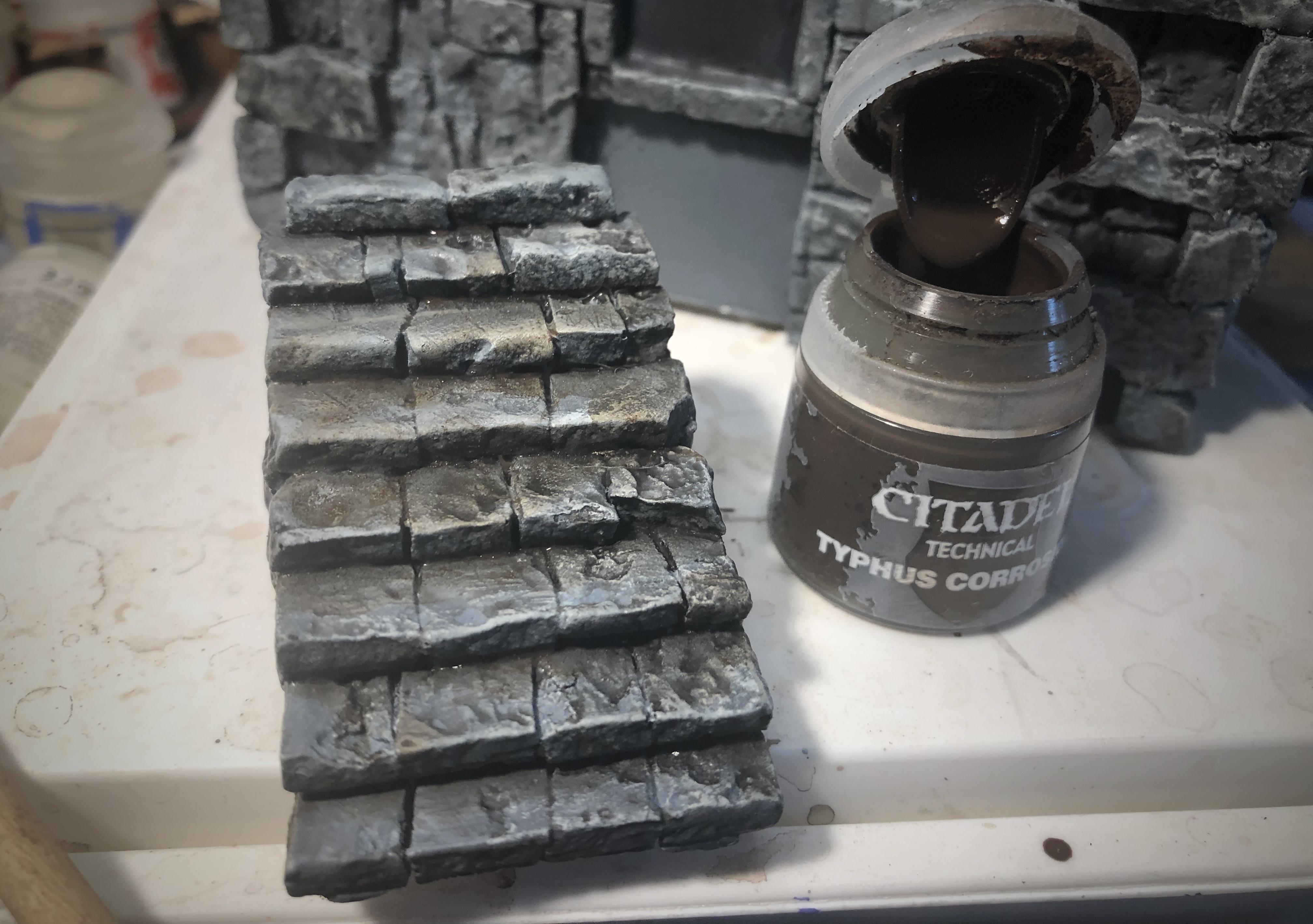 For some additional weathering and variation in color, I used Typhus Corrosion to dirty up the stairs and add some dirty streaks to the walls.