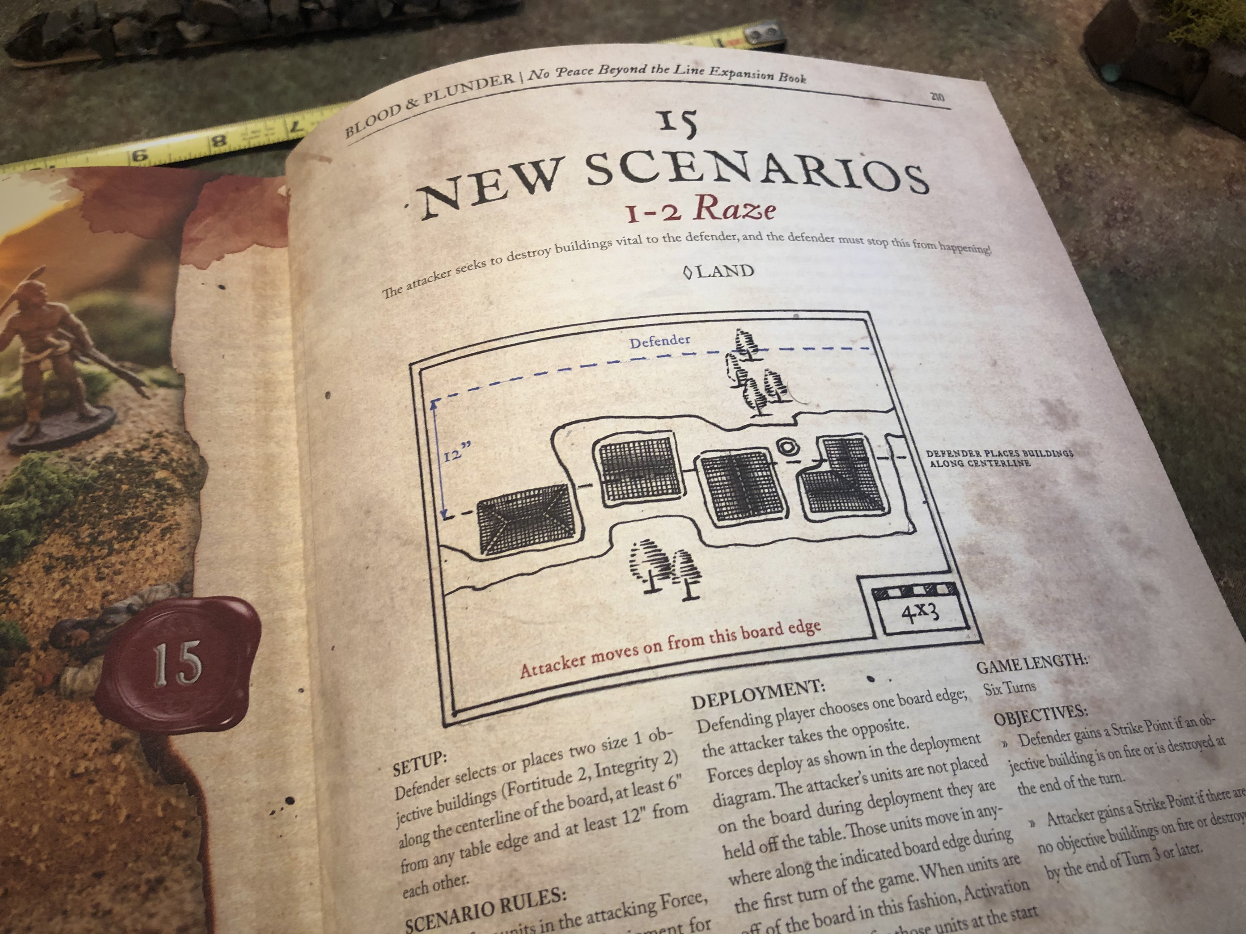 In this scenario the defender starts at the back of the board, the attacker comes onto the board on turn one with the goal of either destroying or burning one of two buildings in the center of board by turn 3.