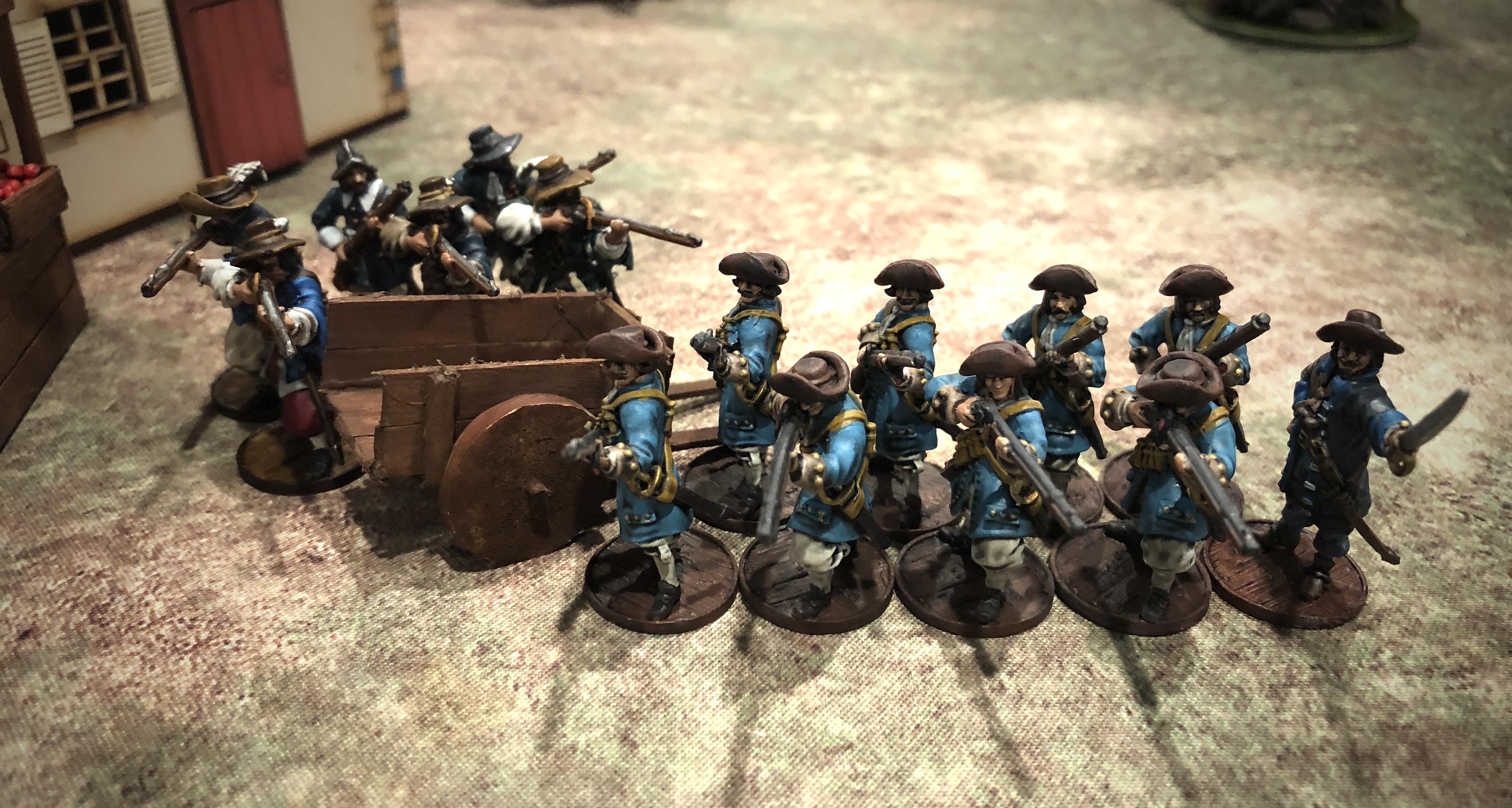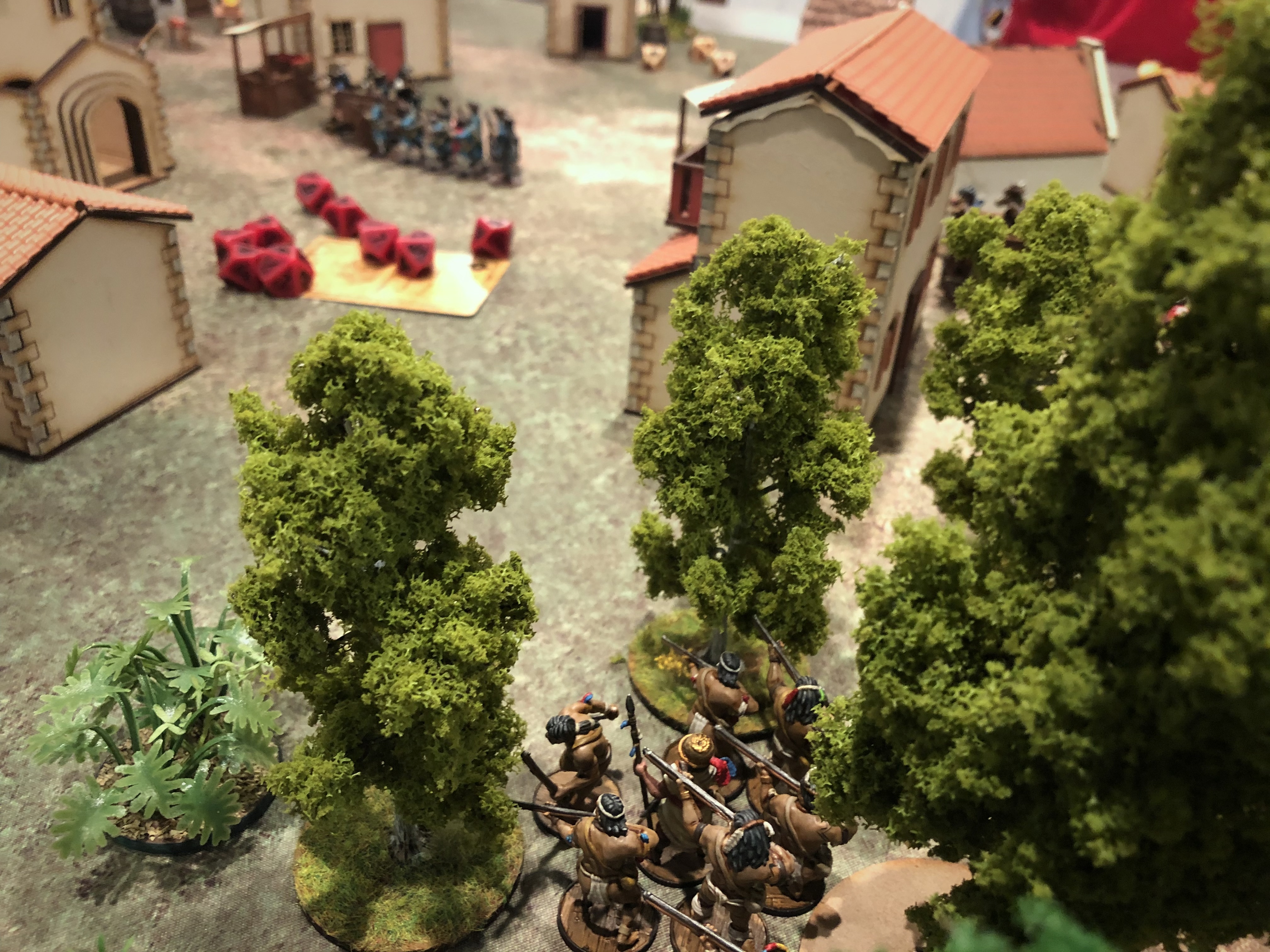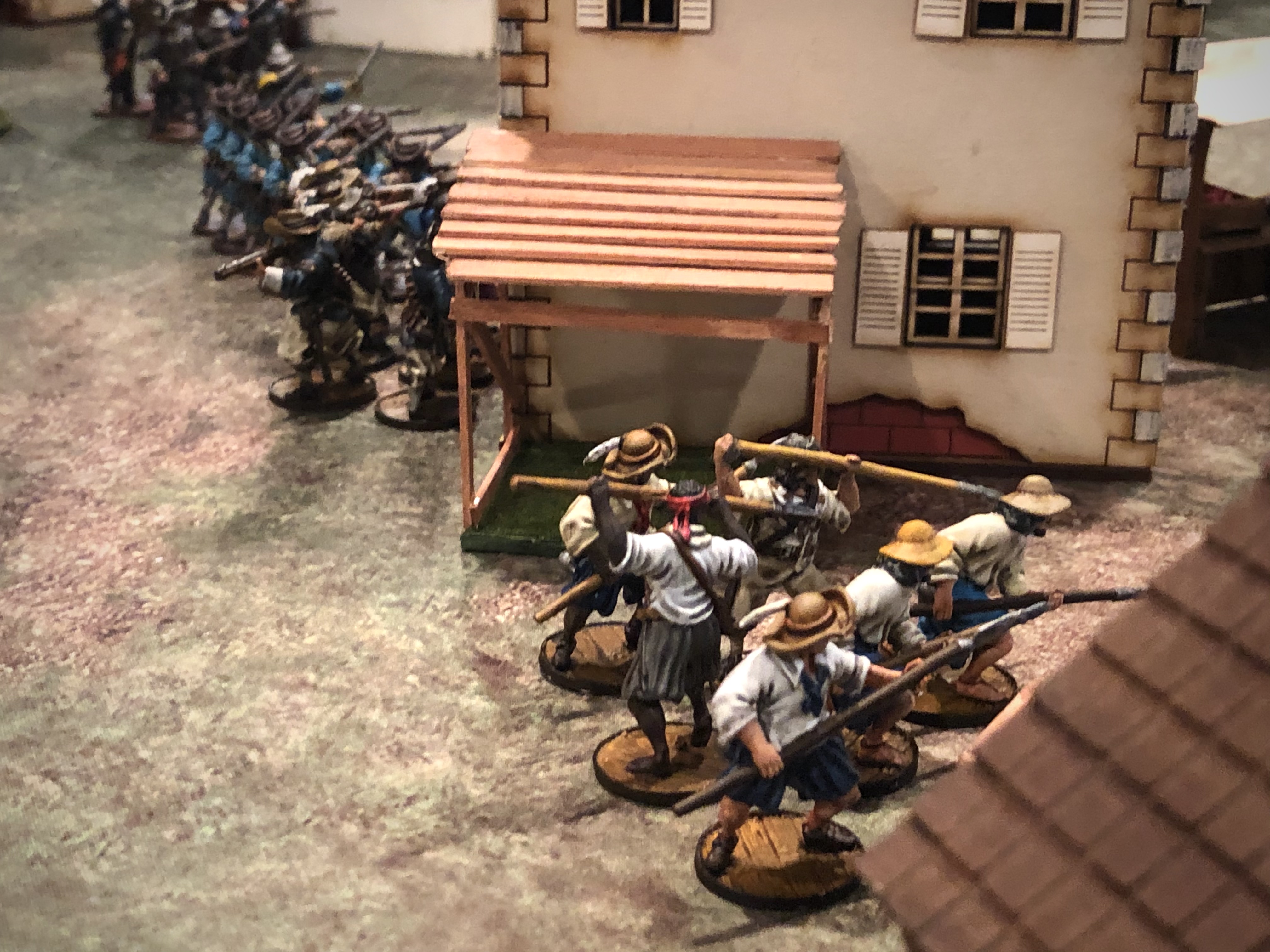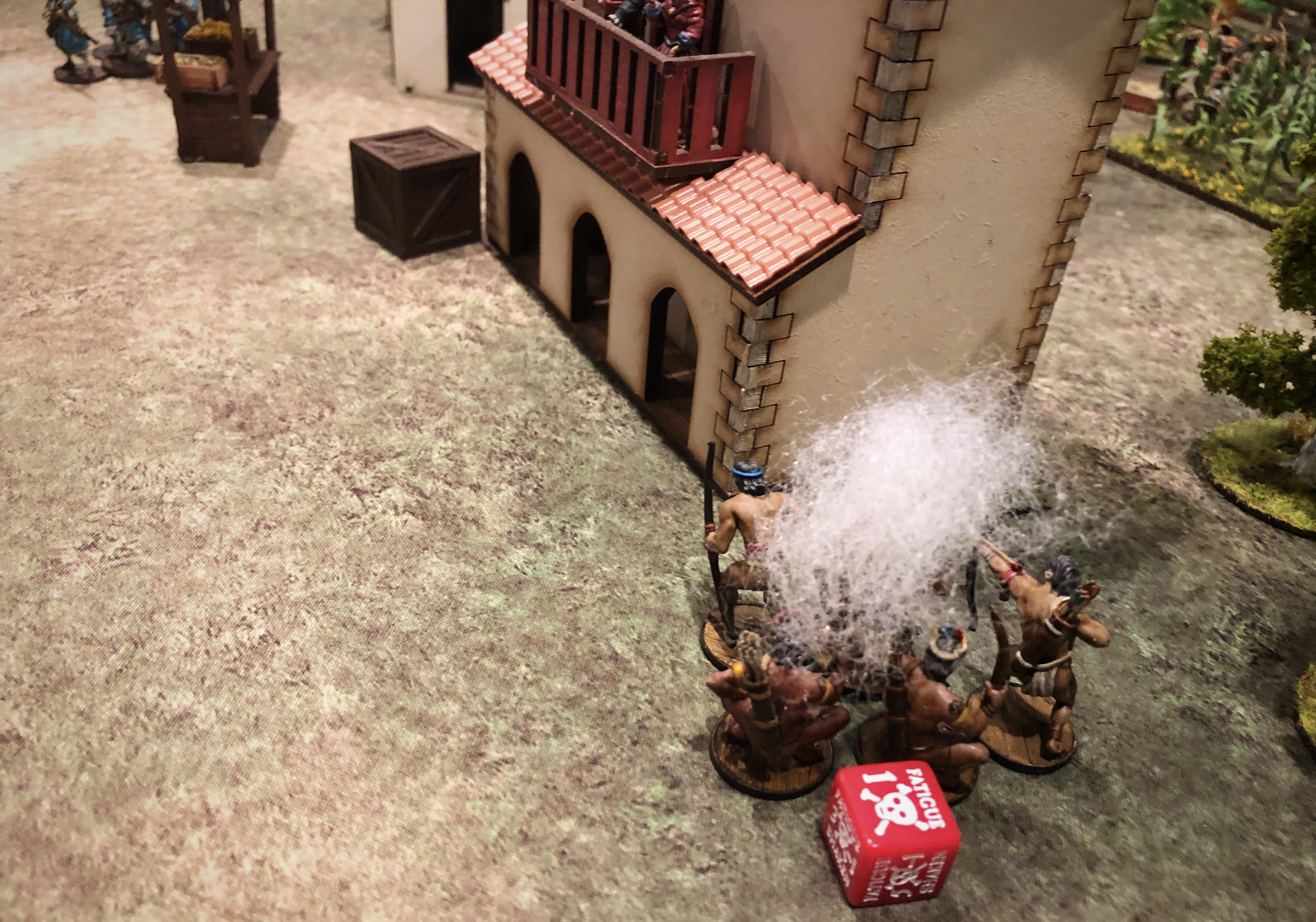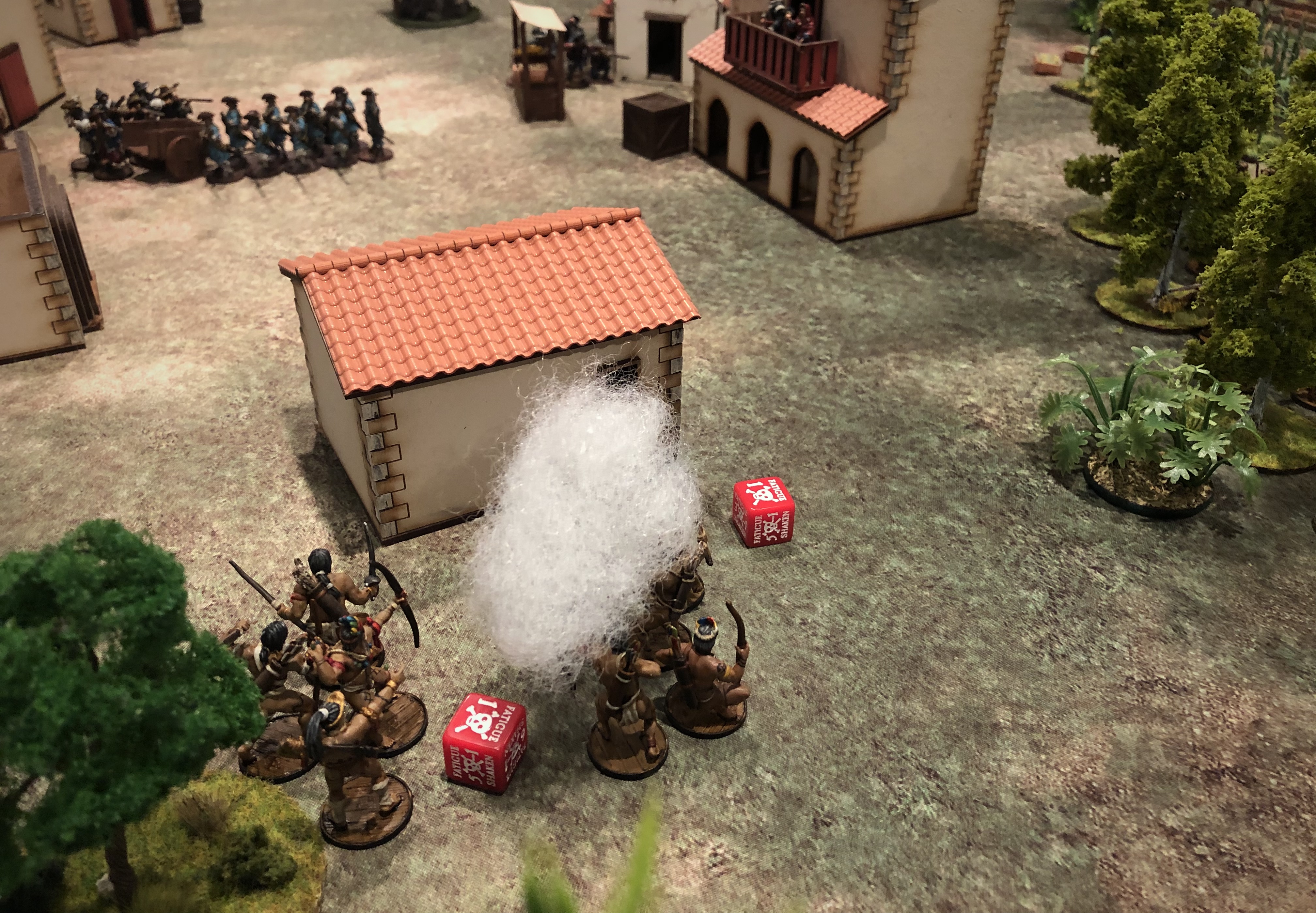 Dupont responded aggressively and moved up 8″ and did an Expertly Drilled shot using his command point. Two Natives died and they fell back after failing 3 of 4 Fatigue dice.