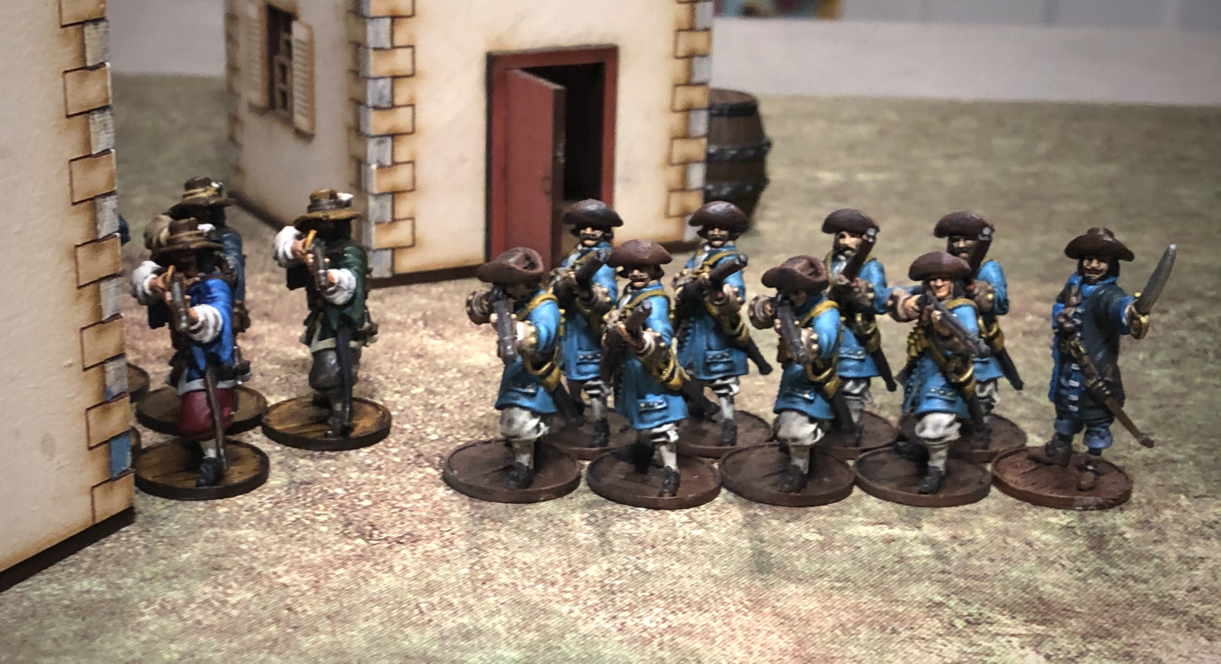 - The Night rules are fun. In this scenario, they really favored my side since most of the Spanish were equipped with Matchlock guns while my men either had no guns or Firelock muskets which don’t have a visibility penalty. I did wonder about the sidearm muskets. The rule book doesn’t clarify what kind of musket those sidearm guns are but I assumed they would be Firelock since that’s what the Musketeers have.