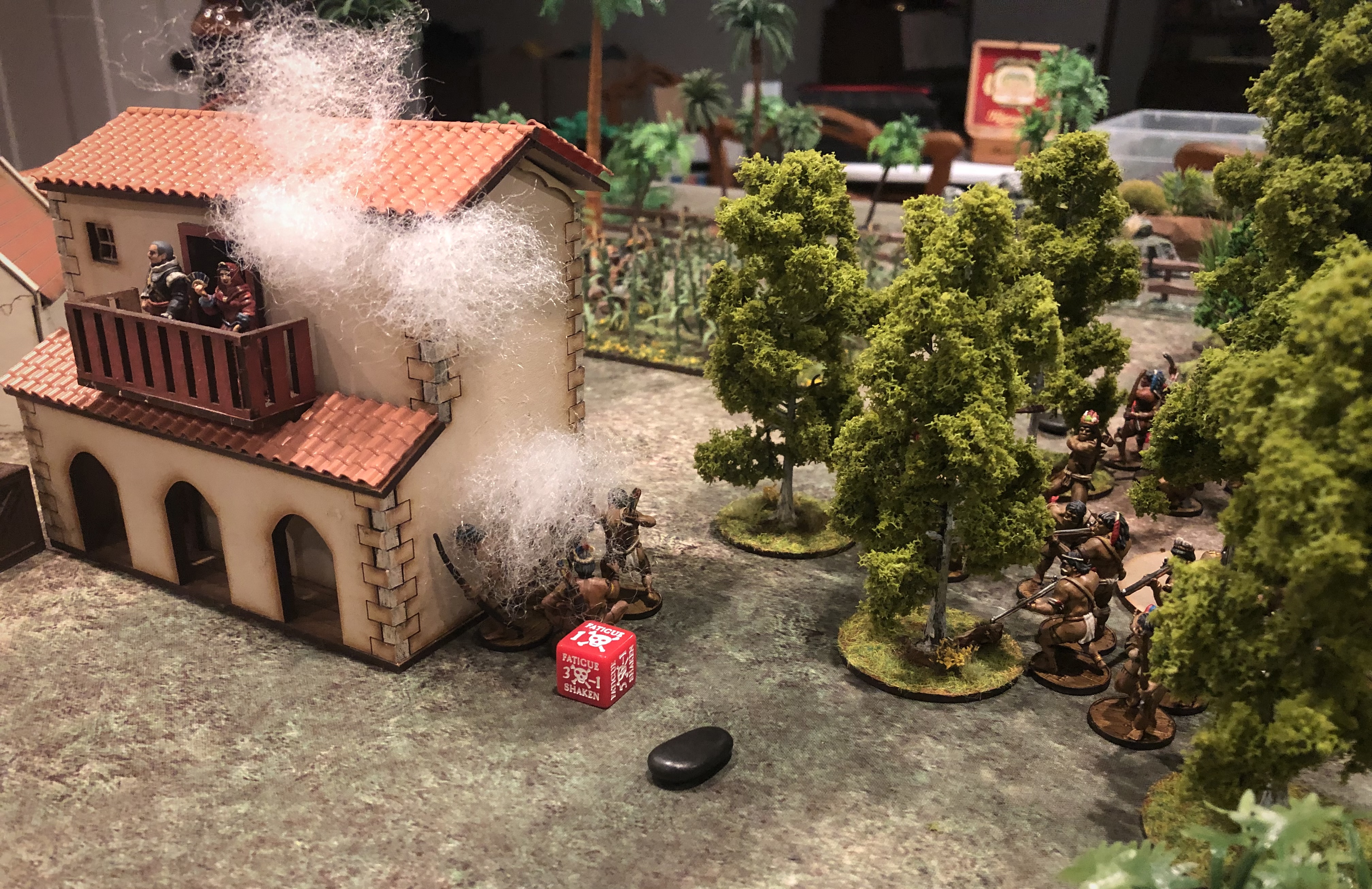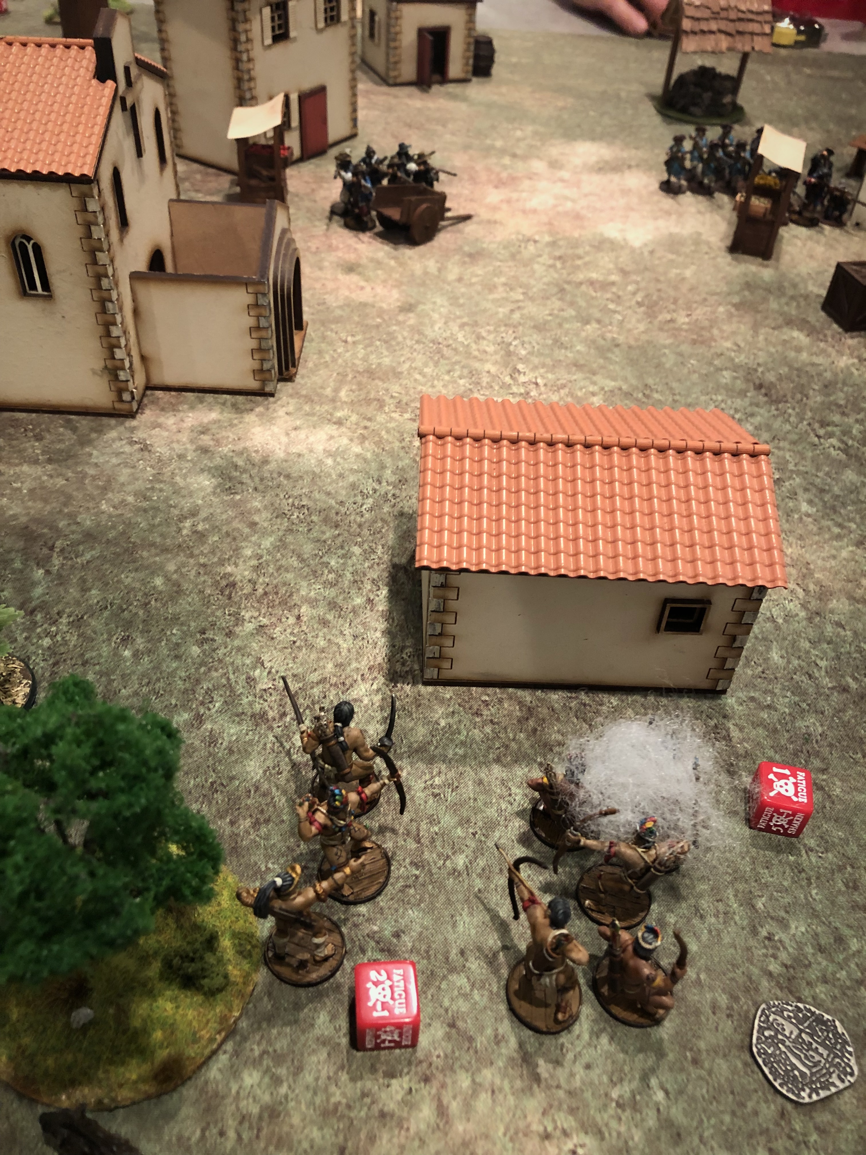 Even with two fatigue on them and reduced to 3 models, the Warrior Archers are able to get one hit at 14″ and apply more Fatigue to the Spanish!