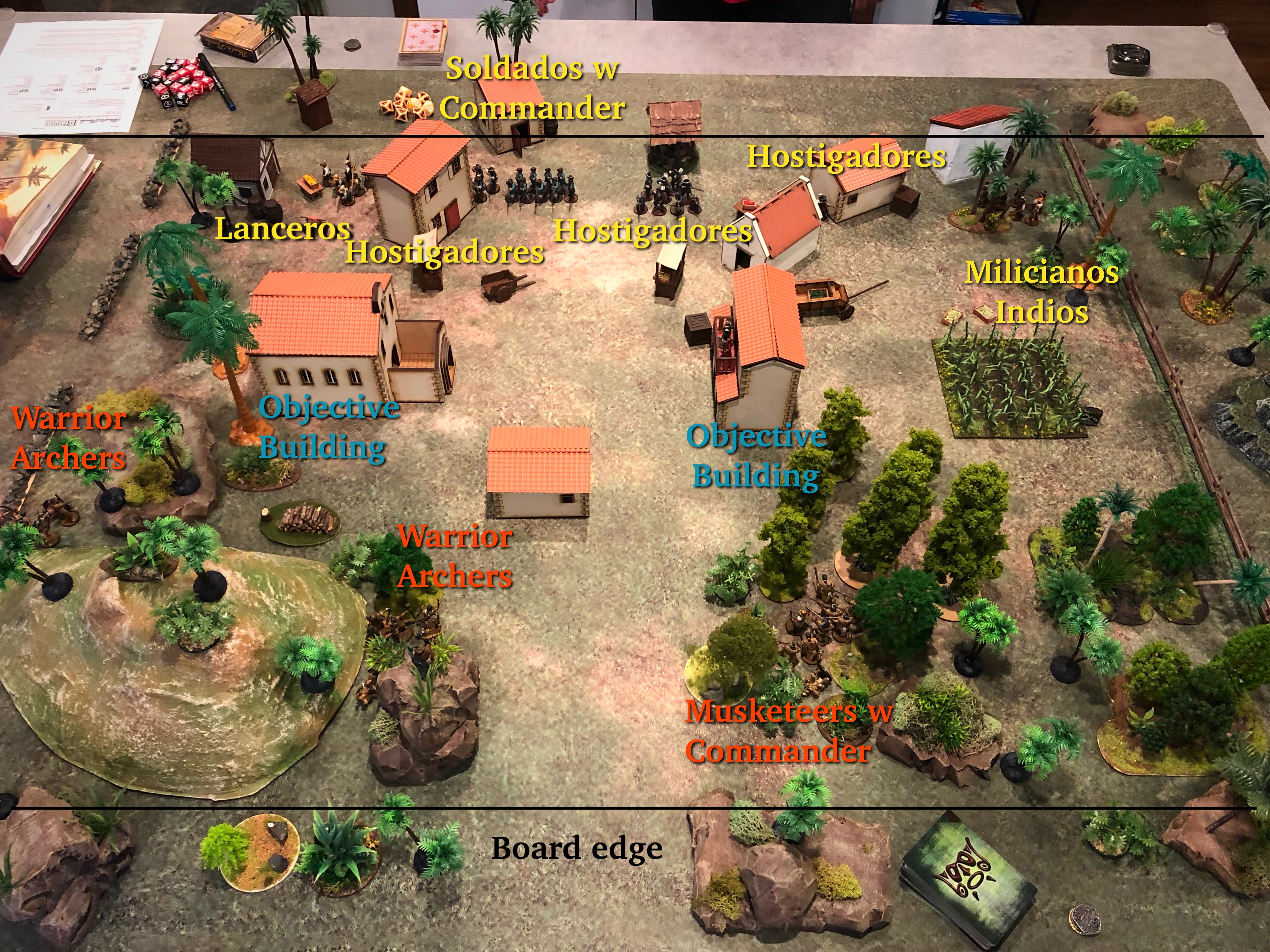 Bryan moved his Indios and Lanceros up and I continued to move units up and onto the board over the rest of turn 1.
