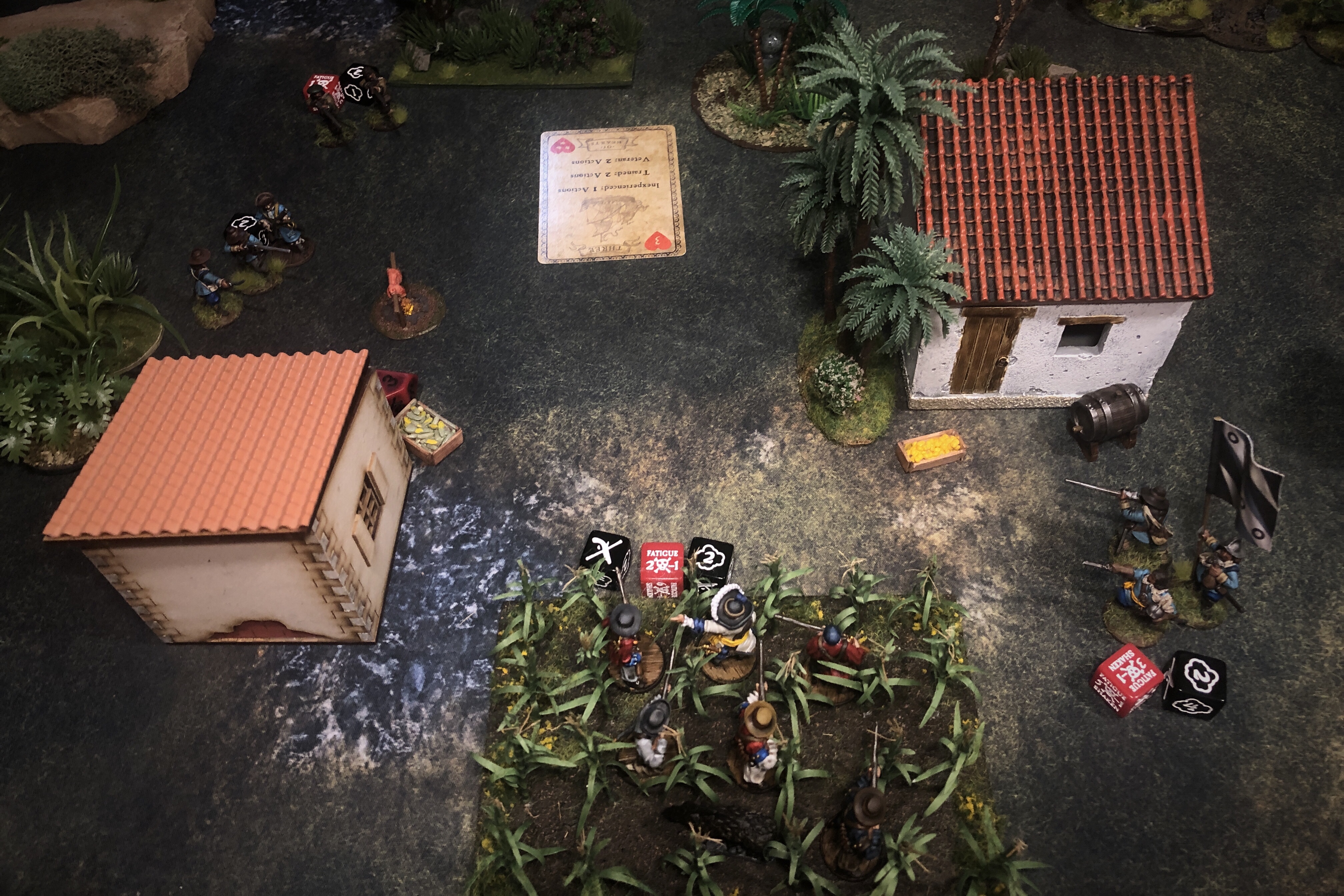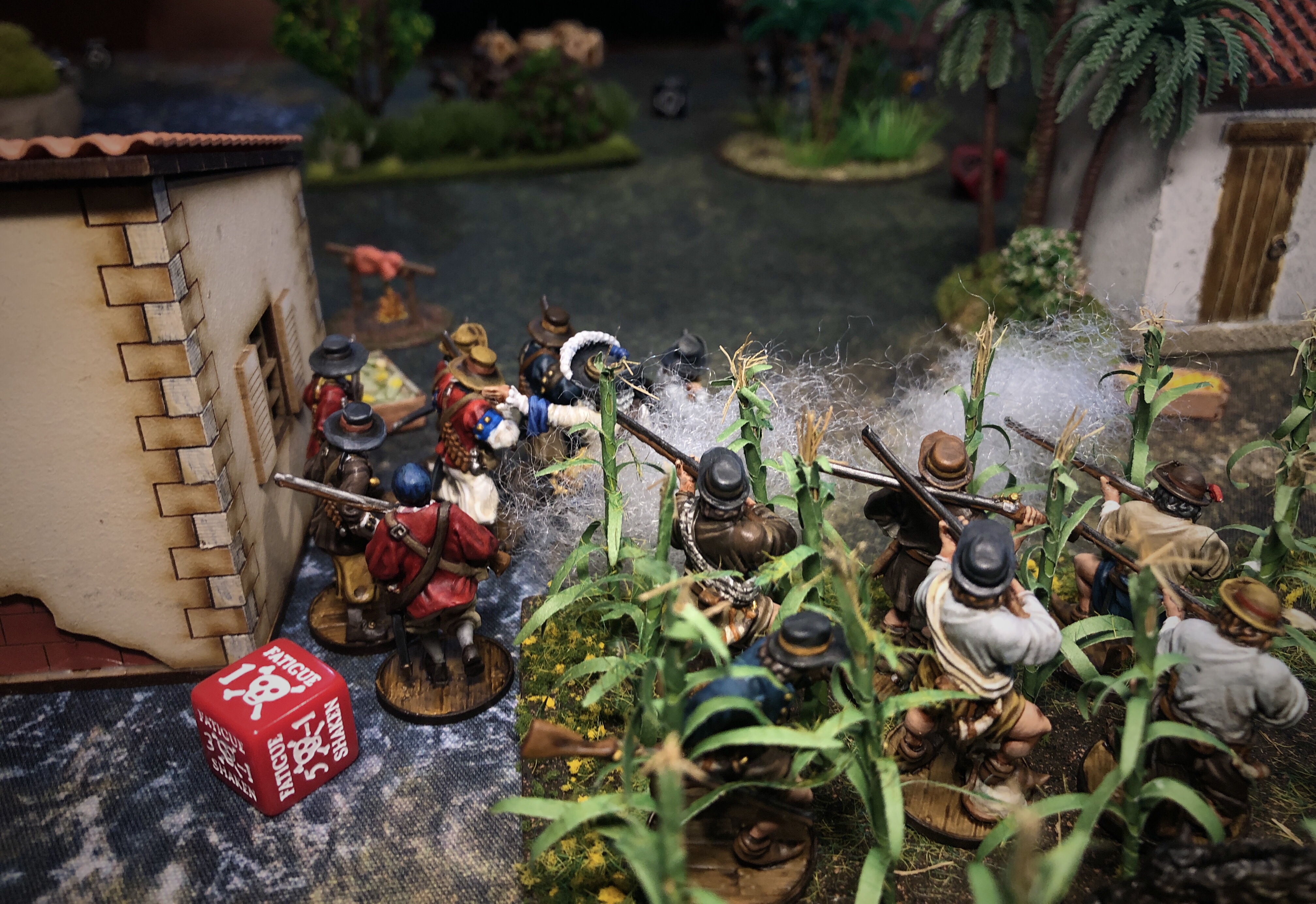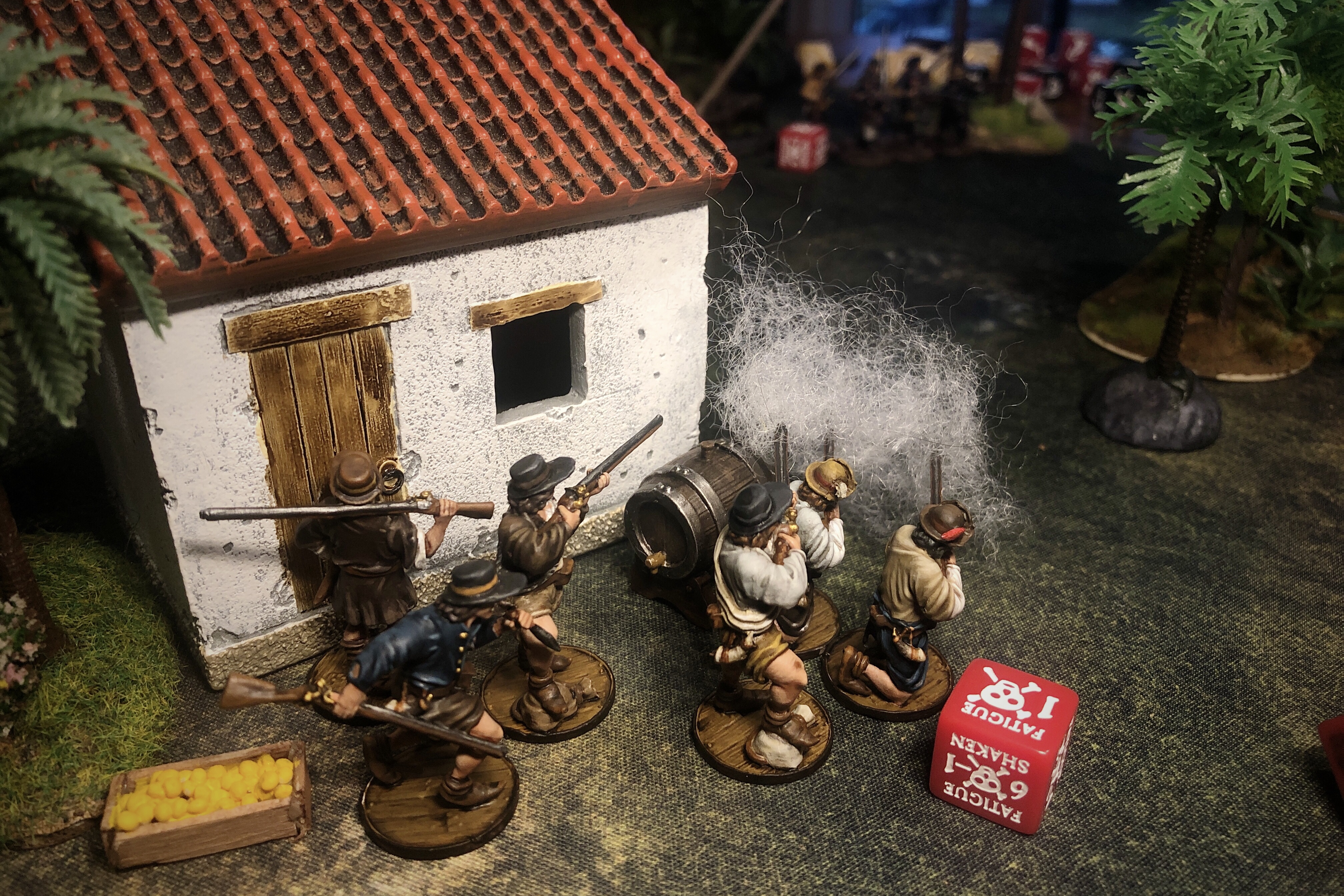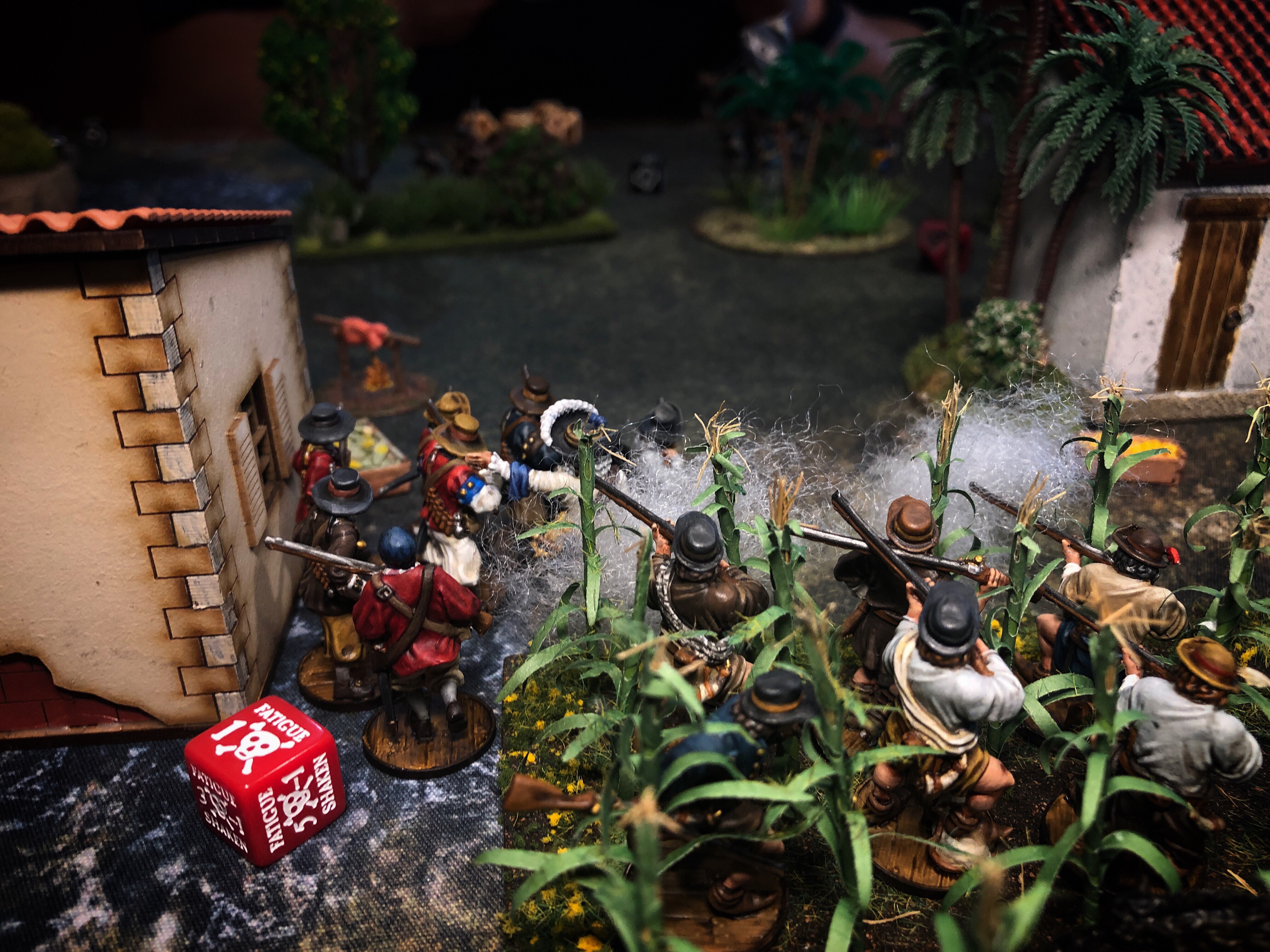Greedy for the Prize and hoping to stop the Militia advancing on my Fatigued Engages, I advanced my Boucaniers up to the second structure, fired a half shot into the militia and killed two of them by applied no Fatigue. I needed that Fatigue so they couldn’t charge the Engages!