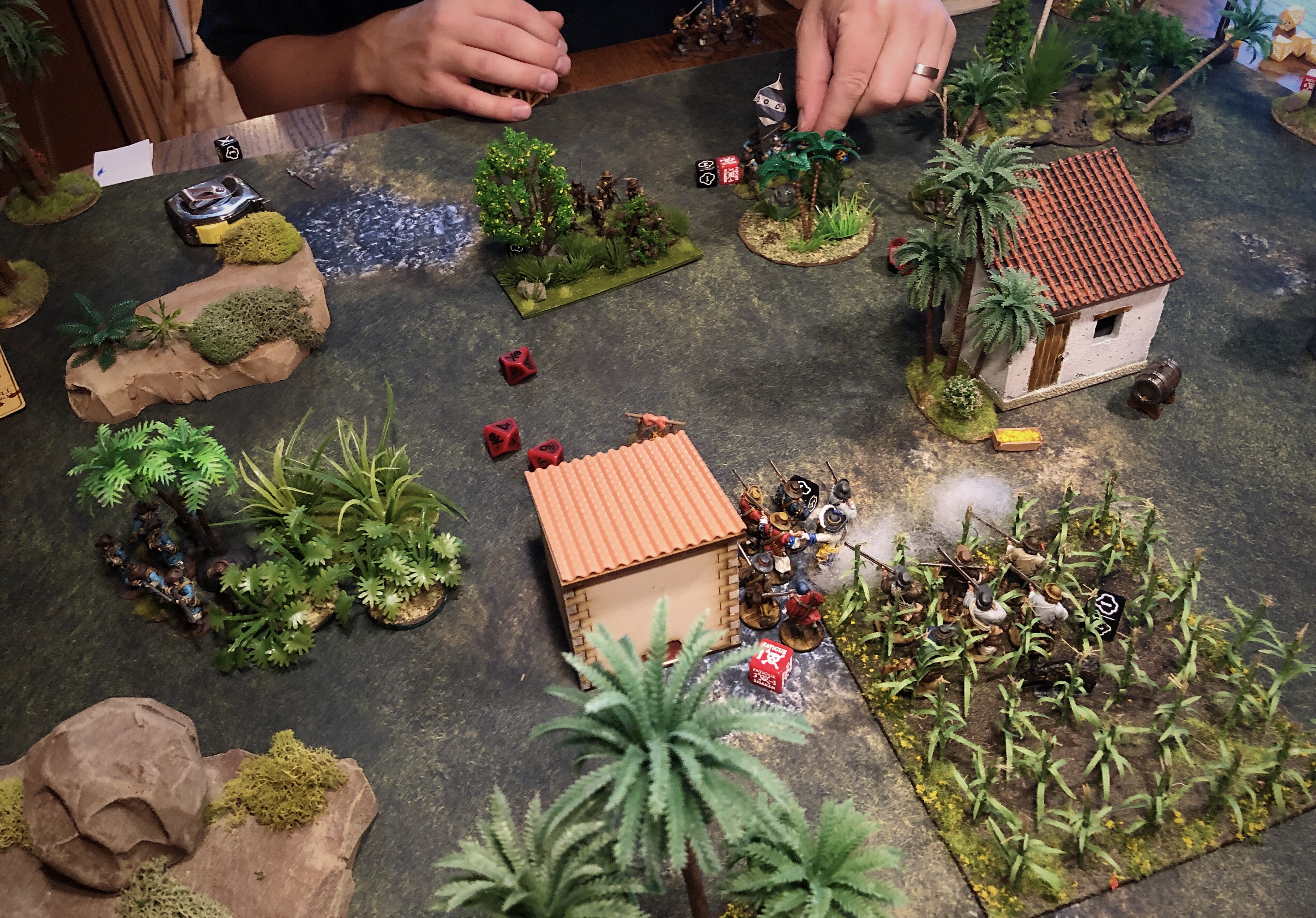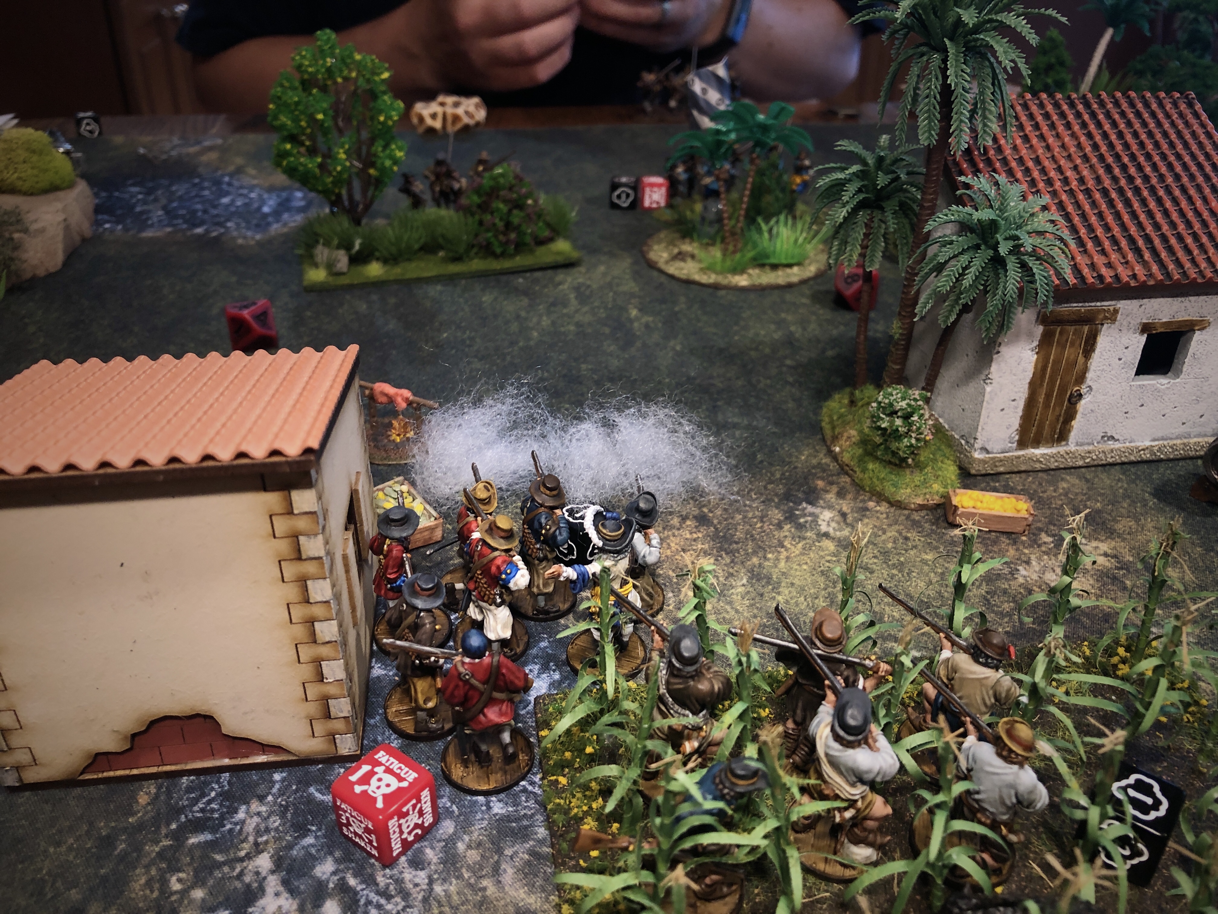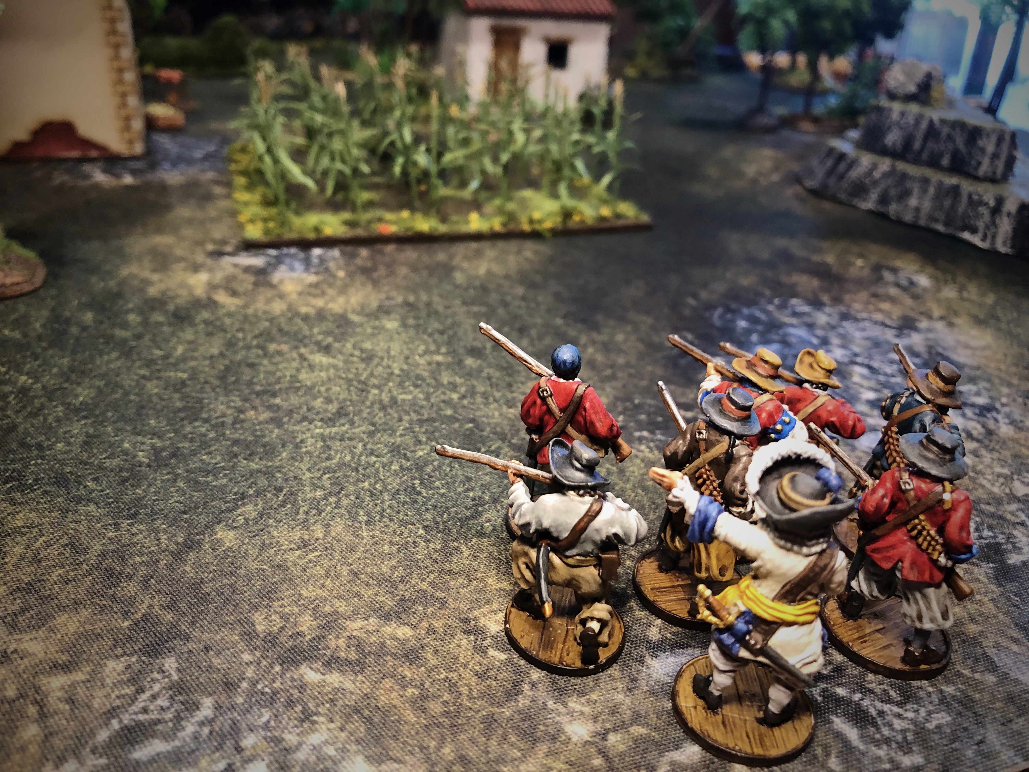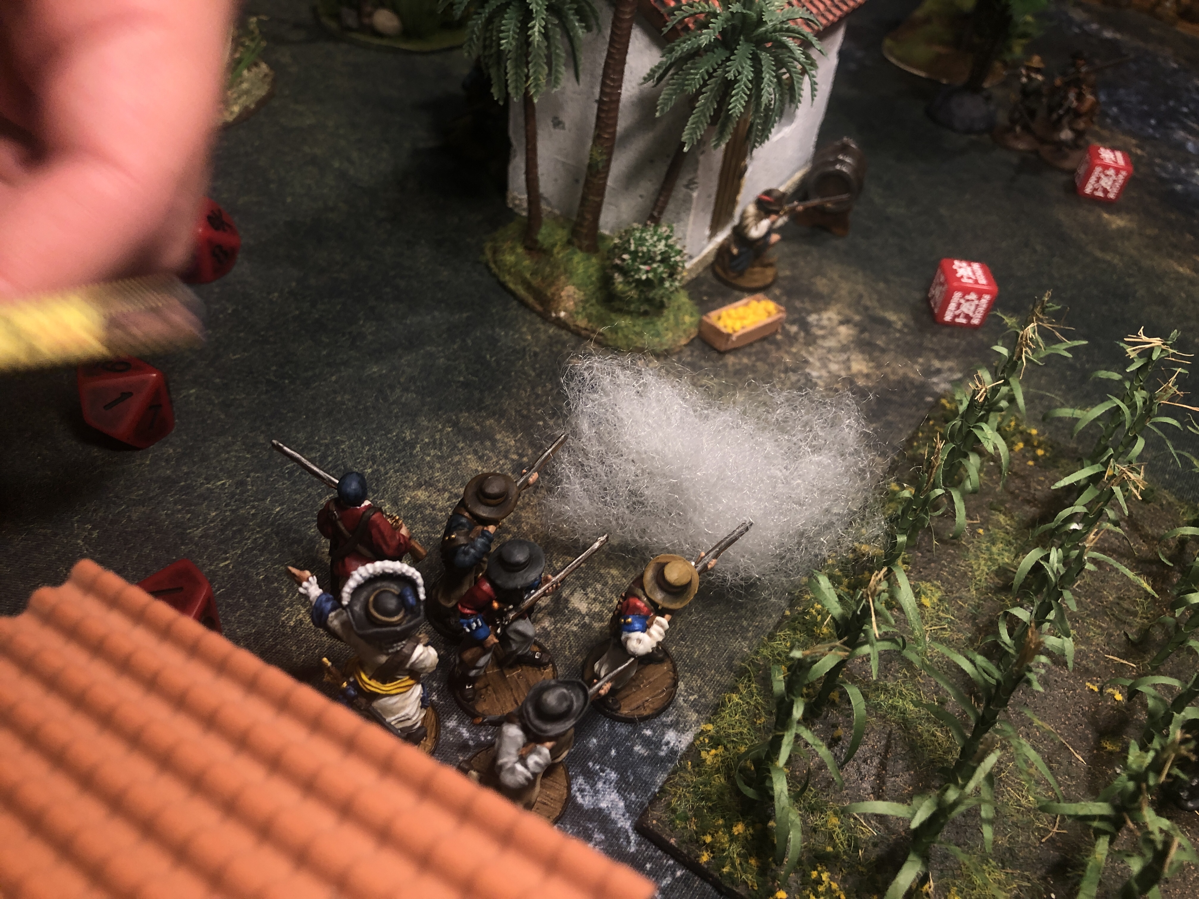 Greedy for the Prize and hoping to stop the Militia advancing on my Fatigued Engages, I advanced my Boucaniers up to the second structure, fired a half shot into the militia and killed two of them by applied no Fatigue. I needed that Fatigue so they couldn’t charge the Engages!