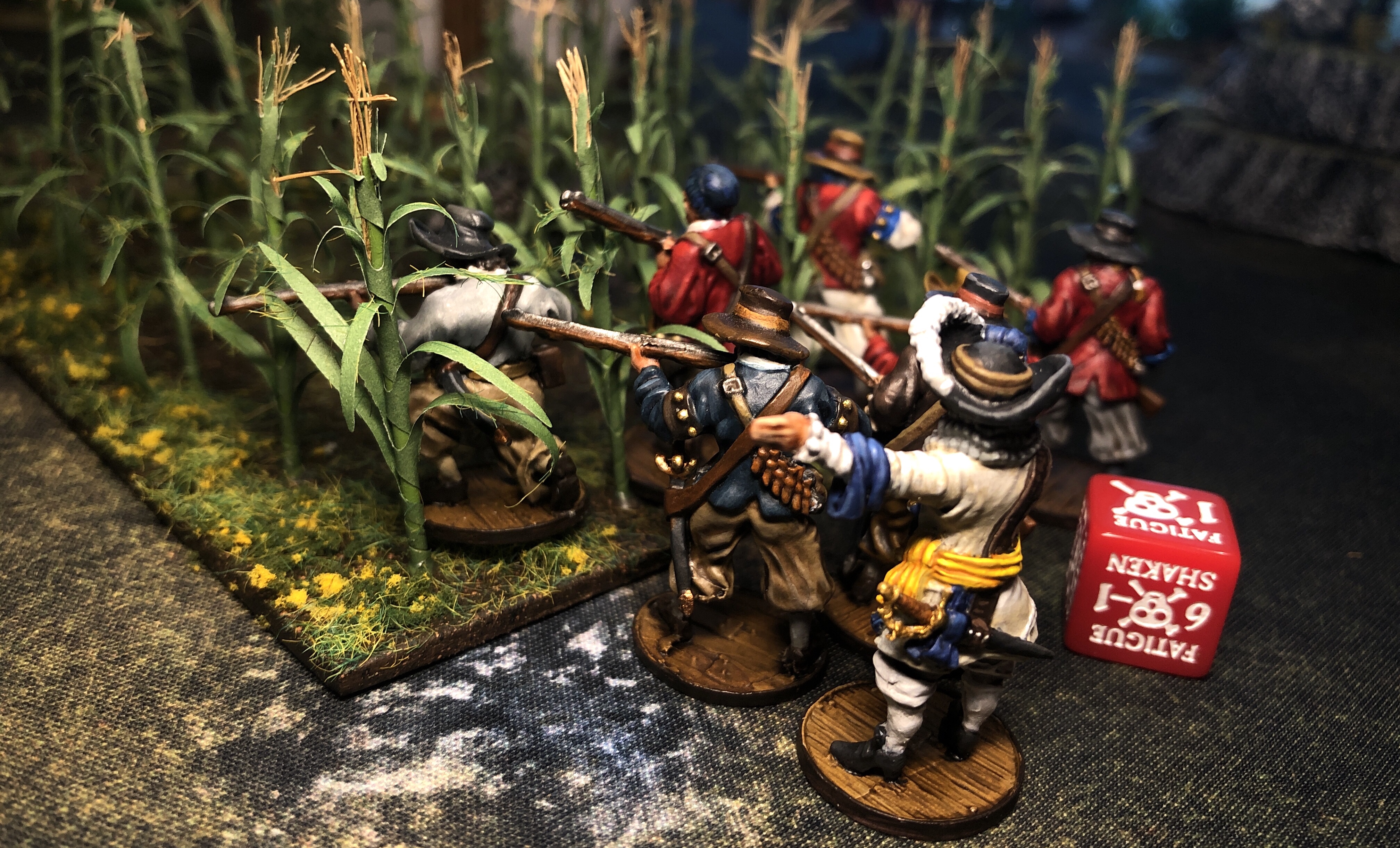 Turn 2 opened Bryan failing his Reserve roll for his 4th unit. My Boucaniers moved up 7″ into the cornfield and fired another half shot which drew the first blood by killing two models in the Portuguese command unit.