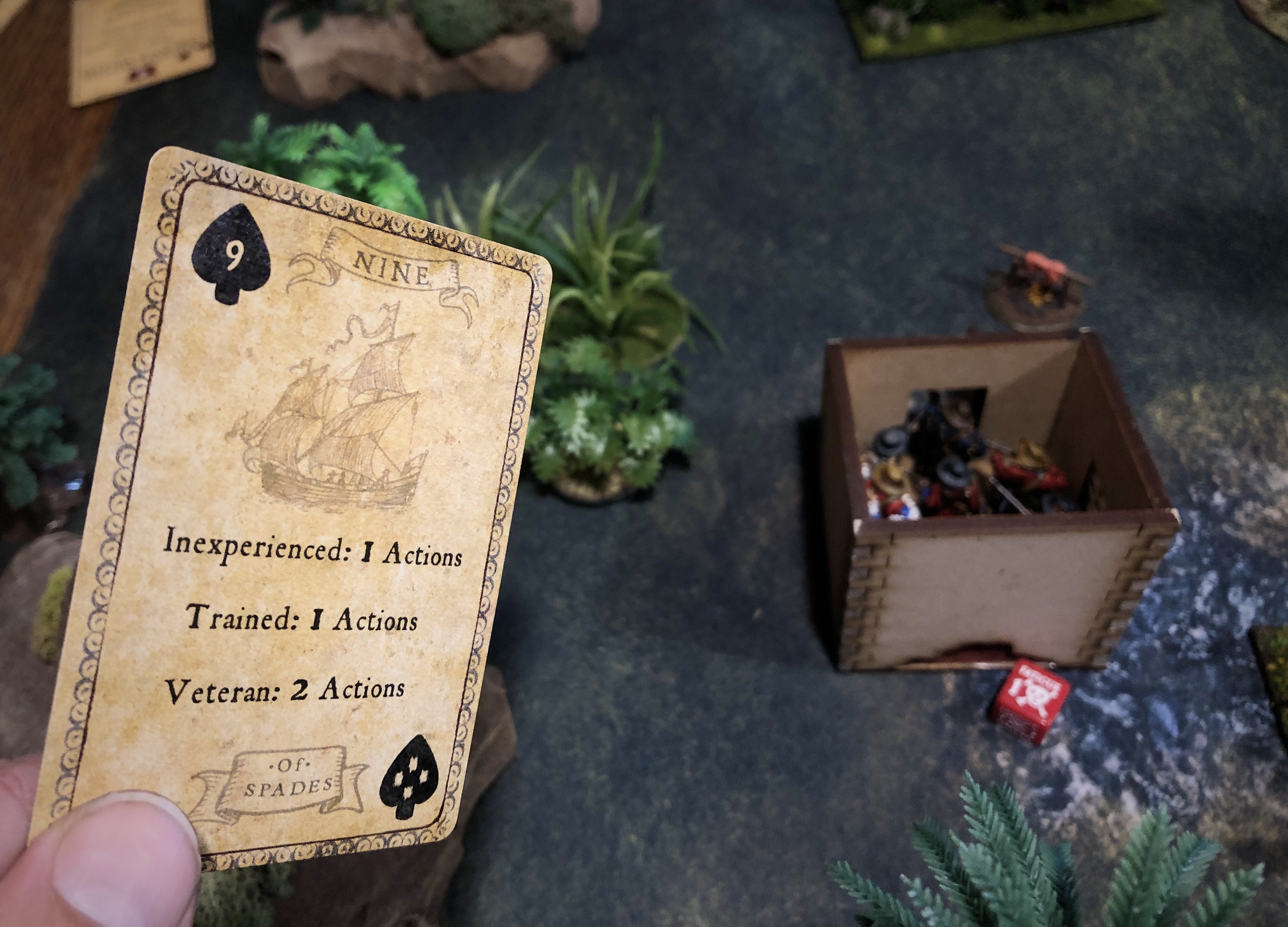 Bryan succeeded on his Reserve check before turn 3 and drew a fourth activation card. Turn 3 opened with my Freebooters in the open so I wanted to take initiative. I had seen Bryan use his 11 and 13 of Spades on the first turn so I was fairly confident my 9 of Spades would give me the first activation so