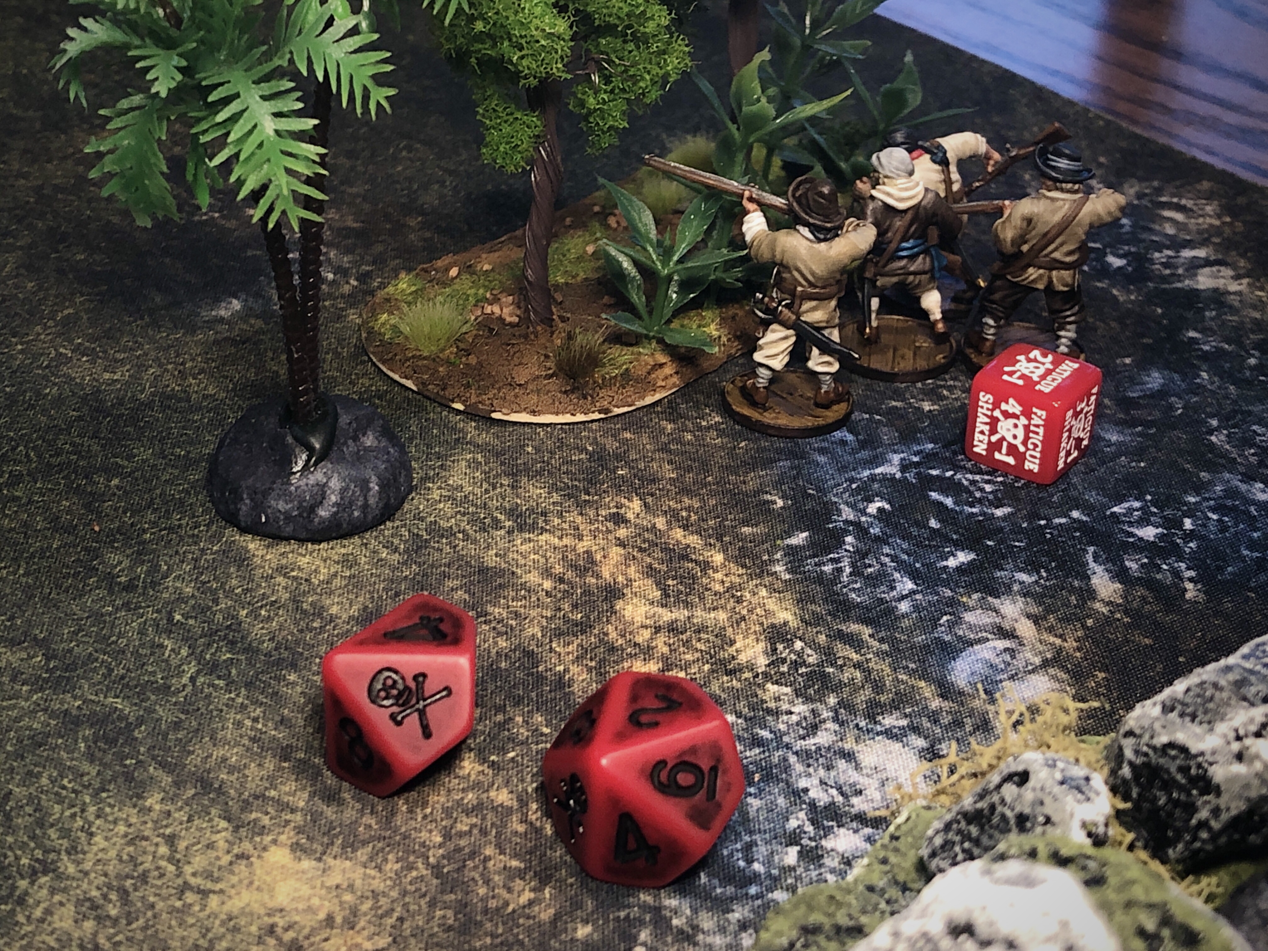 I opened turn 4 with a full volley from the Freebooters which landed 5 hits on a unit of 5 European Militia. They Saved two models and took 3 Fatigue which sent them back 4″ and took some pressure off my Freebooters. Fast Reload was extremely helpful to me in this game as I drew a lot of Spades and 2 of my three units had that ability.