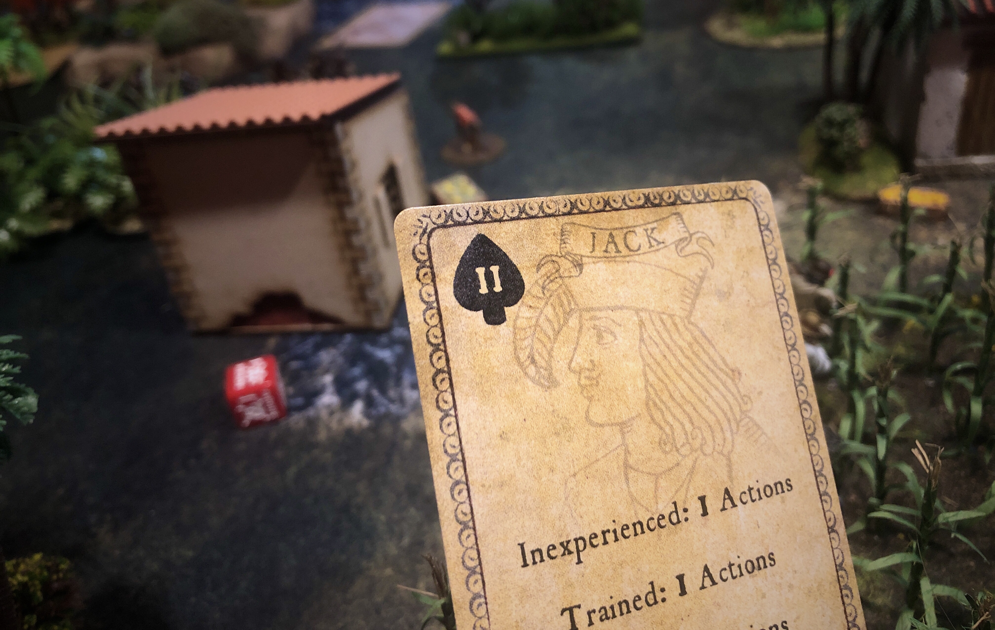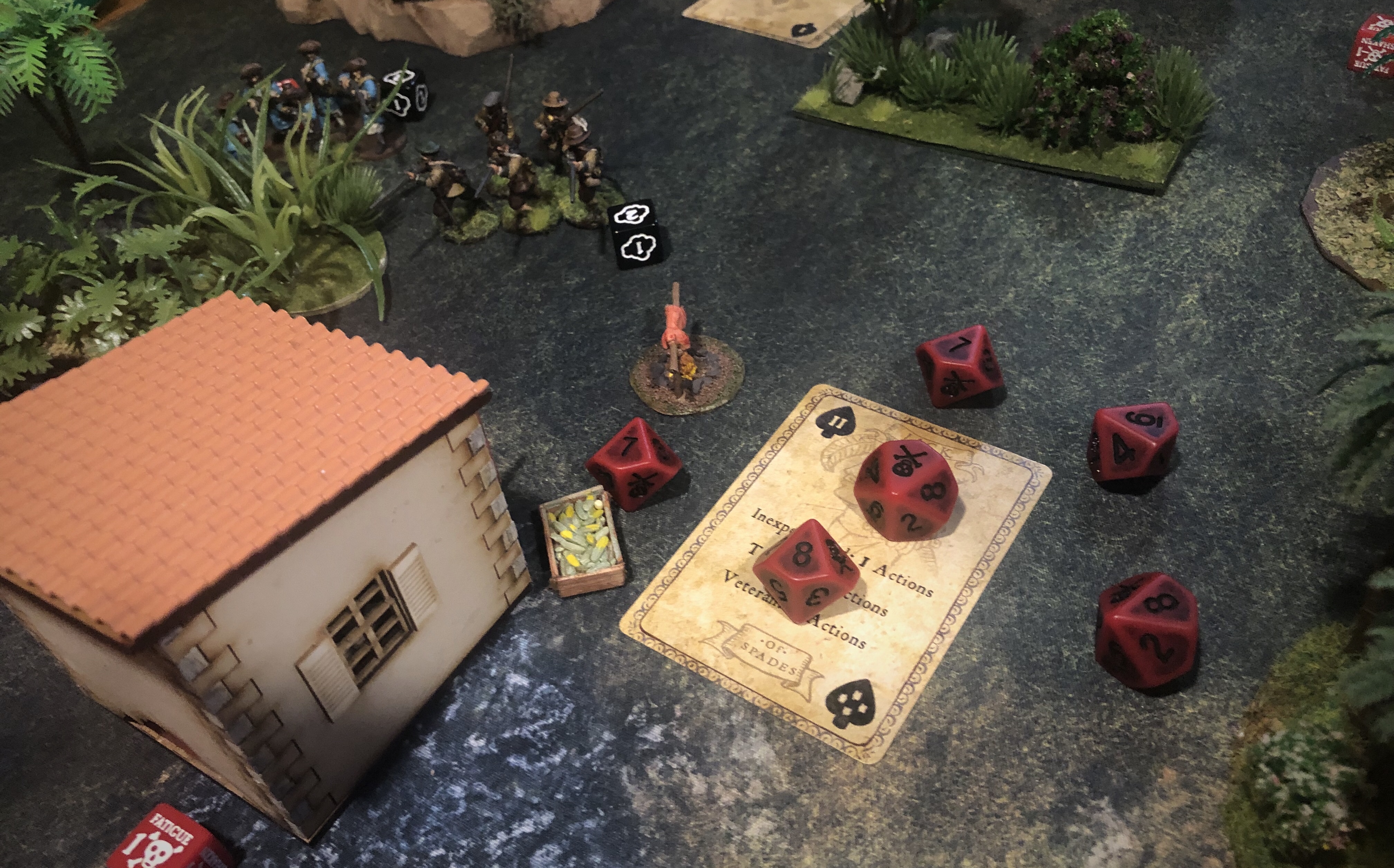 I started the game with a Move-Half Shoot-Move activation with my Boucaniers. My target number was 9 but I failed to get any hits. Bryan drew all Spades for his opening hand which isn’t great for a first turn with all Inexperienced troops.