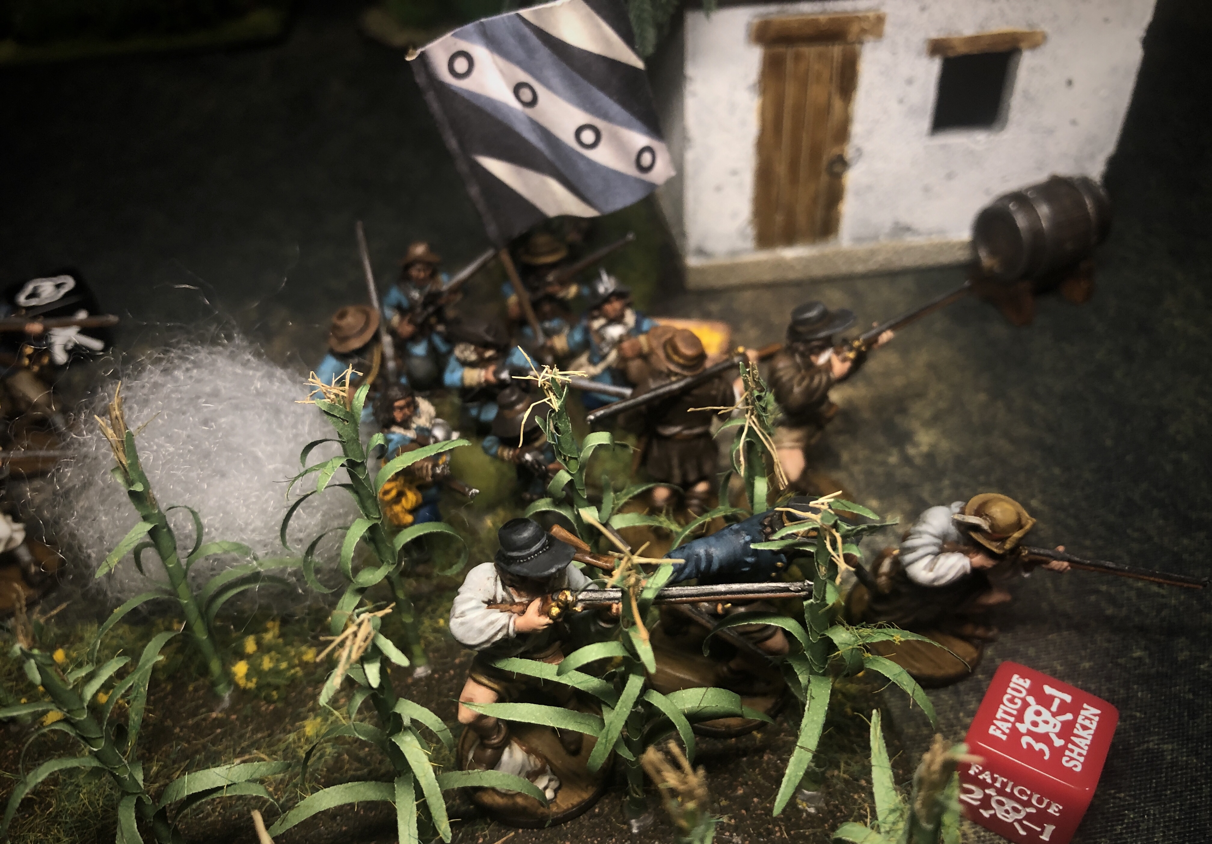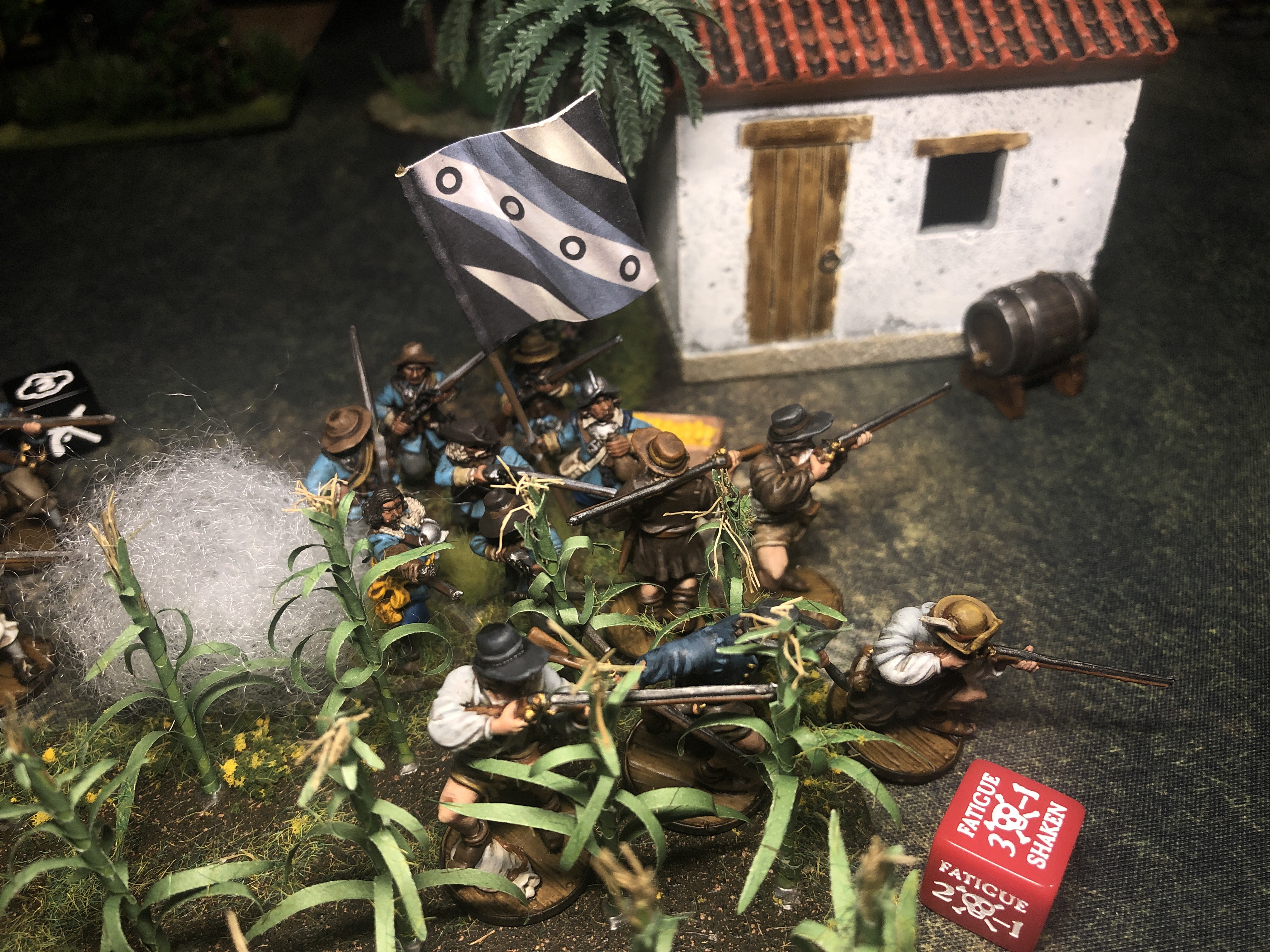 The Militia on my Right flank fired into the Boucaniers in the structure and they lost on model but failed both Resolve check which left them Shaken. They dropped the Prize and with no good options I had them run into the cornfield. I rallied them but they they were immediately charged again! With 3 Fatigue already on the Boucaniers the Portuguese command unit had no trouble killing every last elite French marksmen.