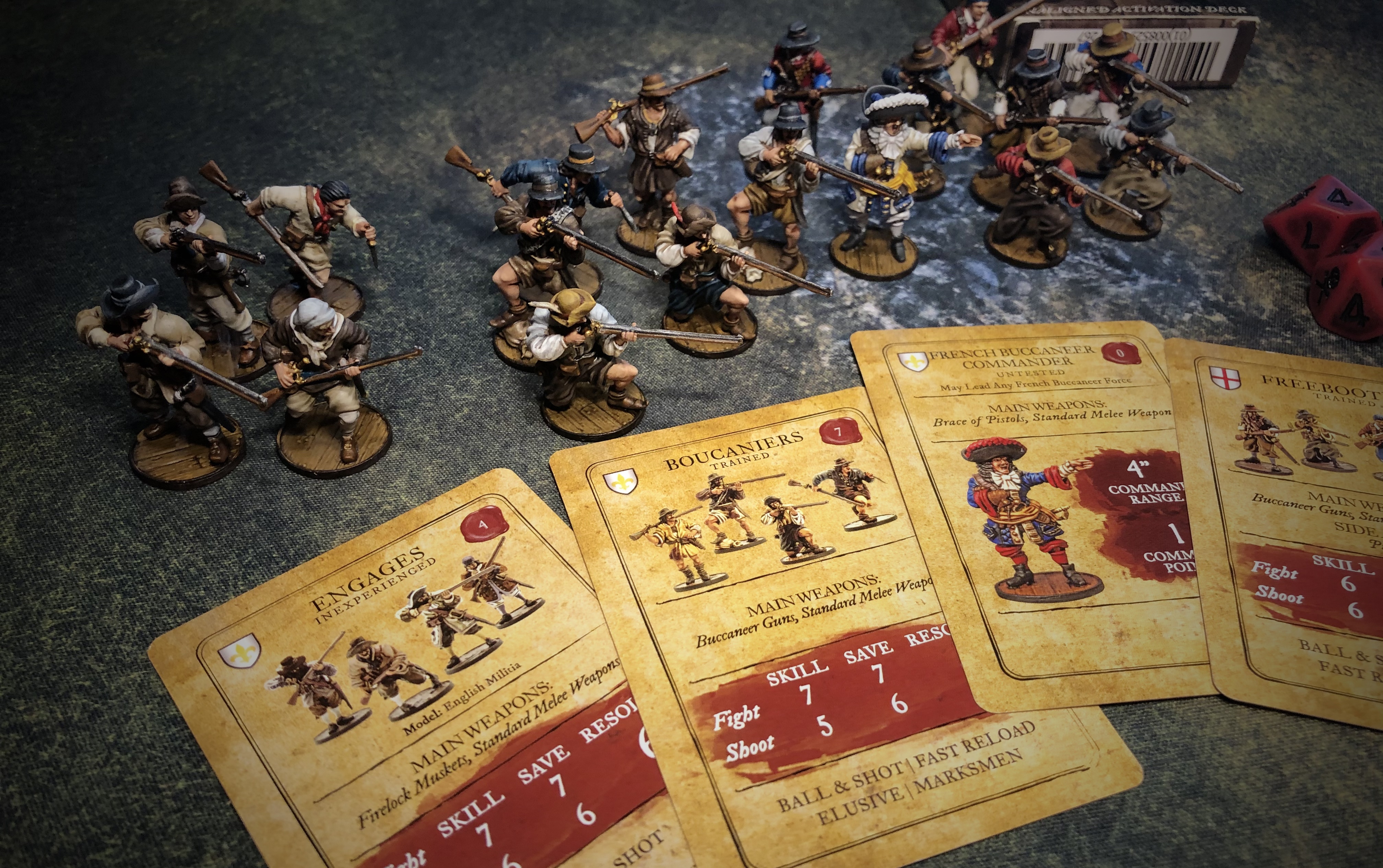 - 7 Freebooters with an Untested French Buccaneer Commander (with a Buccaneer Gun) attached.