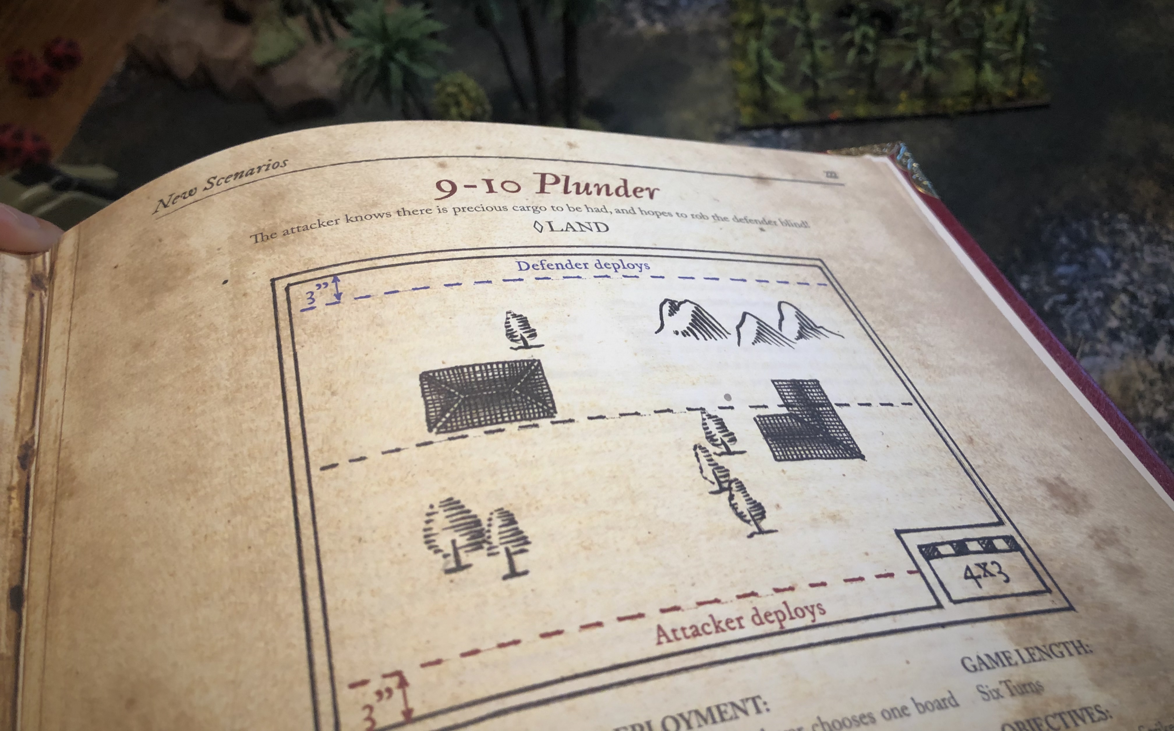 We played the Plunder scenario on land on a 3×3 board. In this scenario the Defender secretly selects one of the two structures in the center of the board to house the “prize.” The Attacker has to either be within 4″ of a structure that could contain the prize (if neither structure has been entered yet) or within 4″ of the building that actually contains the prize by the end of turn 3 or they gain a Strike Point. The Defender gains a Strike Point any time the Attacker has the Prize in their possession.