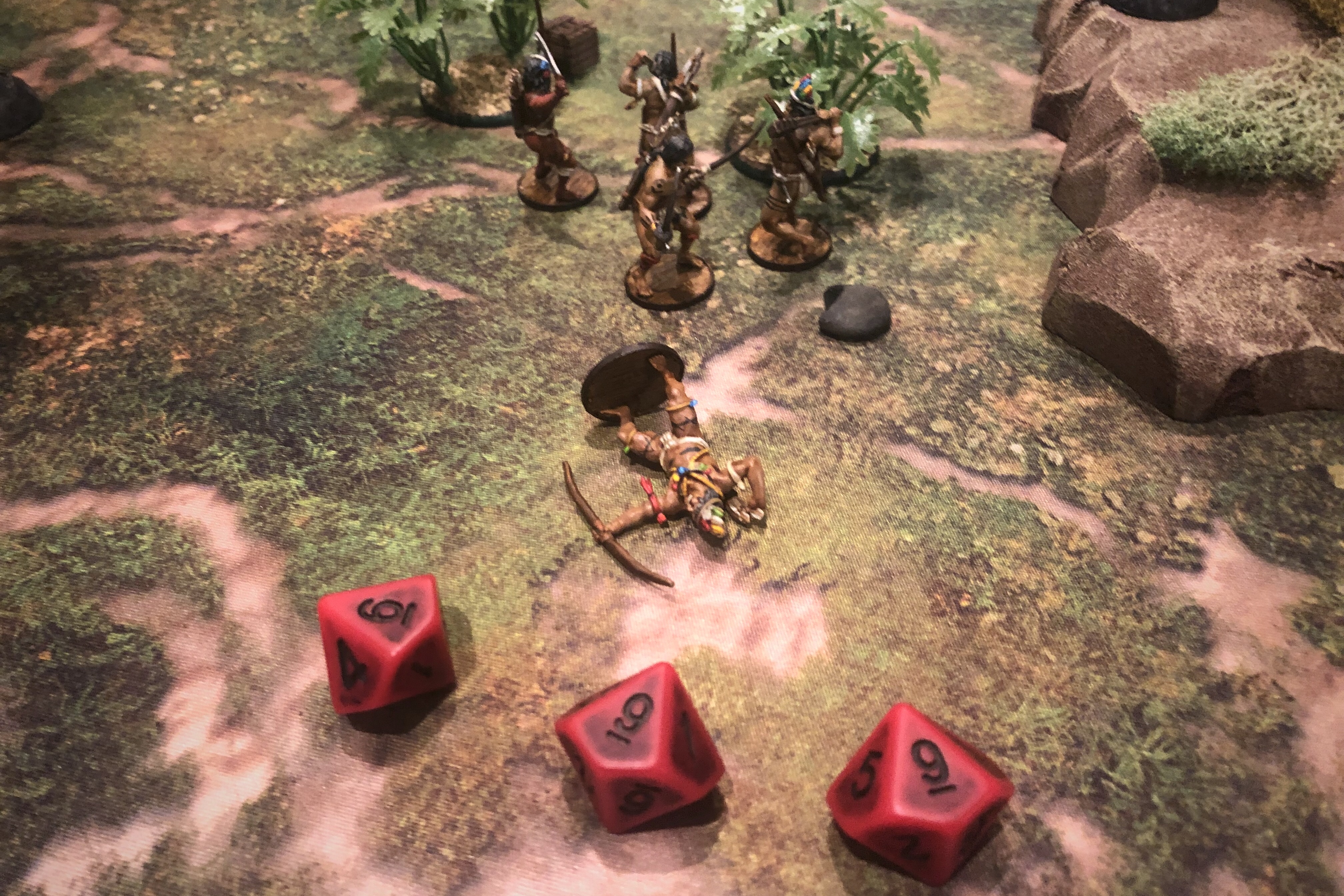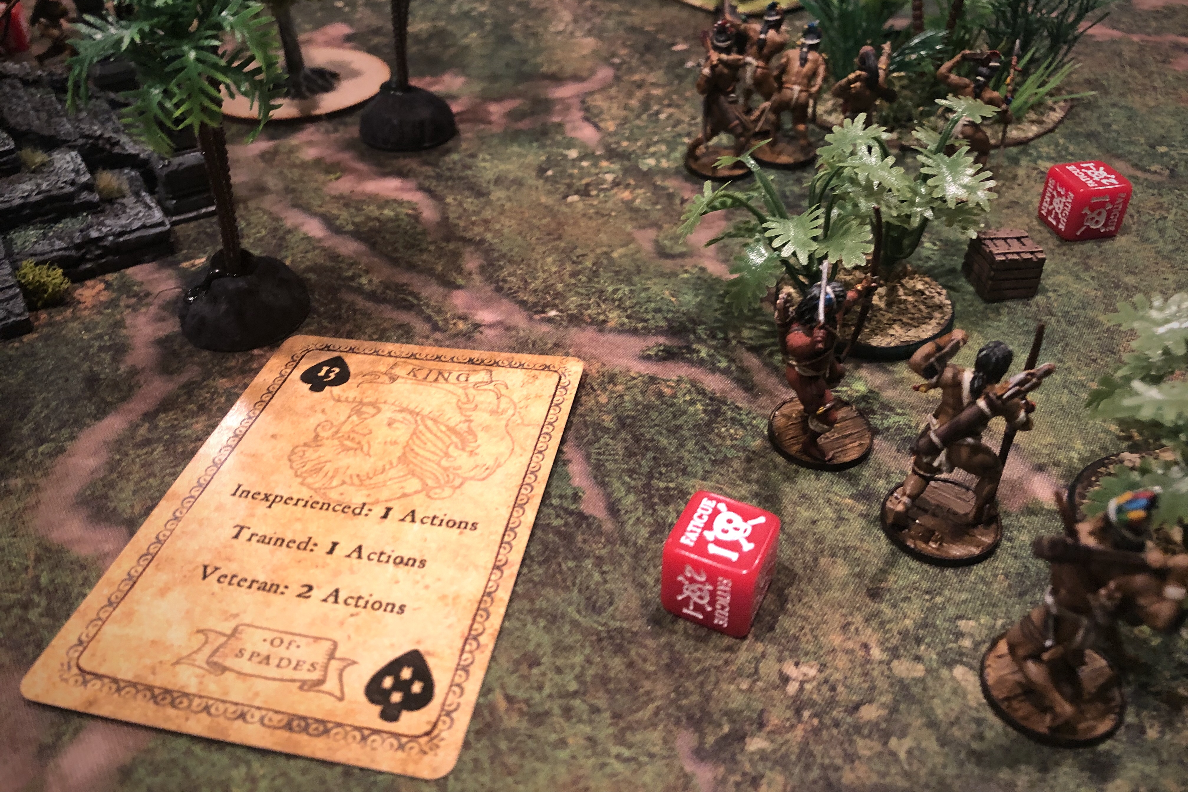 - It’s incredible what the Poisoned Arrows can accomplish. When I first read through the Native factions rules I was underwhelmed by the Poisoned Arrows ability but it increased Fatigue output by a huge margin. I’m not sure if Bryan’s dice are just cursed but the consistency of failure on that re-roll is kind of amazing. If the Saves were successful and there were no casualties he’d either take a Fatigue right away or always fail the re-roll. Mathematically I believe the Poison pushes the single Fatigue die looking for a 6 from a 50% chance of Fatigue to 75% but it felt more like 90% in practice. And if the French rolled a 1 for their Saves, which happens when you’re rolling so many Saves every turn, it seemed that there was always a failed Resolve die and a success which always turned into a fail.
