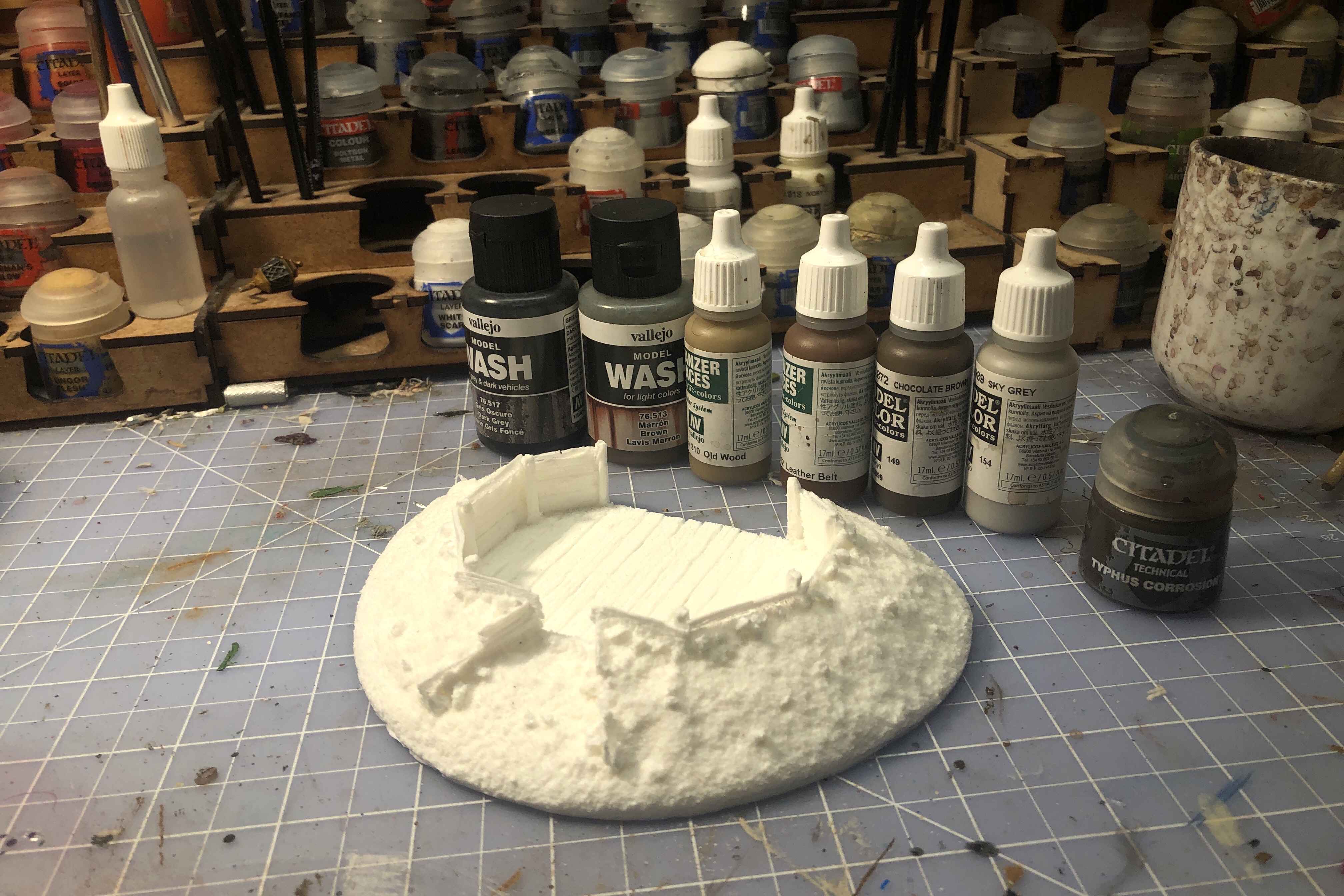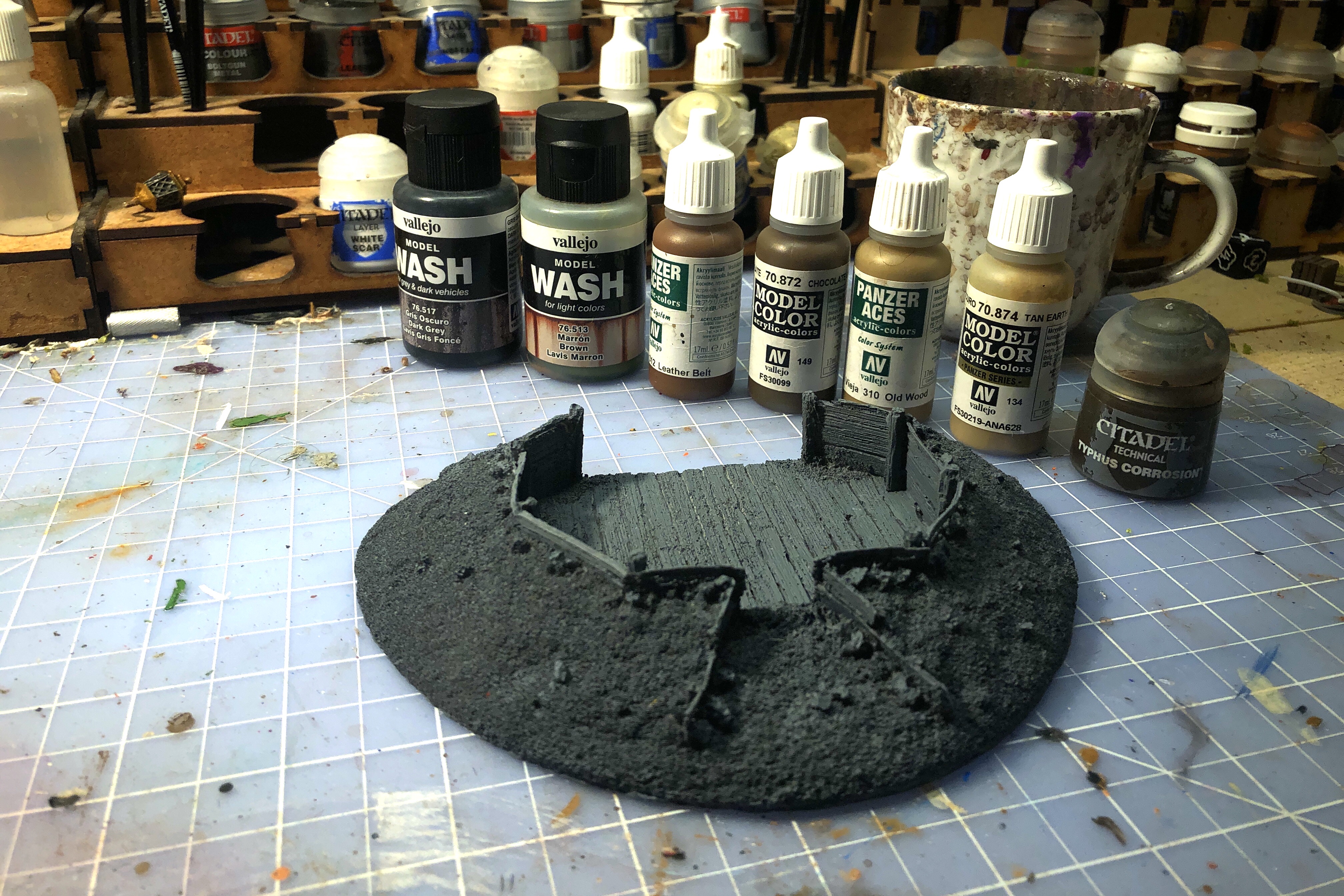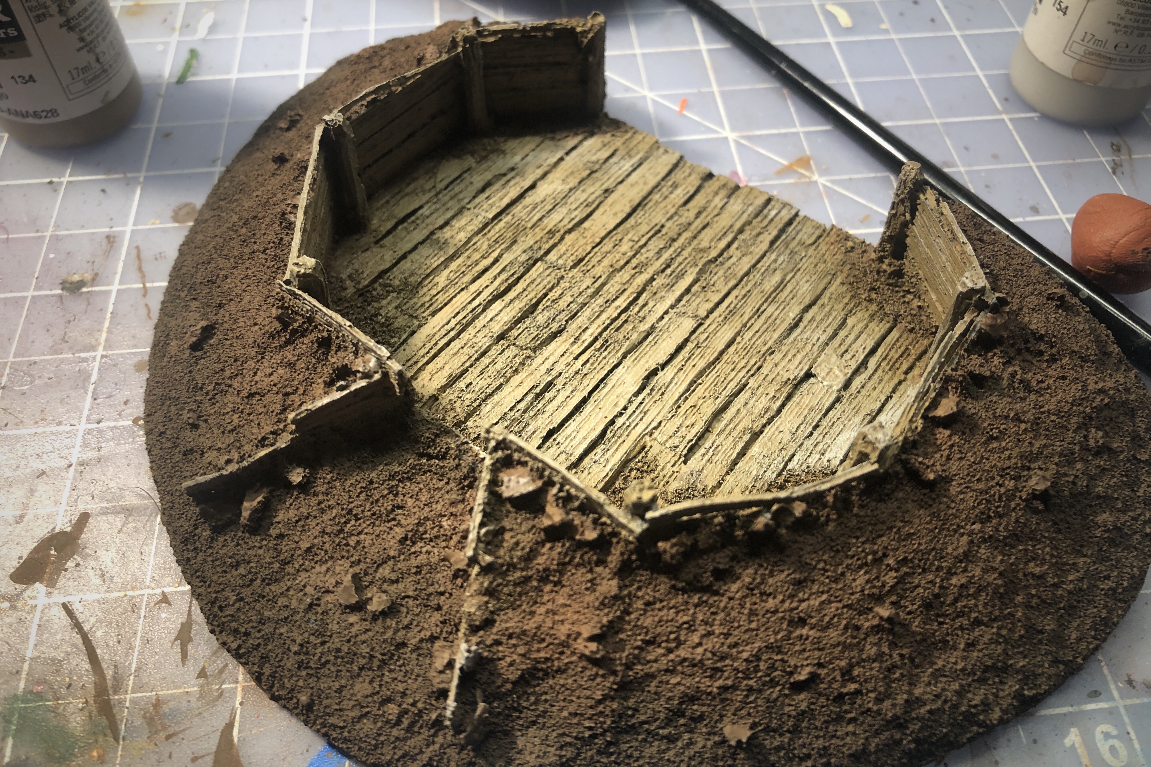 Then I used the Old Wood paint again to apply some light dry brushing to the dirt areas, mostly hitting the larger clods and upper regions of the fortification. I also hit the dirty areas within the walled area.