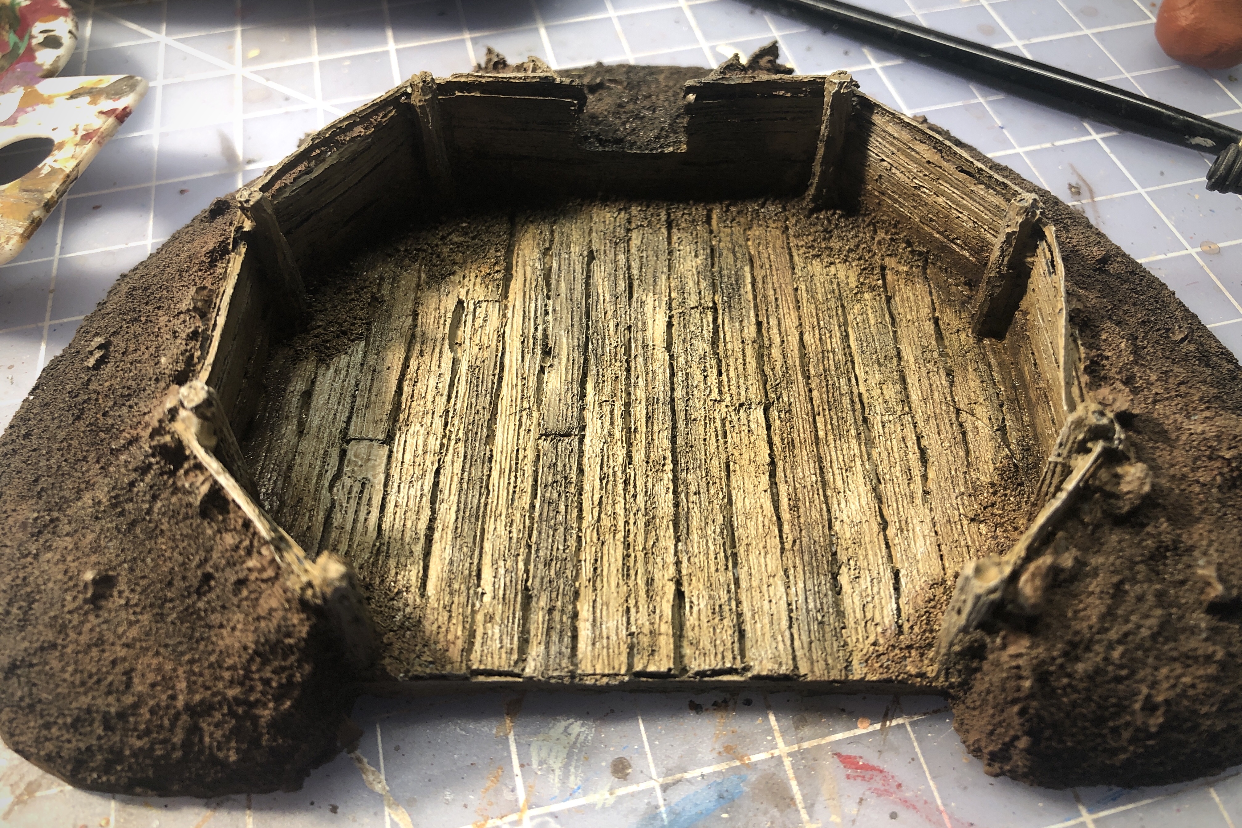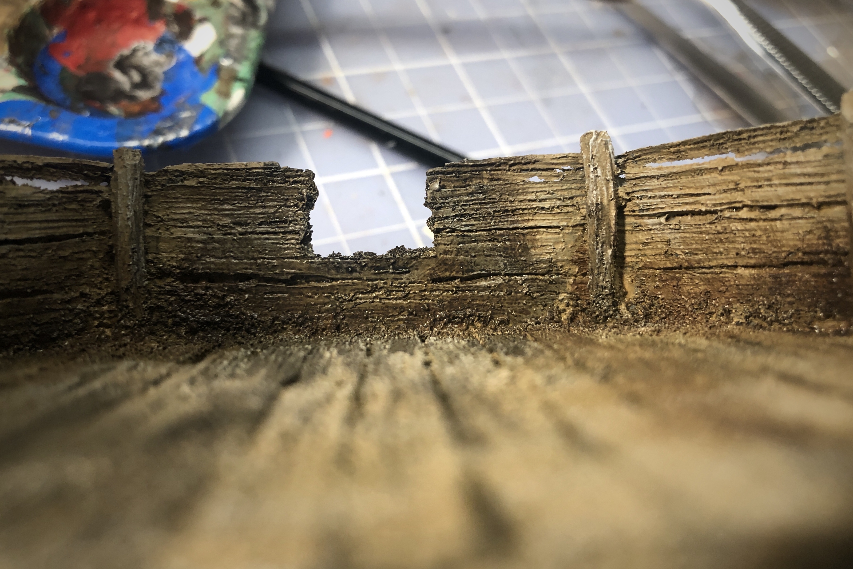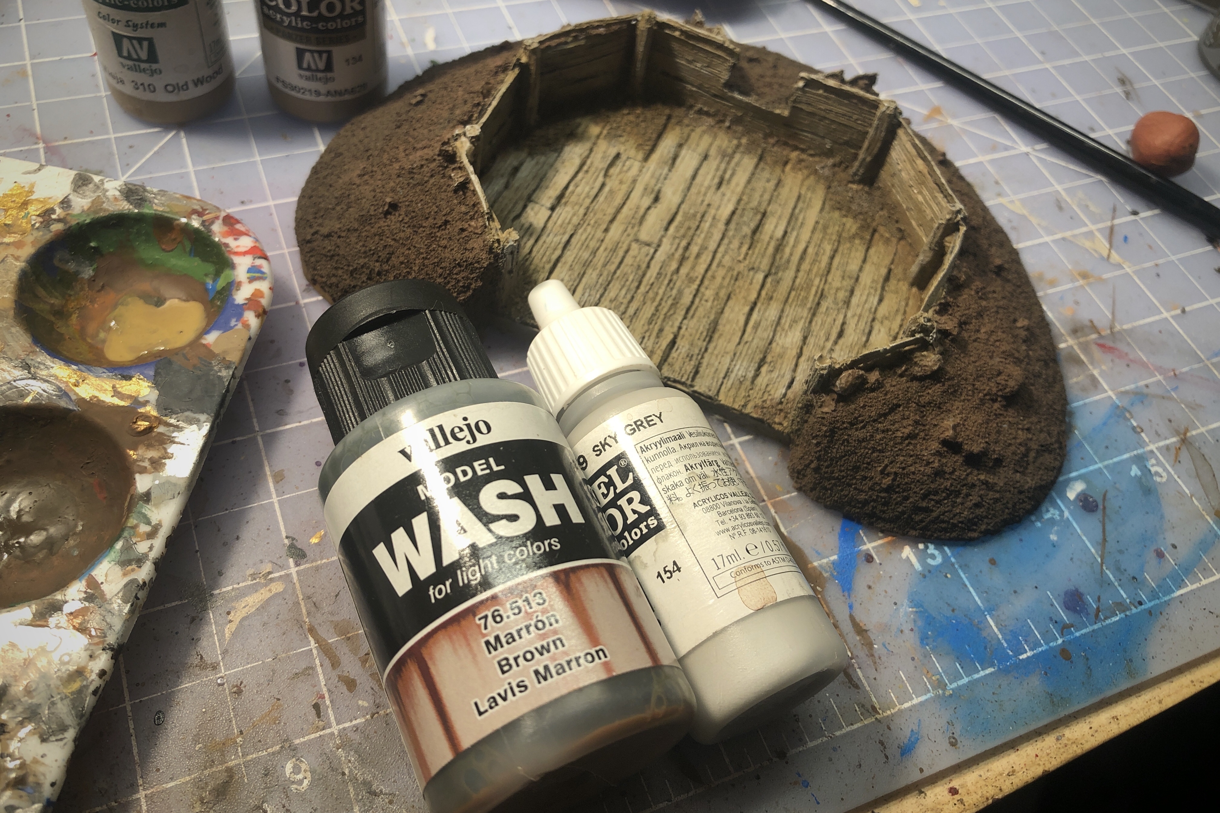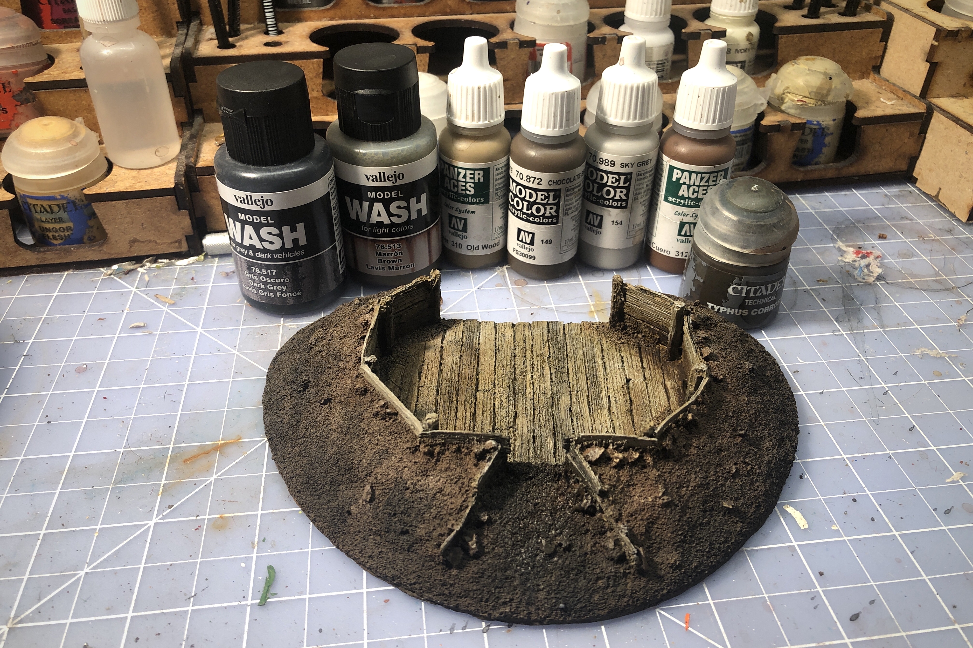I’m trying to branch out in my paint selections so I’m making myself try the Vallejo washes. I covered the entire wood area with this Brown wash, let it completely dry, then applied a light drybrush of Sky Grey to all the boards.
