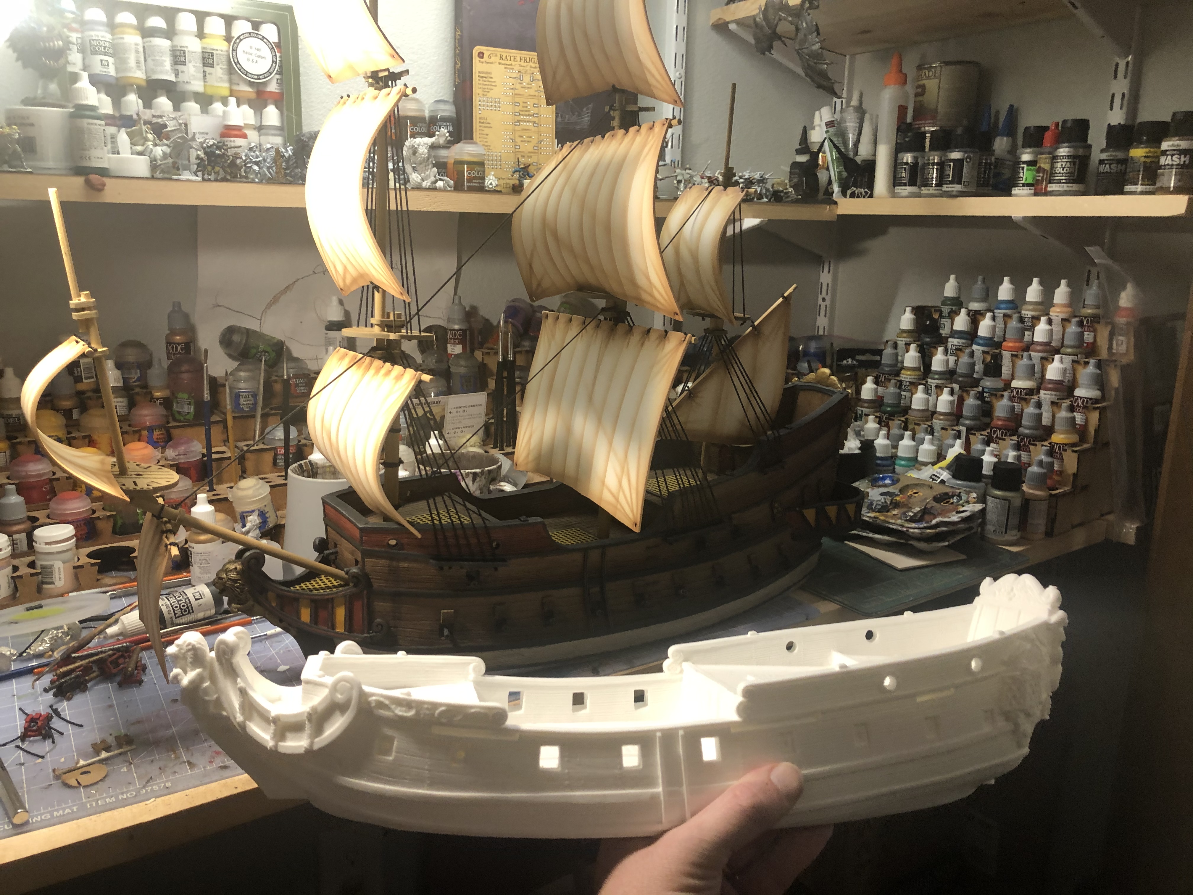 Here’s the new 6th Rate Frigate hull compared to the Galleon. It’s almost as long but much lower to the water and much less surface area to paint which means it shouldn’t be as much work to finish!
