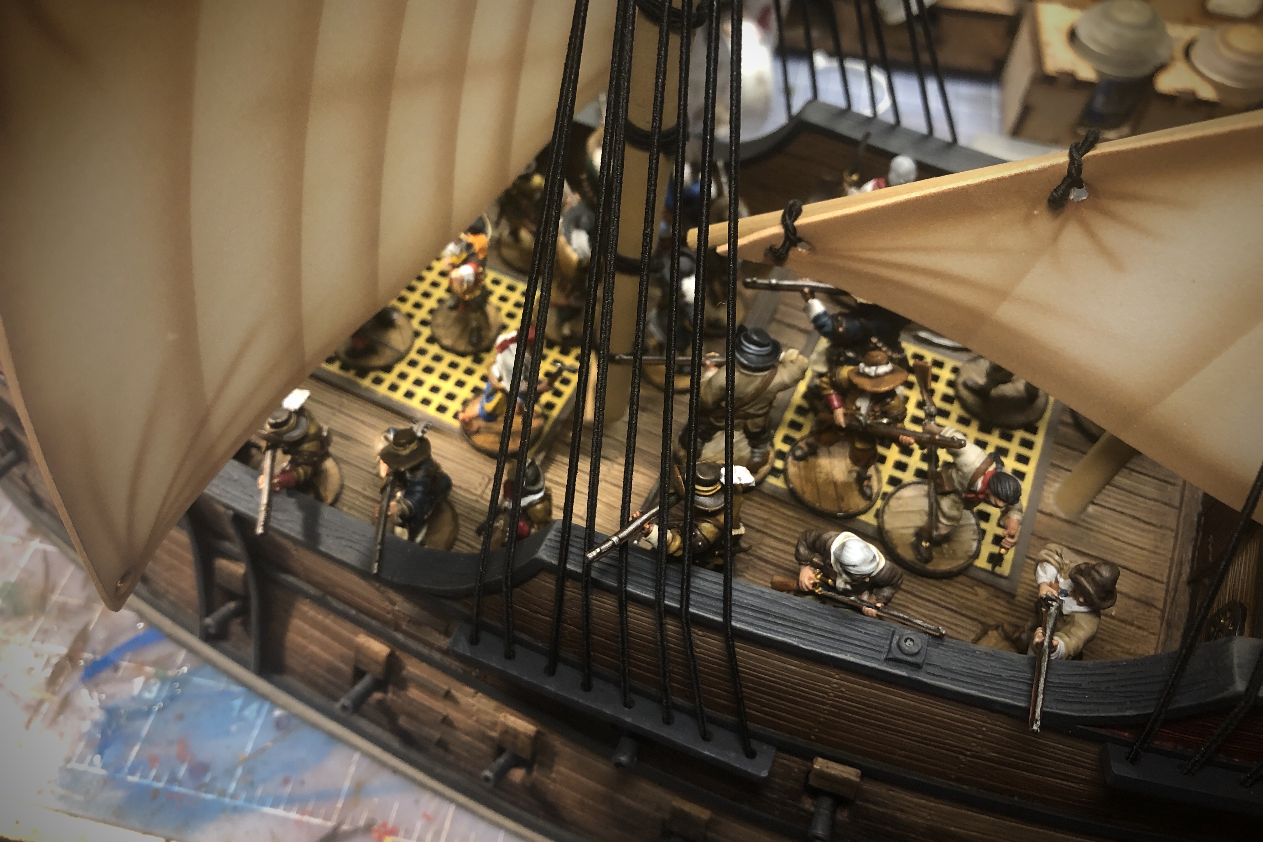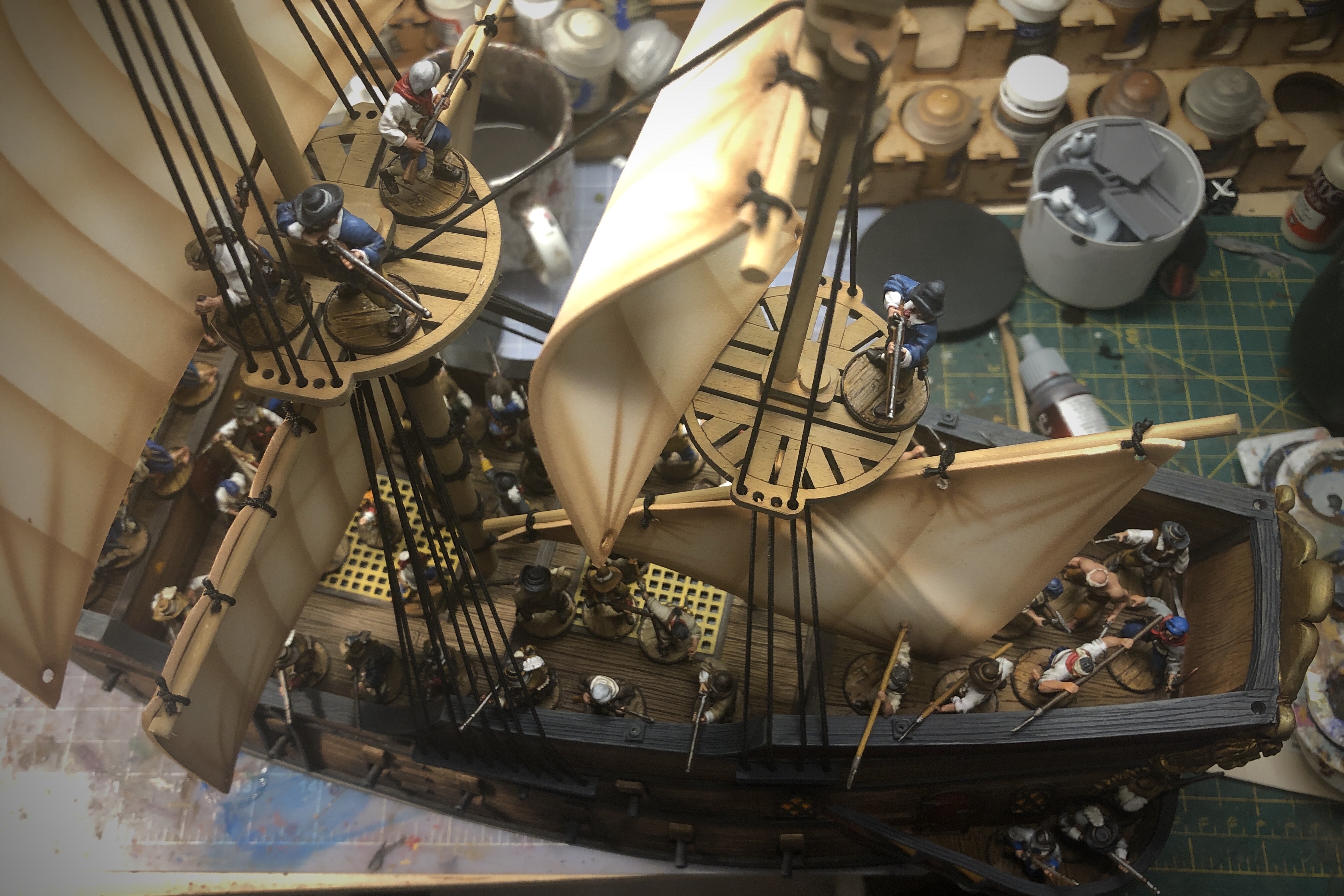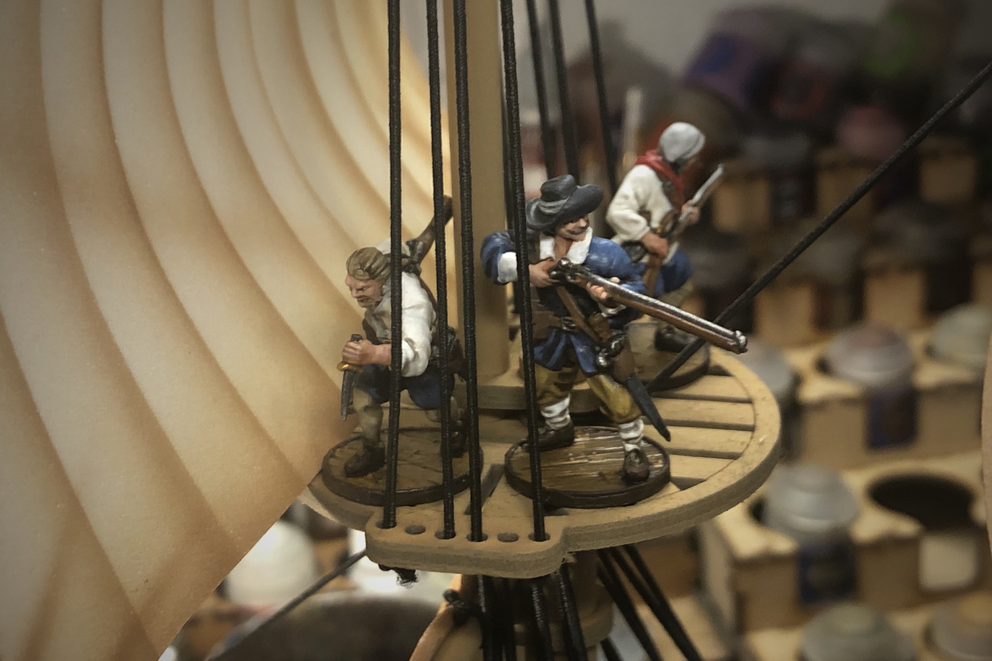 The main mast fighting top is very large. It would be easy to fit 5-6 models up there if the rules allowed it.