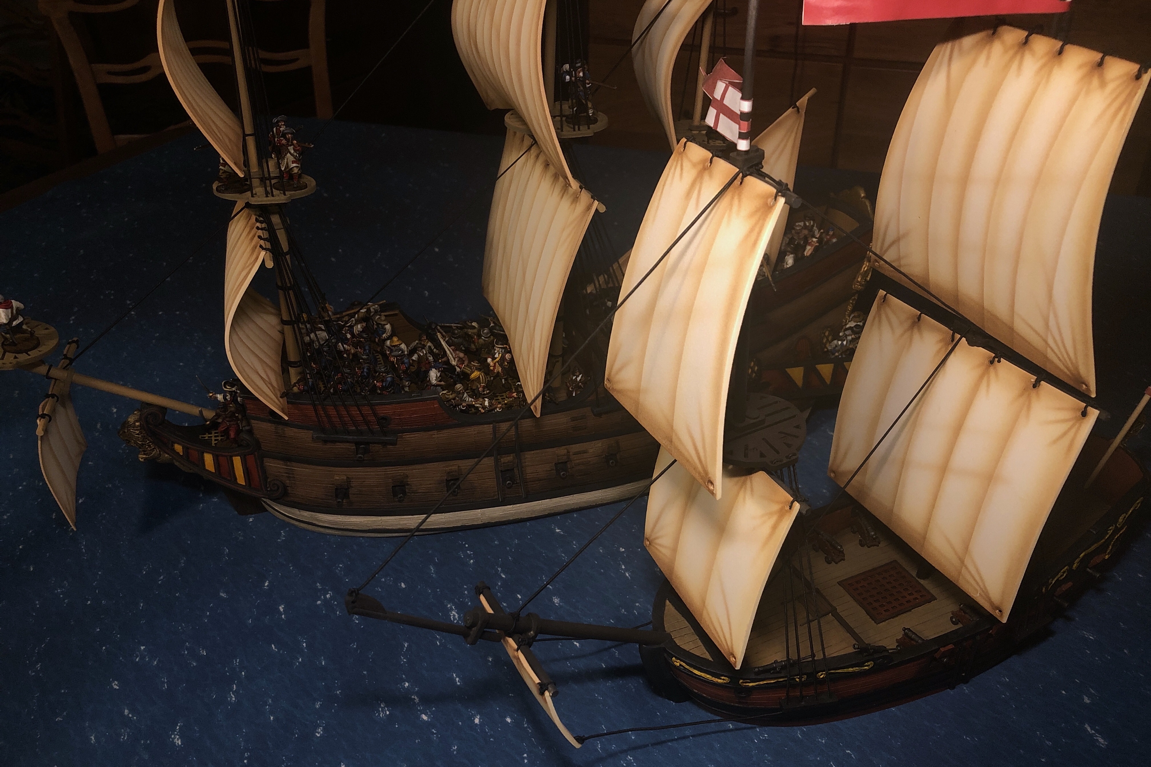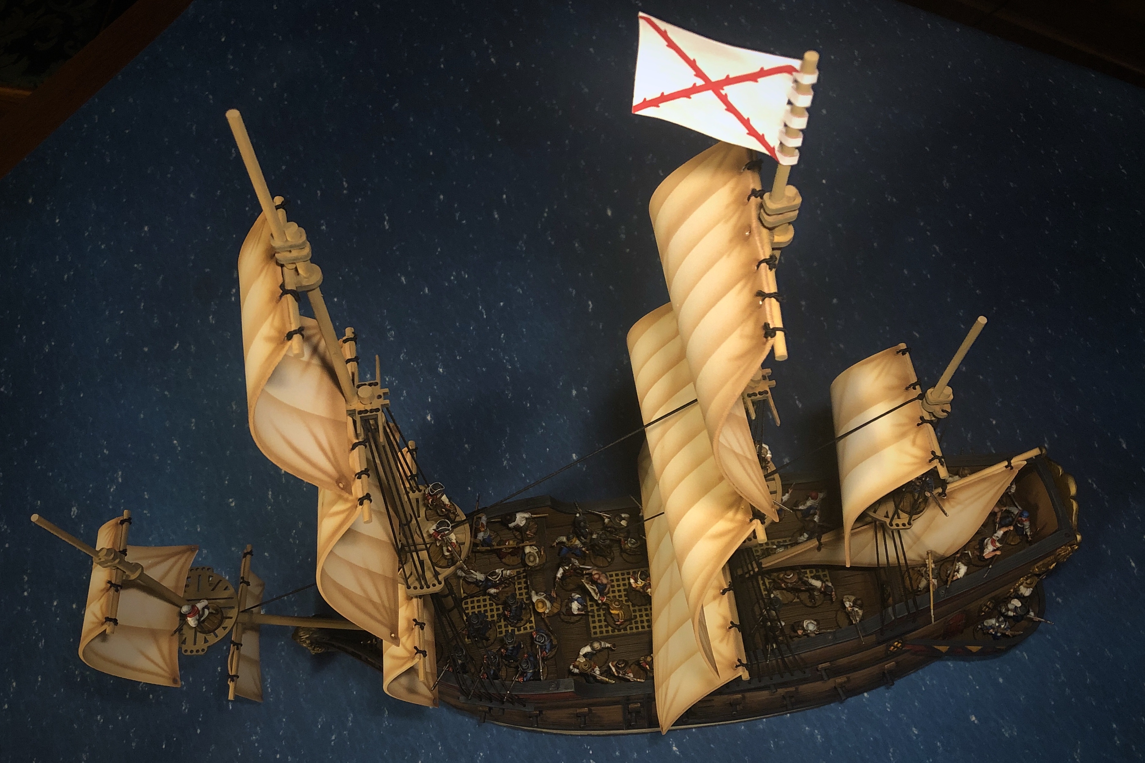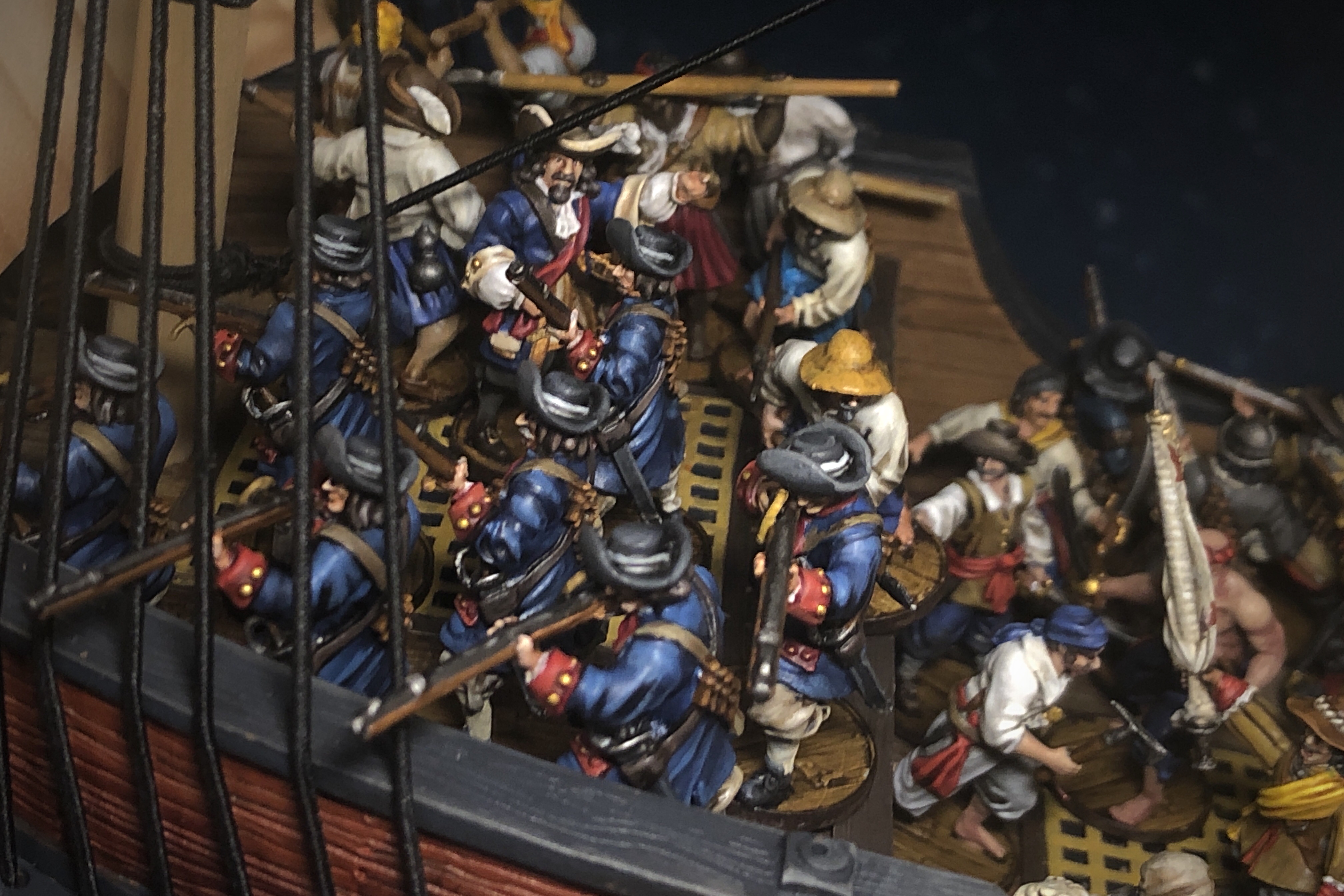 The main mast fighting top is very large. It would be easy to fit 5-6 models up there if the rules allowed it.