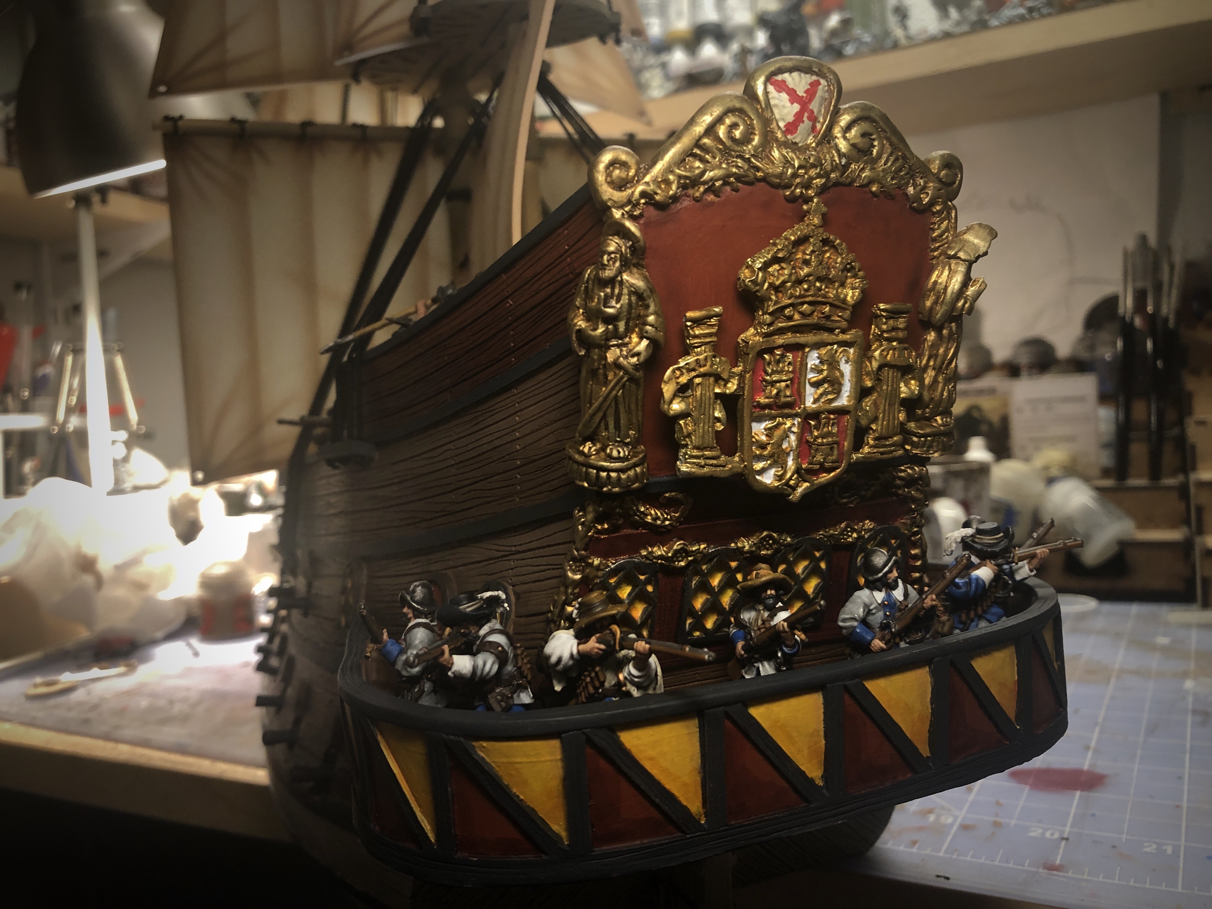 I decided to go full Catholic and used all the Spanish looking bits for the stern. I ran into an issue with the coat of arms. The back wasn’t flat and even after sanding it a good bit and trying to re-shape it with hot water, I couldn’t get it to sit flat against the stern so I just have stuck there temporarily with sticky tack.