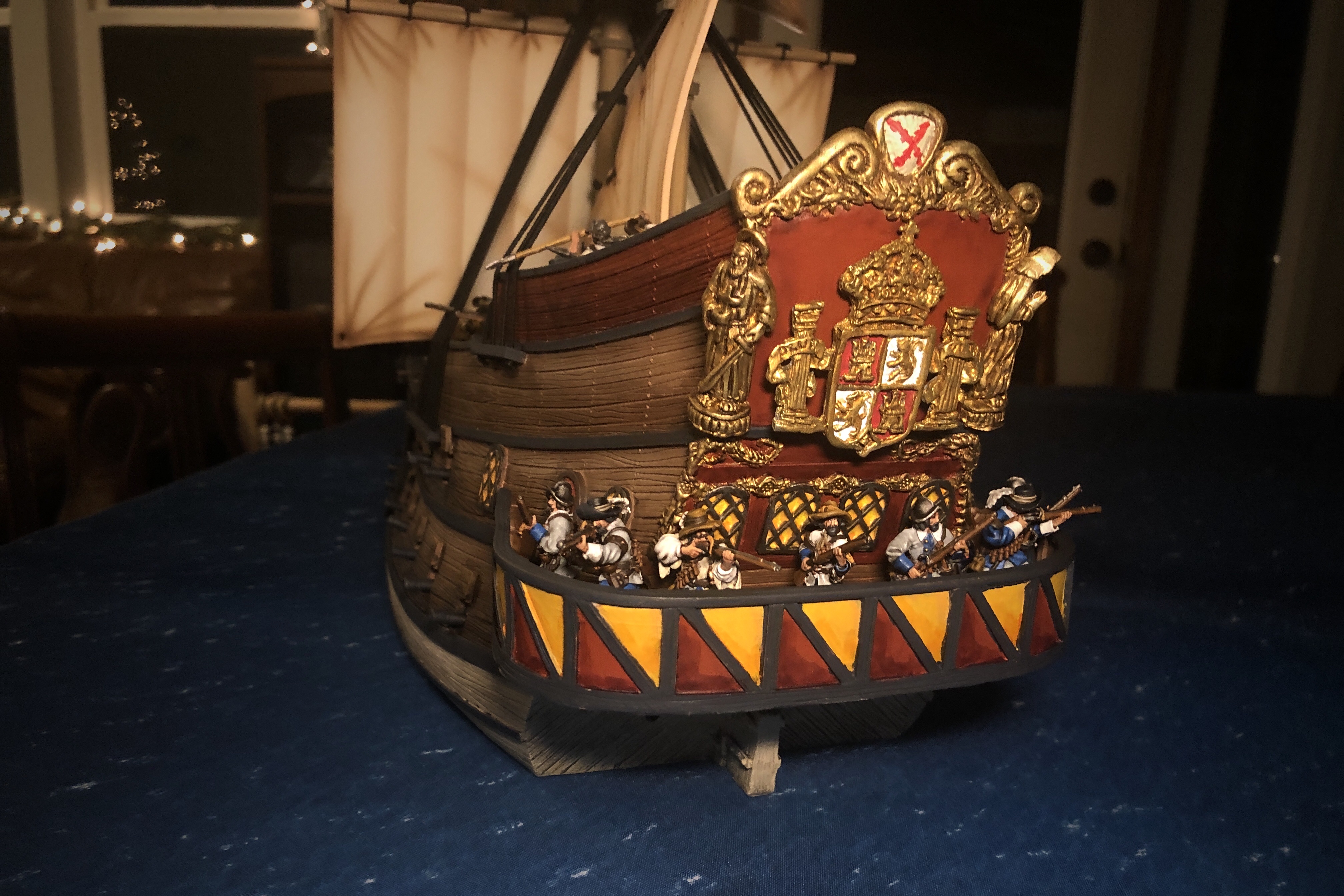 Right now the coat of arms is only held in place with sticky tack but I plan to install magnets on the ship and the coat of arms and make a couple more options of decorations to put back there so I can vary the ship a little. I also want to paint up two lanterns for the back of the ship.