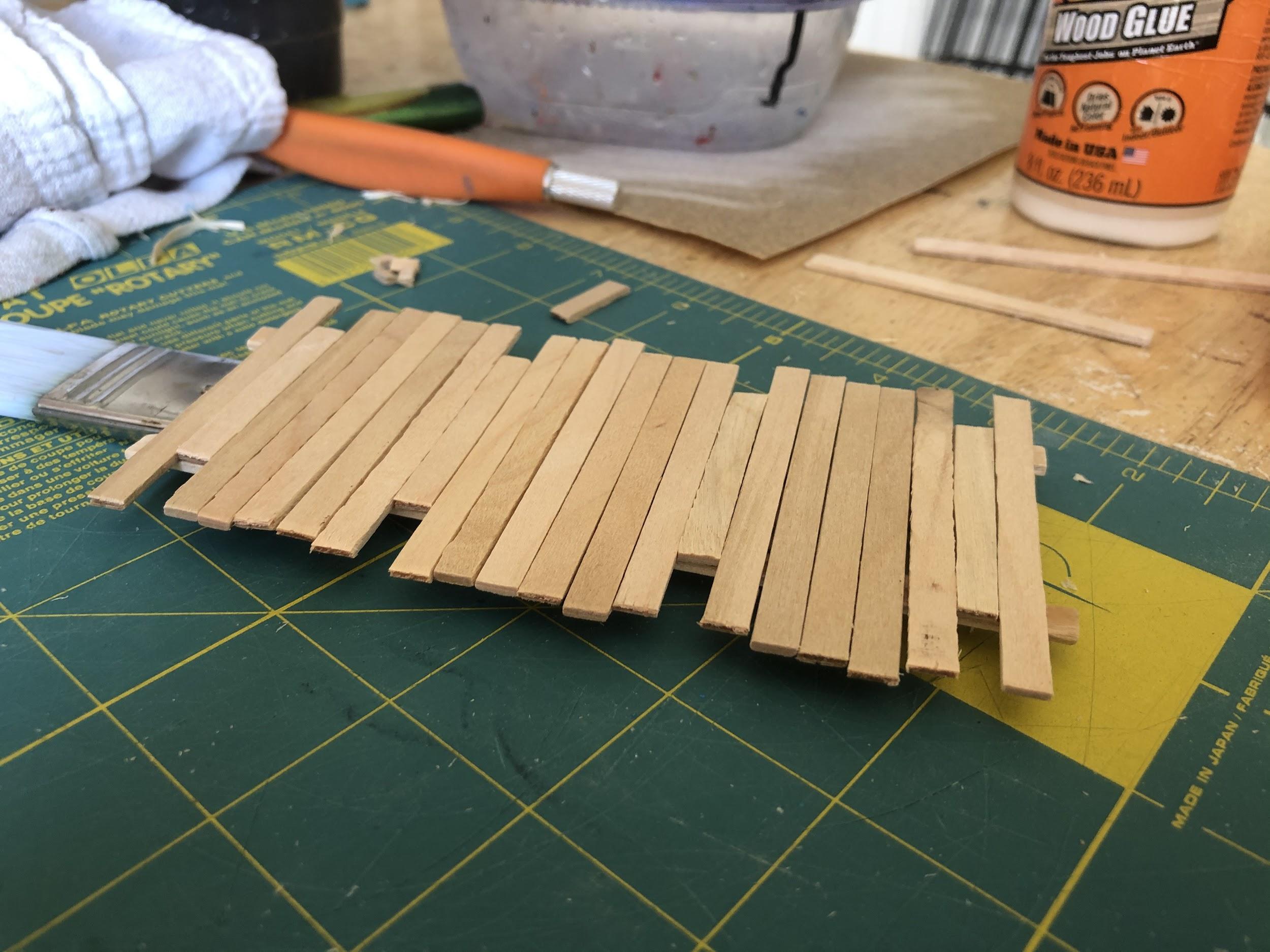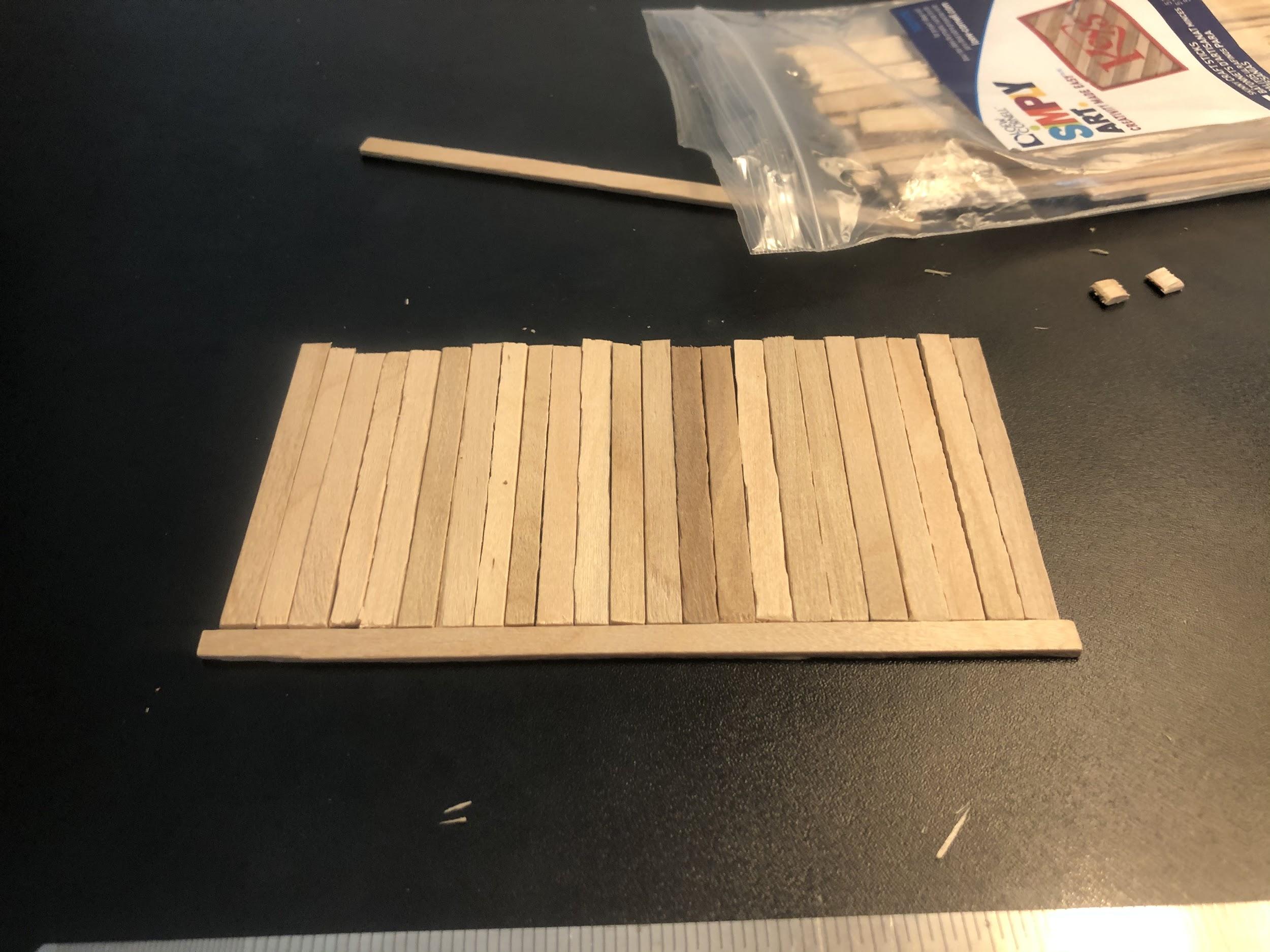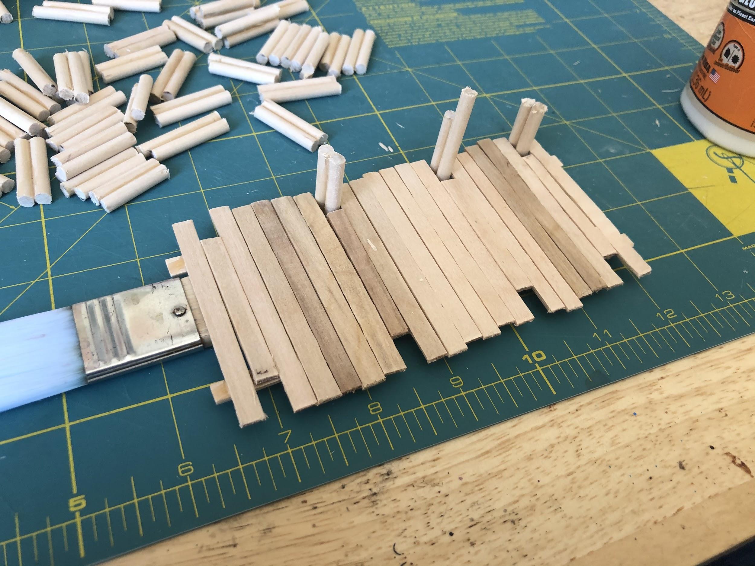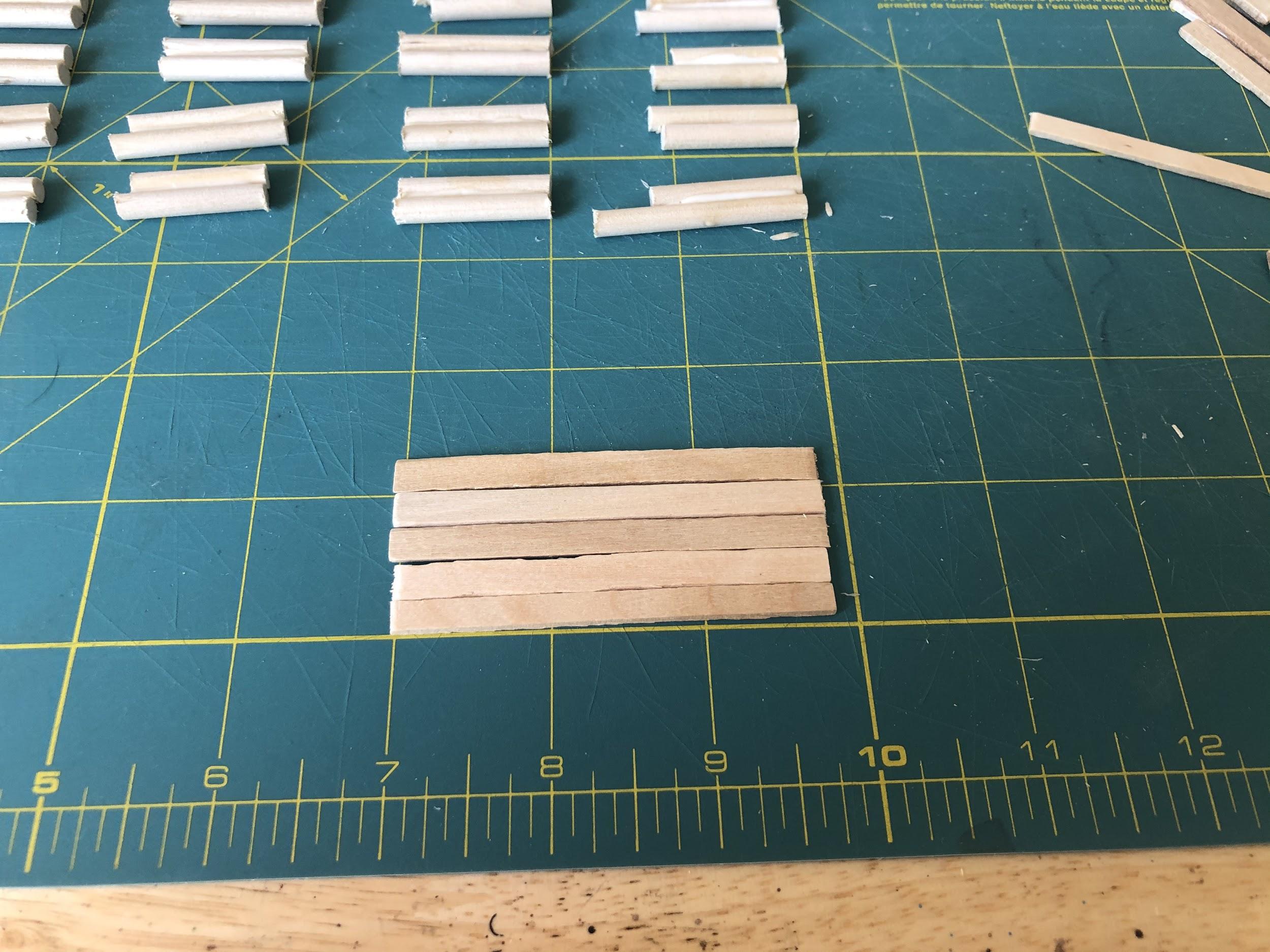 Cut sticks in half until you have about five of them. In period images the gangplanks seemed very narrow, about the width of a man’s shoulders, but I wanted to make it wider to make it less likely a metal model will tip off. Next, cut a stick to the width of the five boards you laid out.