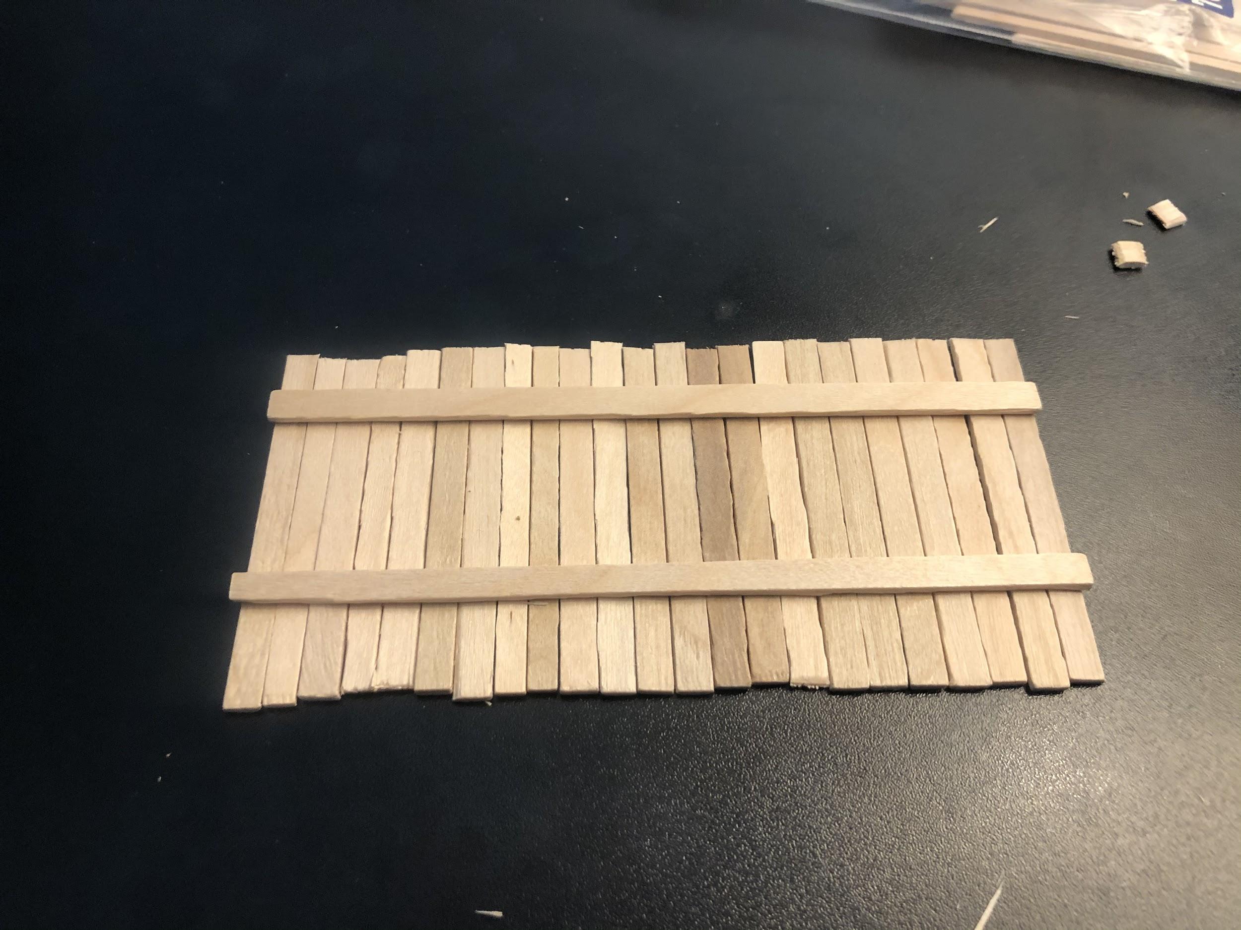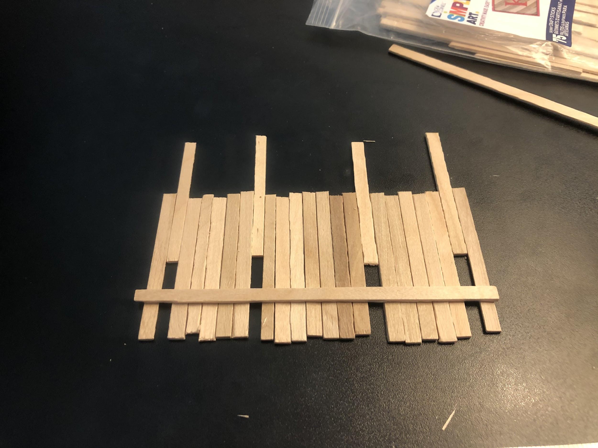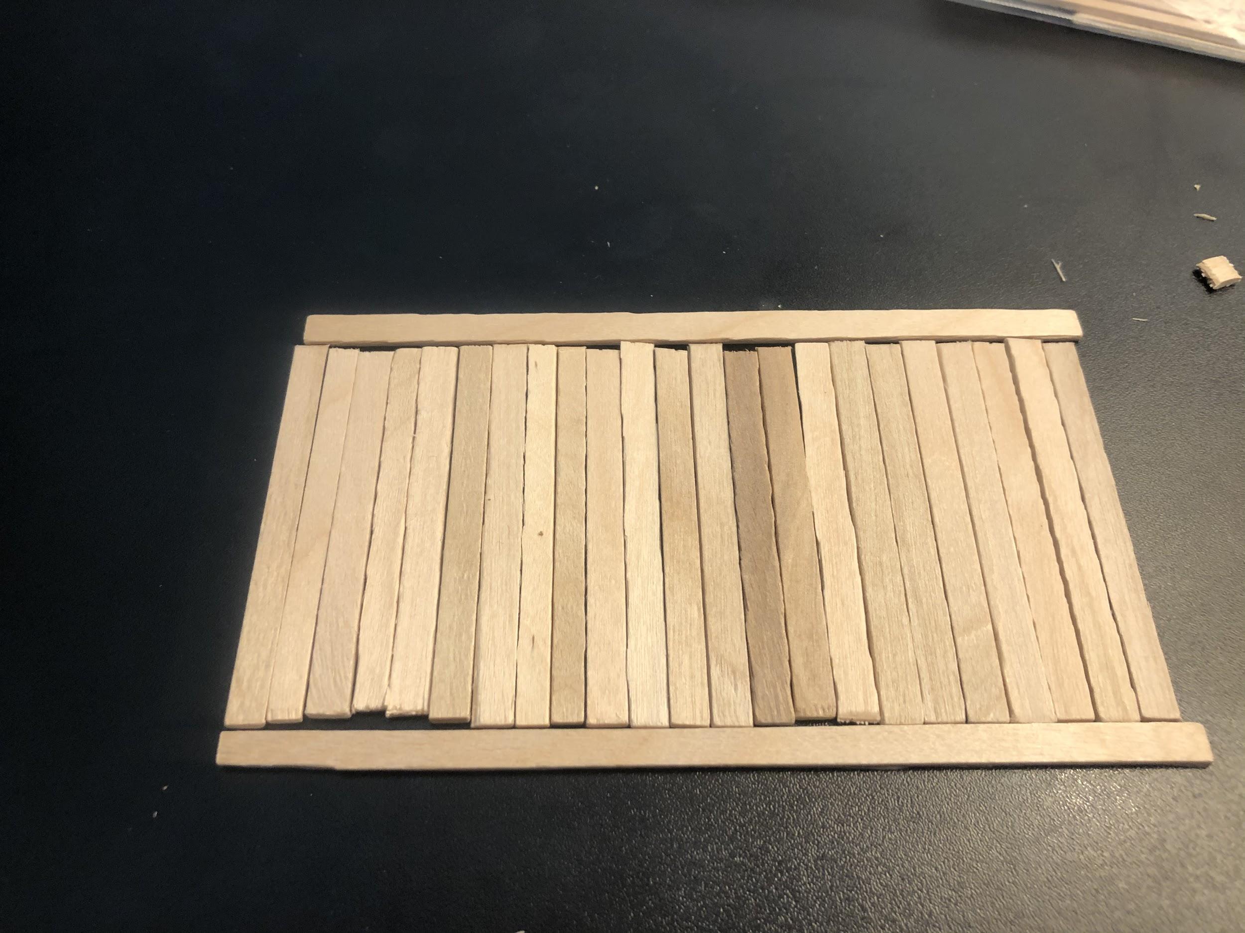 Cut sticks in half until you have about five of them. In period images the gangplanks seemed very narrow, about the width of a man’s shoulders, but I wanted to make it wider to make it less likely a metal model will tip off. Next, cut a stick to the width of the five boards you laid out.