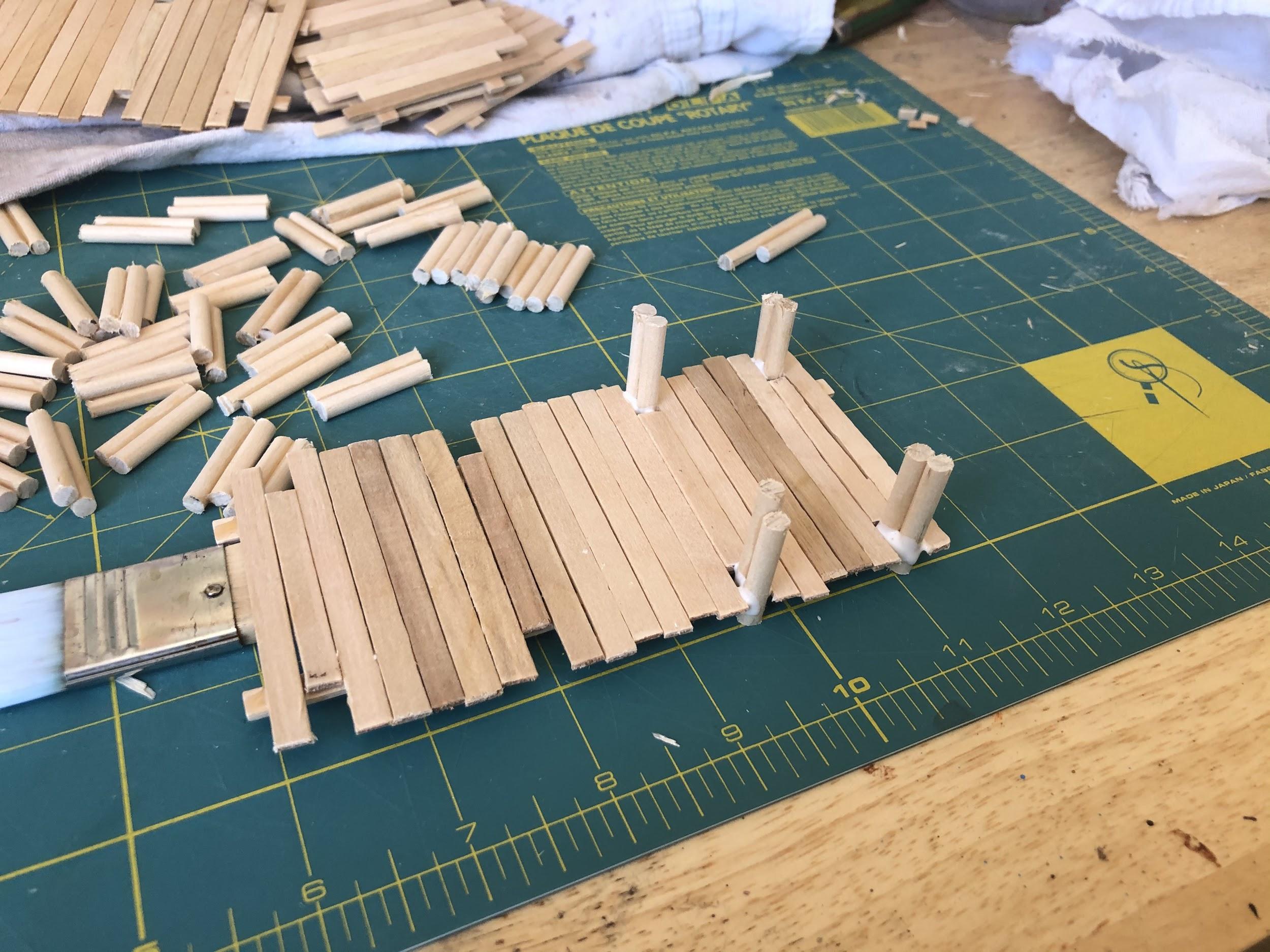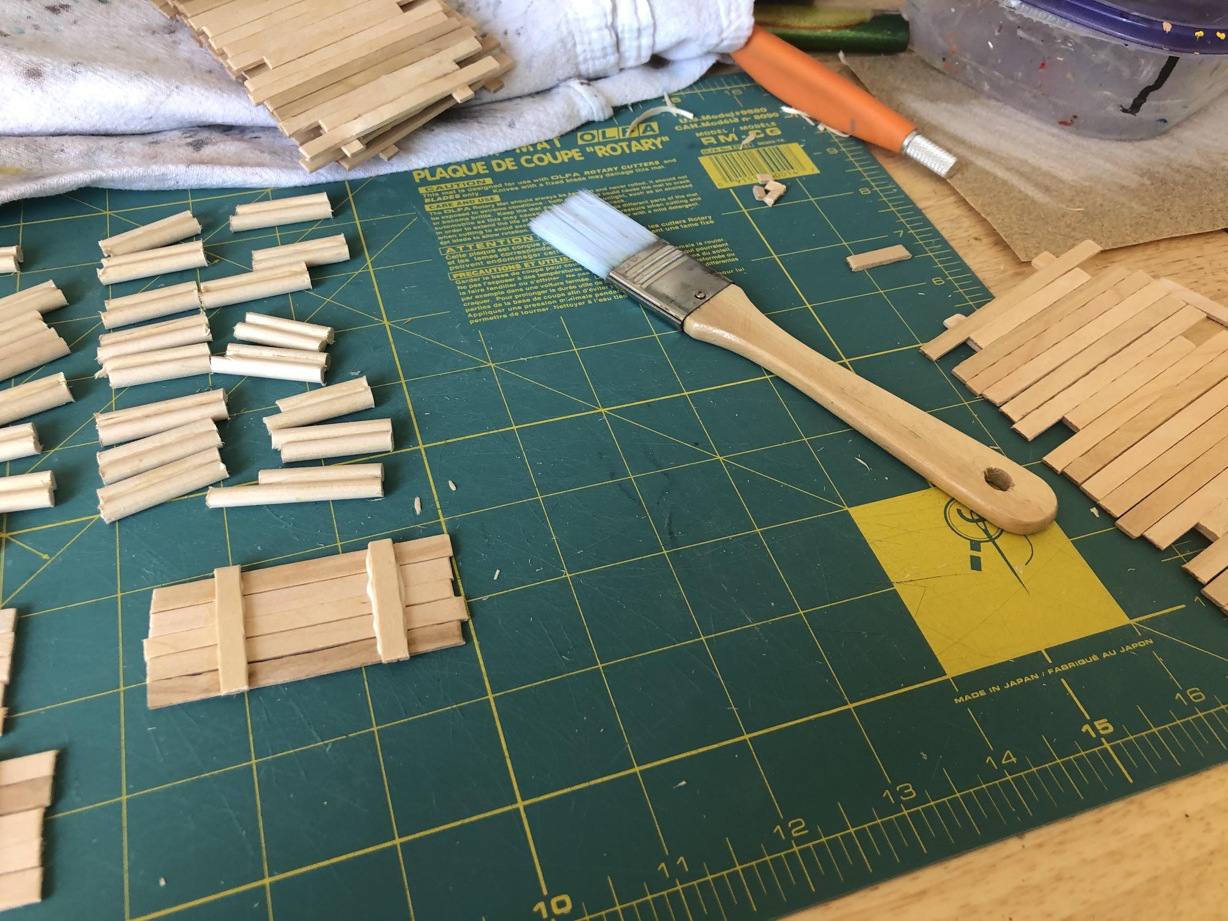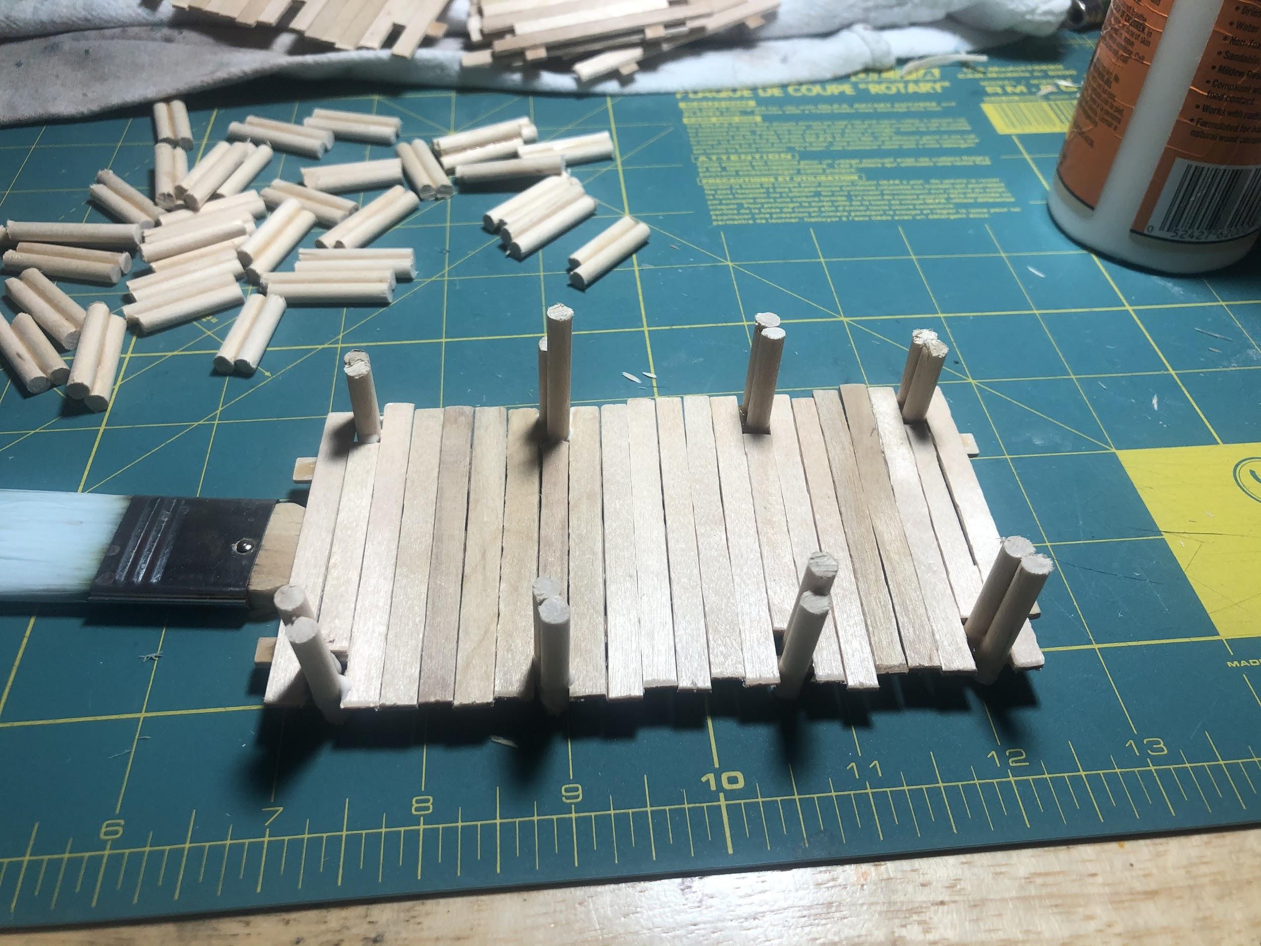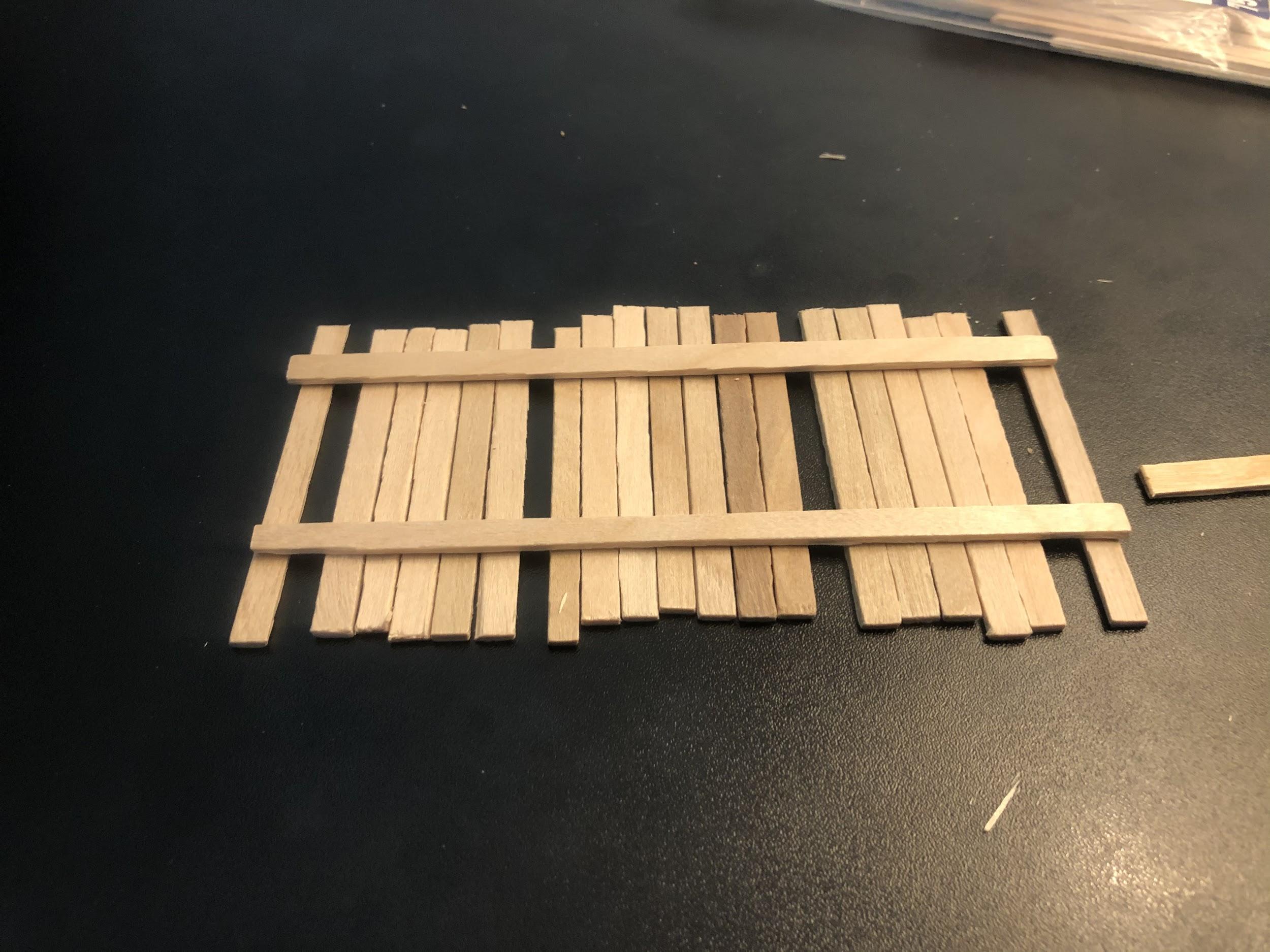 Cut sticks in half until you have about five of them. In period images the gangplanks seemed very narrow, about the width of a man’s shoulders, but I wanted to make it wider to make it less likely a metal model will tip off. Next, cut a stick to the width of the five boards you laid out.